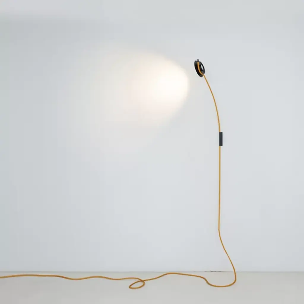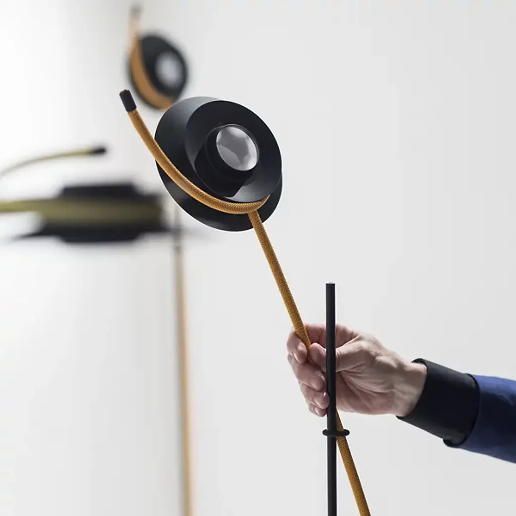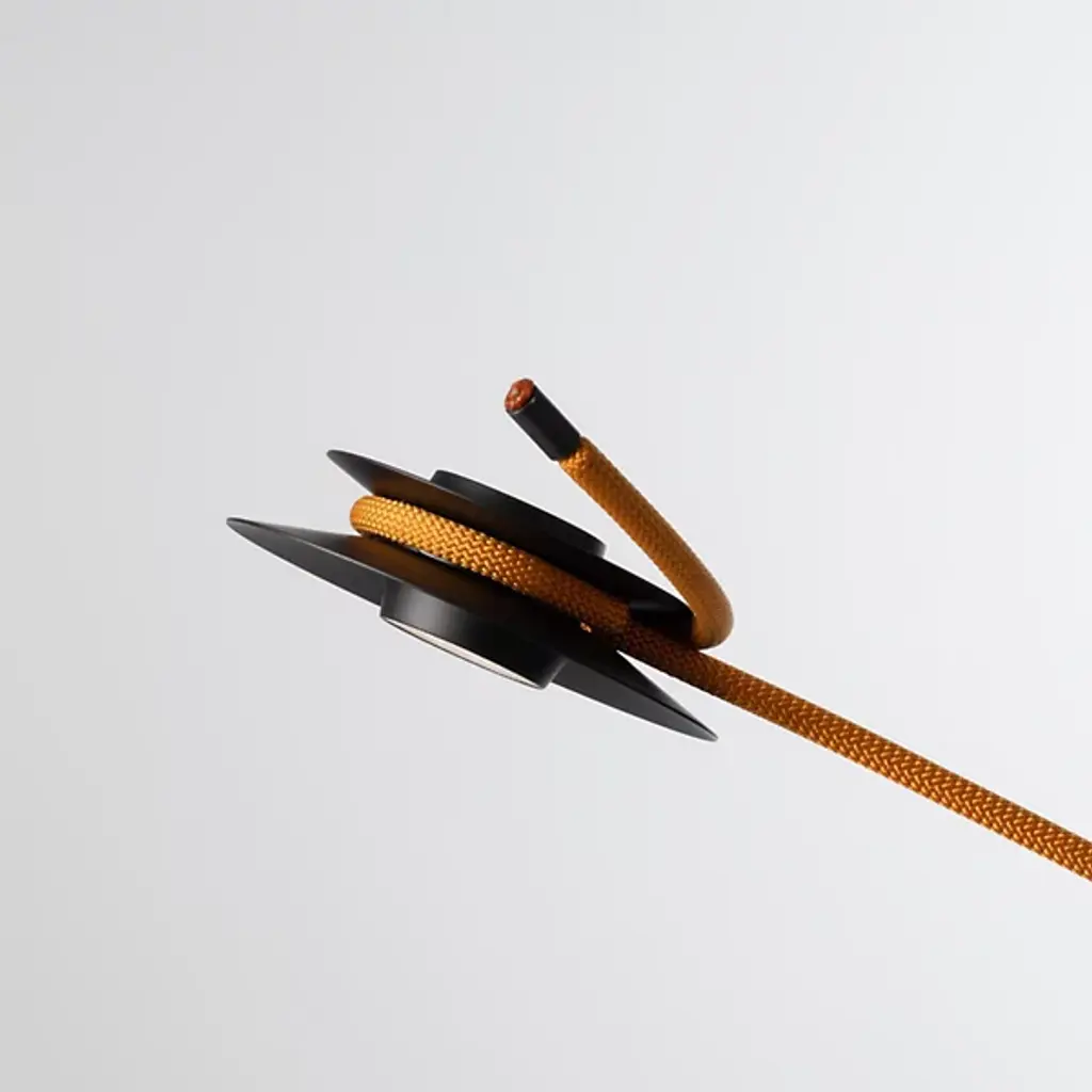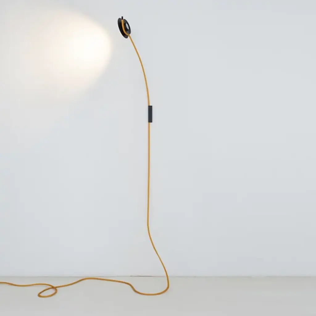 The Ms.Bowjangles LED Wall Sconce from Ingo Maurer adds a charismatic and futuristic presence to indoor walls. Designed by Anna Boch and David Engelhorn, a spool-like lamp head appears to be held up by just a rope, but a slender steel rod inside creates this illusion. The lamp head features an LED light capped by a diffuser, casting soft, warm light throughout the space. With an adjustable light and a dimmer at the end of the “tail,” this product can create both focused and ambient light.