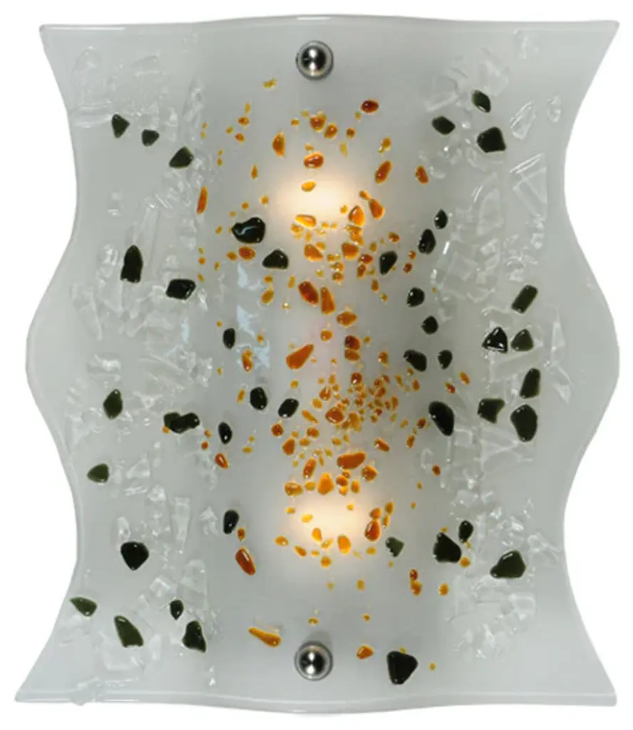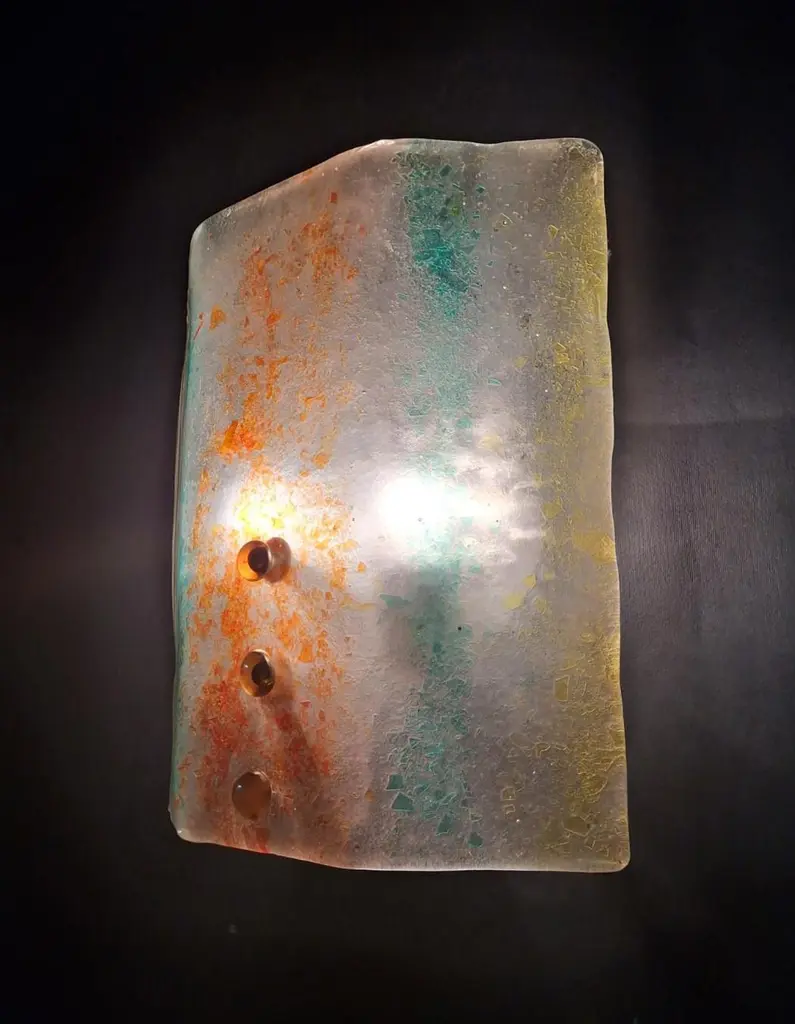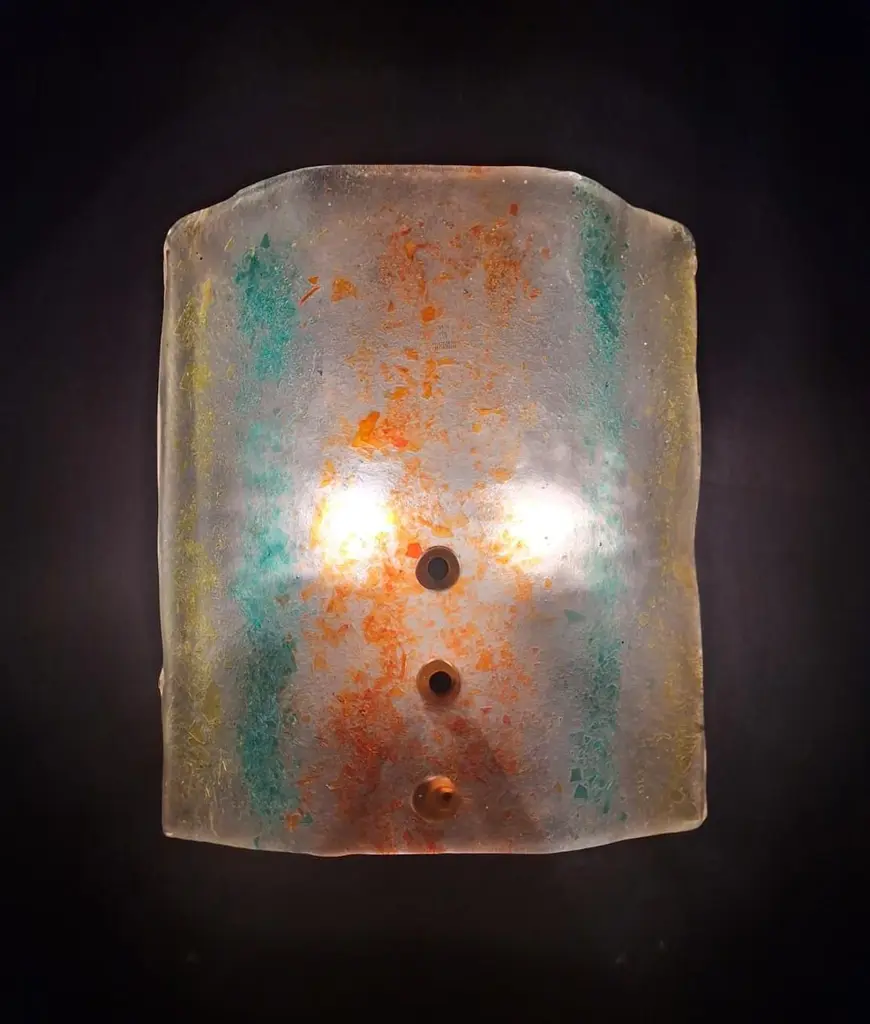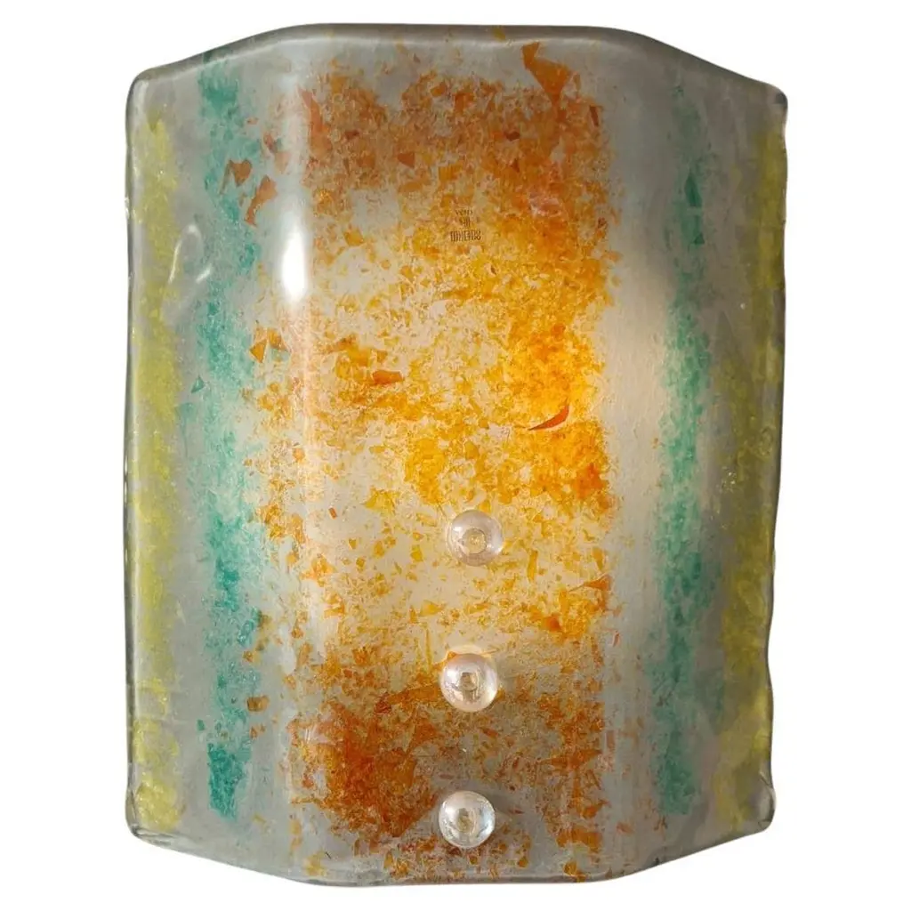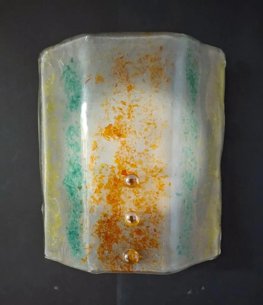 Vintage mid-century Italian wall light with a Murano glass shade in yellow red and green colors, mounted on white metal frame and secured with amber glass screws / Made in Italy in the style of Venini, circa 1960sMeasures: height 12 inches, width 10 inches, depth 4 inches2 lights / E26 or E27 type / max 60W each5 available in stock in Italy, price listed is for each itemOrder reference #: FABIOLTD K134 AMBER