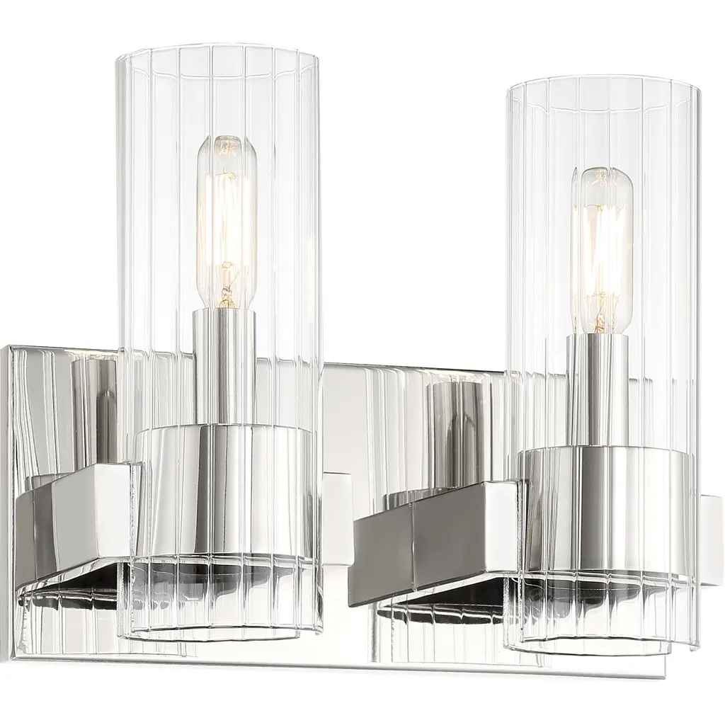 The Muralla Optique Wall Sconce from Niche delights, pairing a traditional form with an intricate transitional structure. A Jeremy Pyles design drawing its inspiration from historical castle walls, it uses a conventional stepped steel backplate and angular arm to suspend a downward-facing single-socket lamp inside a clear crystal shade. Two rounded accents add depth to its cylindrical form, while the ambient light broadcast through its translucent walls is enhanced by vertical striations running along its length.
