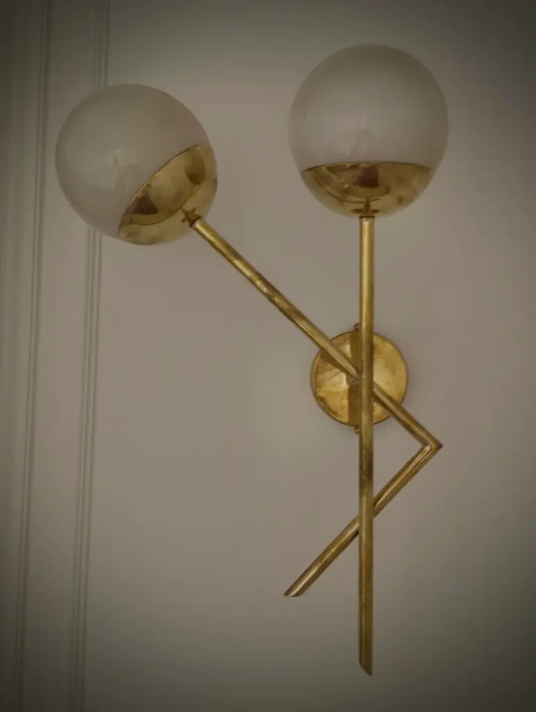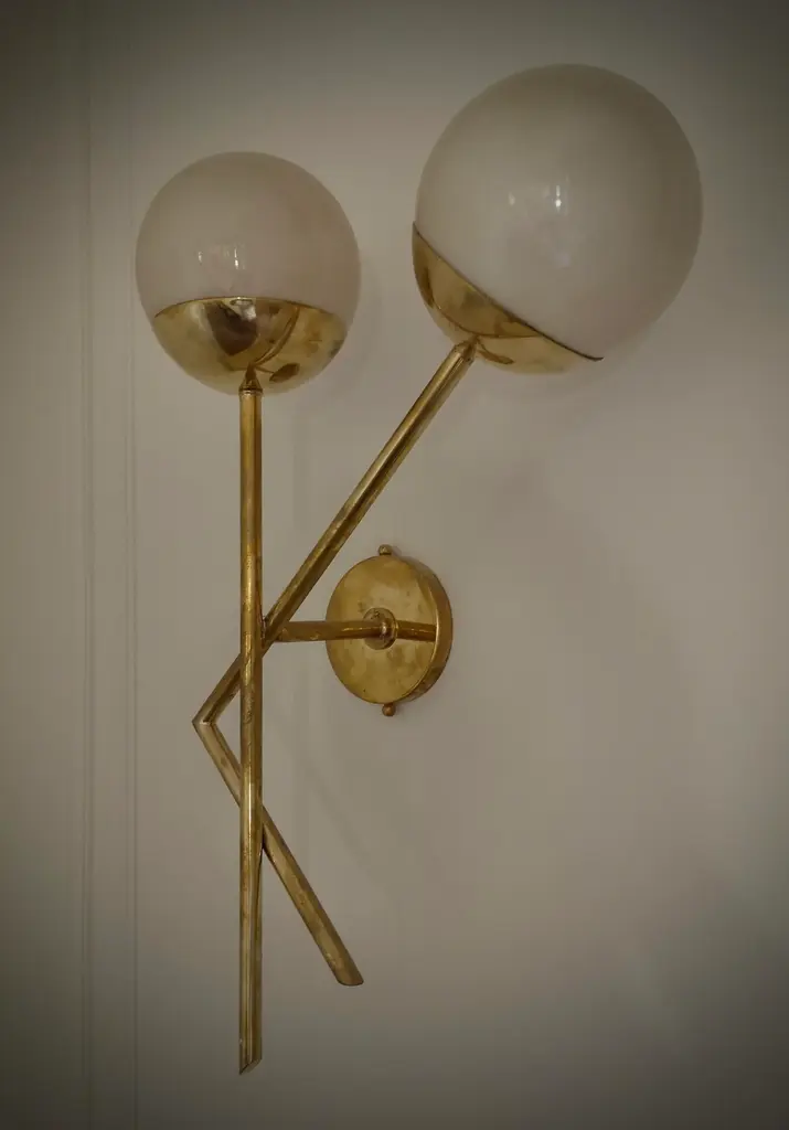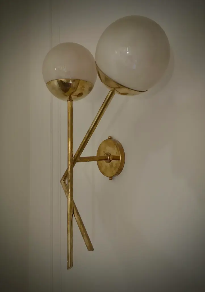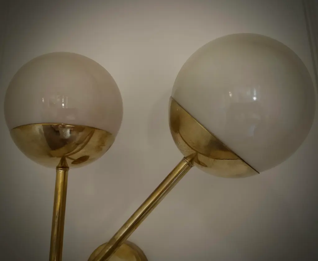 Refined and delicate design for this cream-colored Murano glass wall lamp. The Murano furnaces create an indisputable and timeless design, simple but elegant at the same time. The wall lamps are made with a brass structure that allows the housing of two beautiful cream-colored Murano glass spheres. The design is very clean and simple, but at the same time gives the wall lamp a very refined elegance. Its polished brass frame makes it very rich with a brass undercup that then allows the housing of the spheres. Its wall installation is made possible by a small rosette positioned on the horizontal tube. Refinement and style as is the Murano style of that period, unique pieces of their kind and pieces that always remain precious. When turned on, the lamp is very bright having two bulbs, one for each sphere, it will perfectly illuminate your space. European Plug (up to 250V).The wiring of this item may be original and might need replacement, if not specified otherwise.