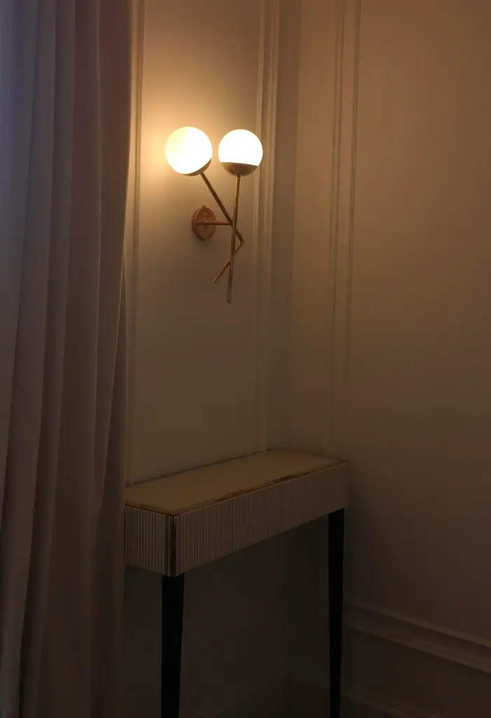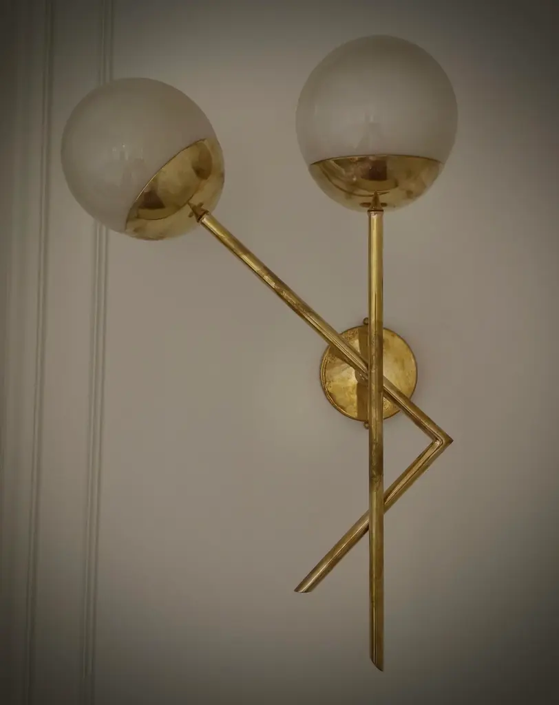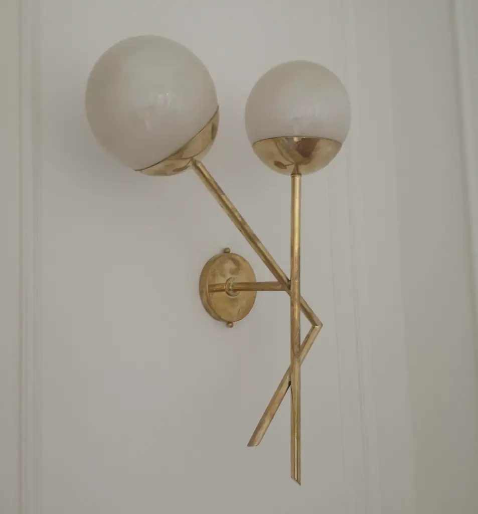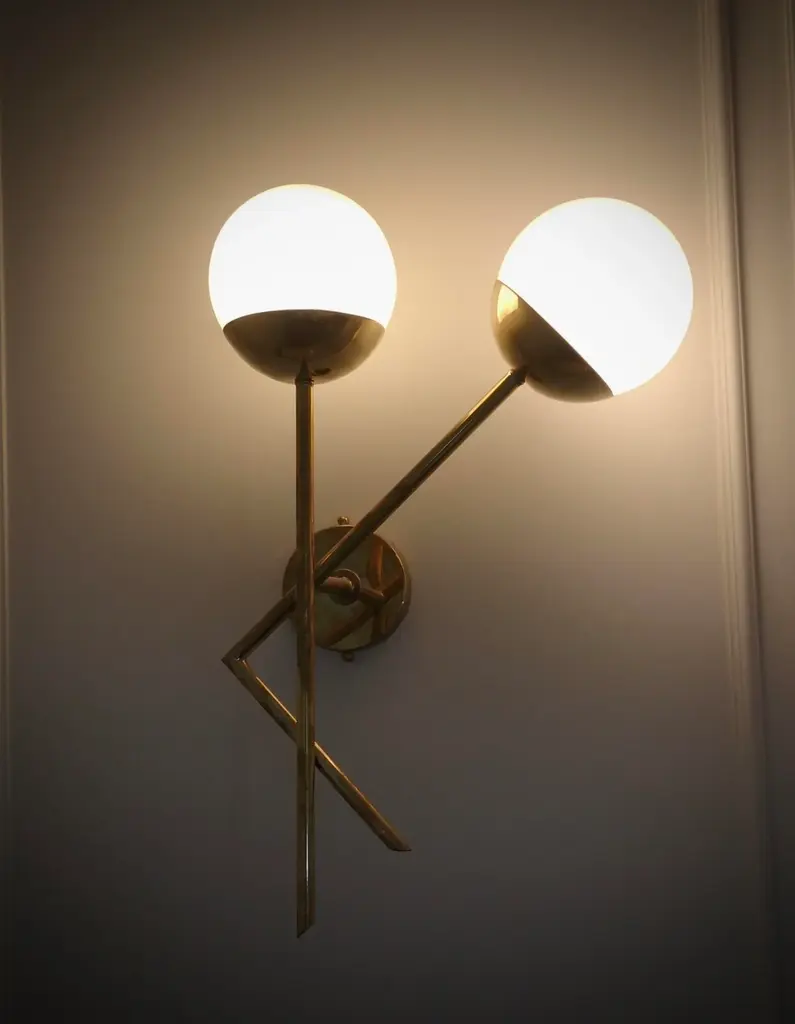Refined and delicate design for this cream-colored Murano glass wall lamp. The Murano furnaces create an indisputable and timeless design, simple but elegant at the same time. The wall lamps are made with a brass structure that allows the housing of two beautiful cream-colored Murano glass spheres. The design is very clean and simple, but at the same time gives the wall lamp a very refined elegance. Its polished brass frame makes it very rich with a brass undercup that then allows the housing of the spheres. Its wall installation is made possible by a small rosette positioned on the horizontal tube. Refinement and style as is the Murano style of that period, unique pieces of their kind and pieces that always remain precious. When turned on, the lamp is very bright having two bulbs, one for each sphere, it will perfectly illuminate your space. European Plug (up to 250V).The wiring of this item may be original and might need replacement, if not specified otherwise.