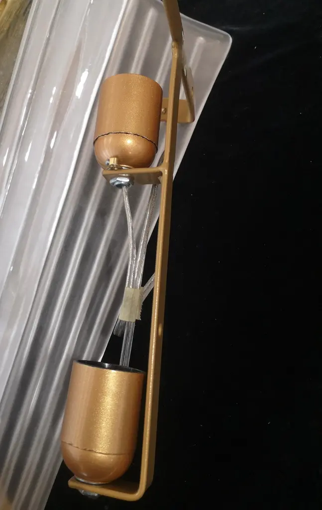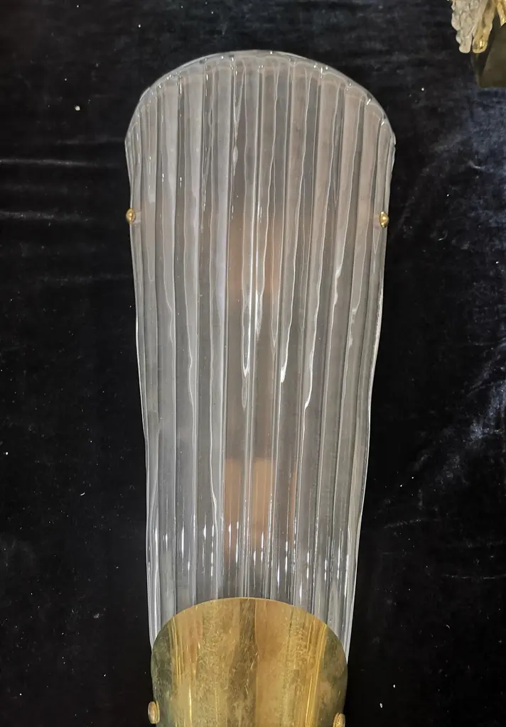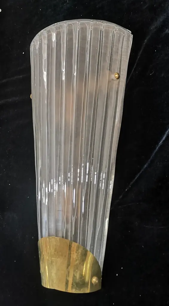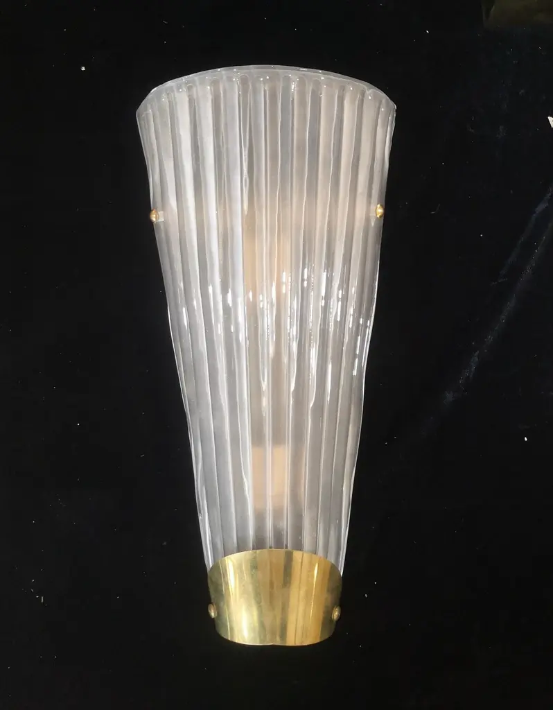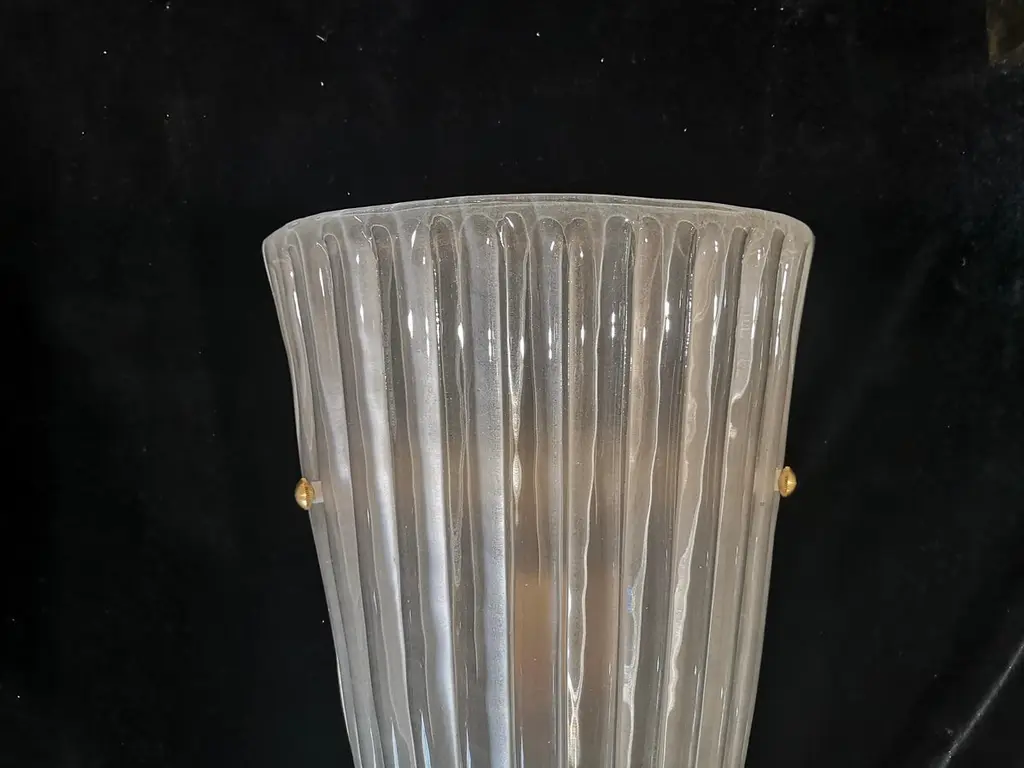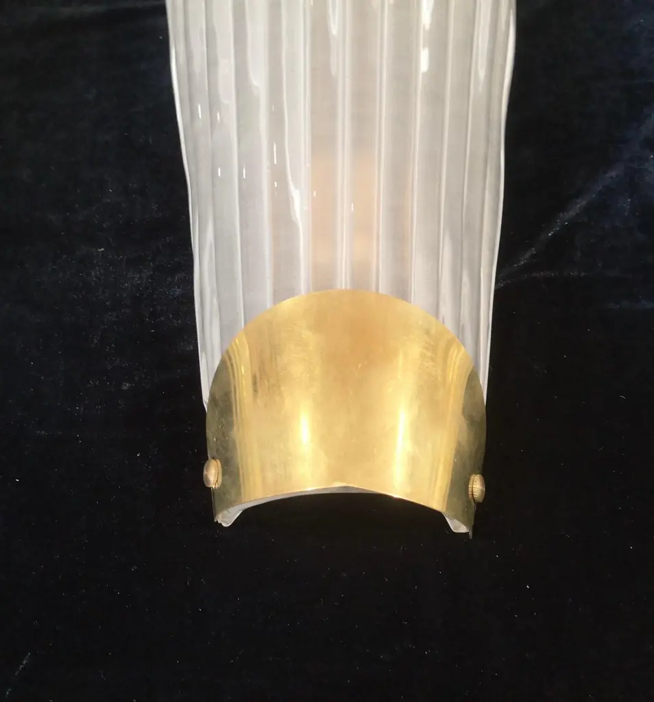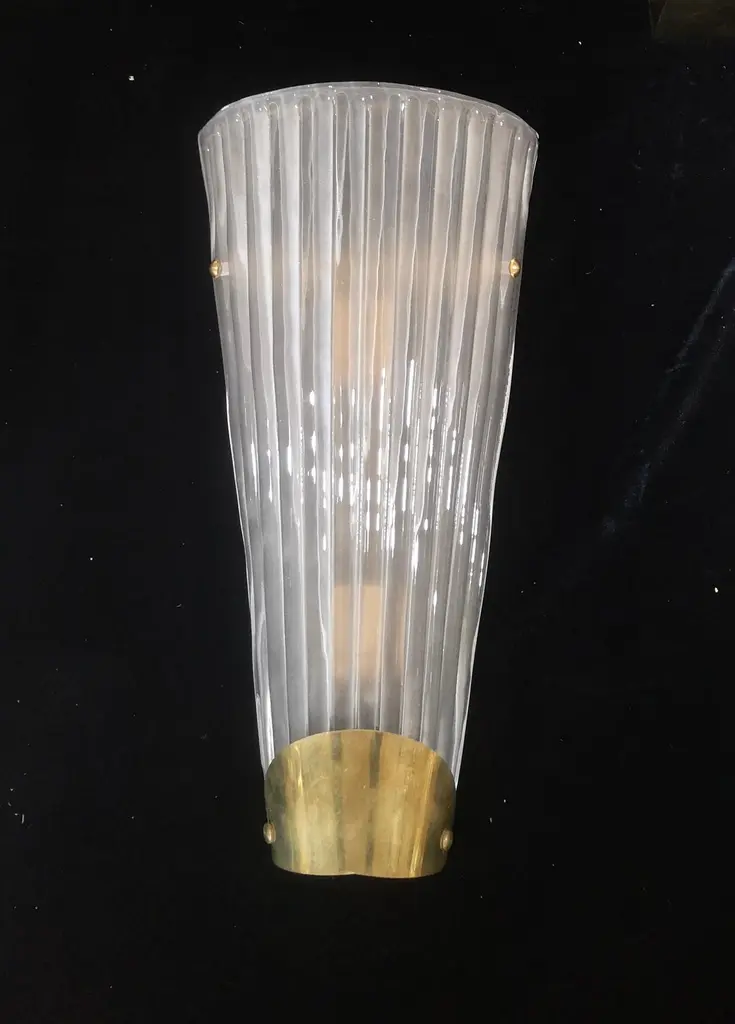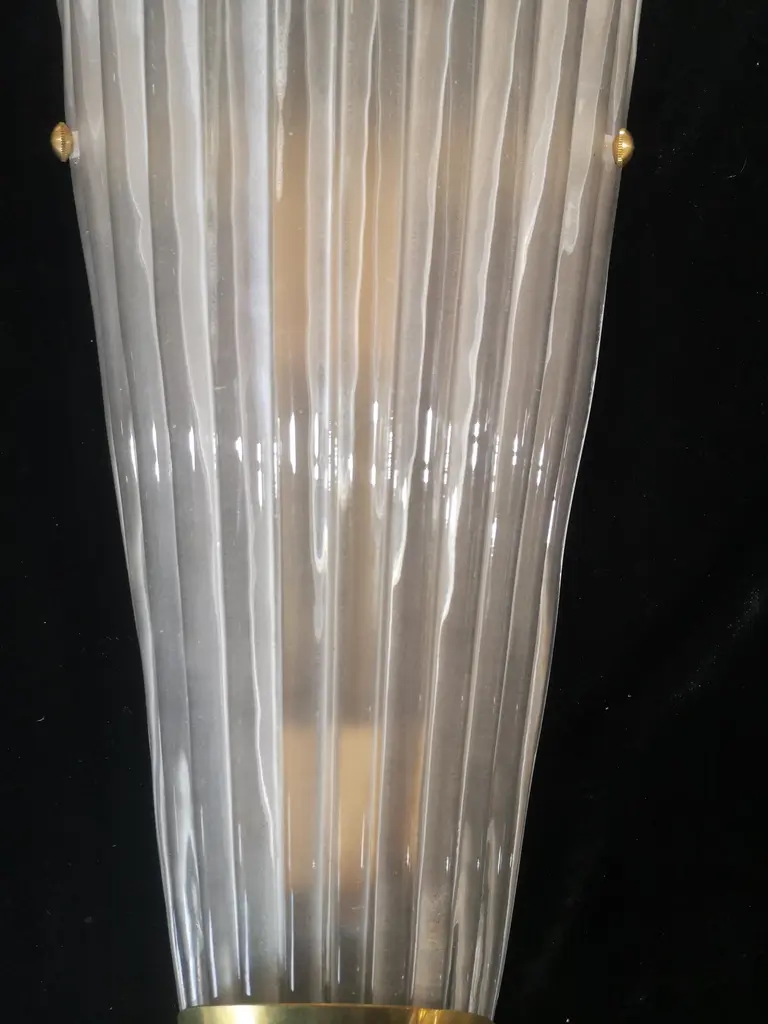 Beautiful assembly for this Murano glass applique. A very particular and rare glass to find, a transparent effect, sandblasted and etched glass; classic Murano style.The applique is composed of a beautiful ribbed and curved glass to form a semi cylinder. The glass has been sandblasted and etched so that it takes on an ice white color, very beautiful and strong. At the base of the curve there is a brass moulding, which makes the applique even more beautiful in its design, it is fixed by two brass screws. The structure to which the glass is attached is gold and the two lamp holders are made in brass color. Refinement and style as it is in the style of Murano glass factories, unique pieces of their kind and pieces that always remain precious. When turned on, the applique is very bright having two bulbs with classical lamp holders, it will perfectly illuminate your home.