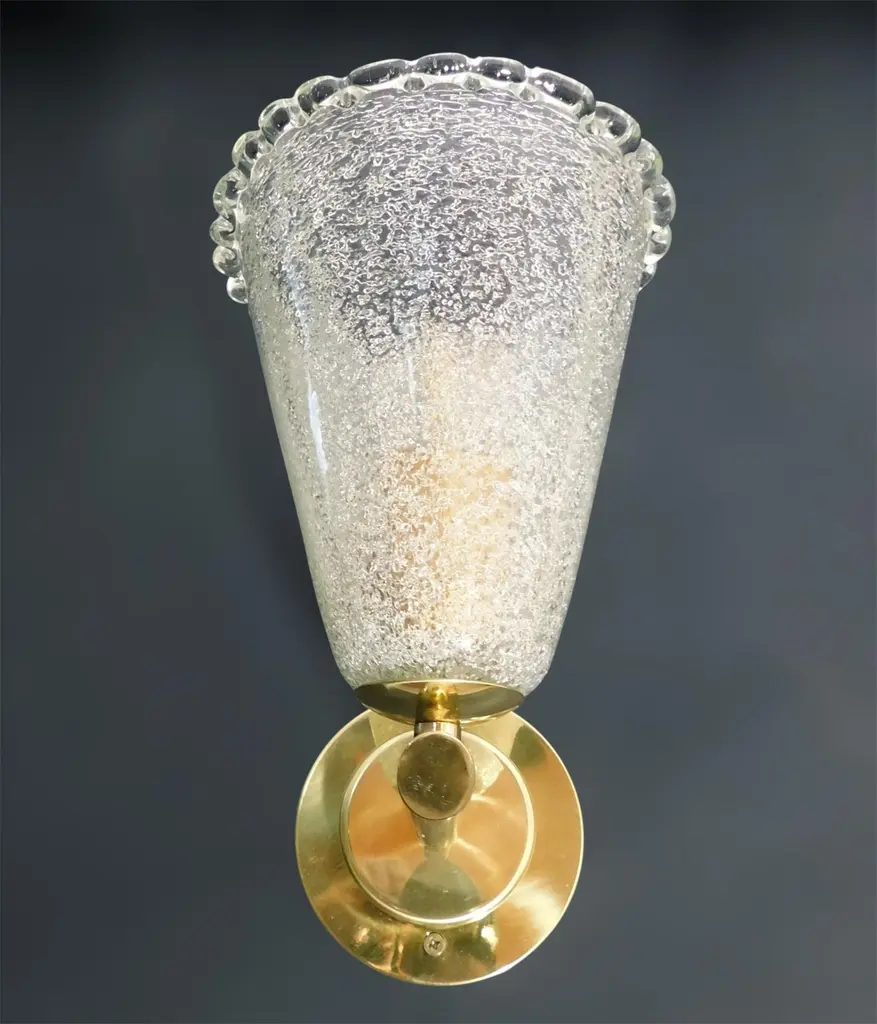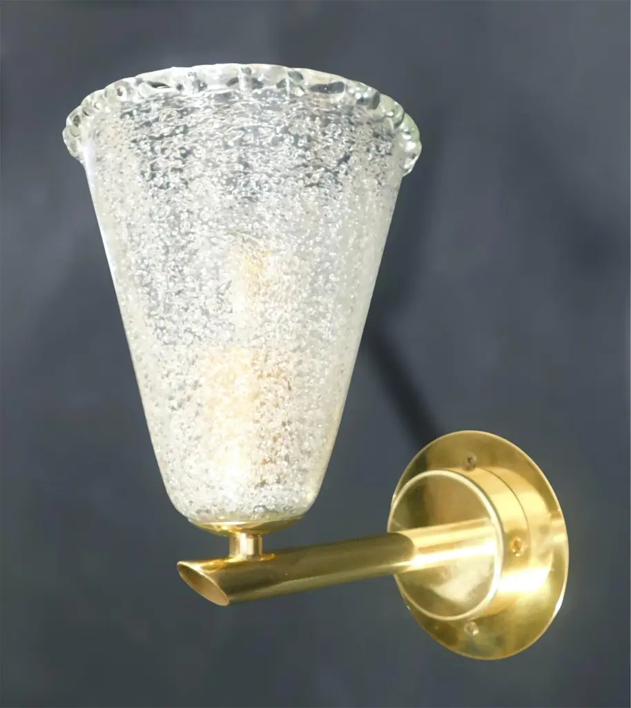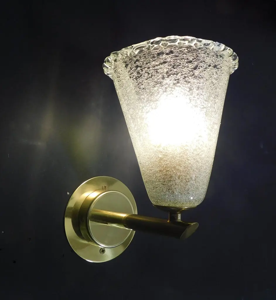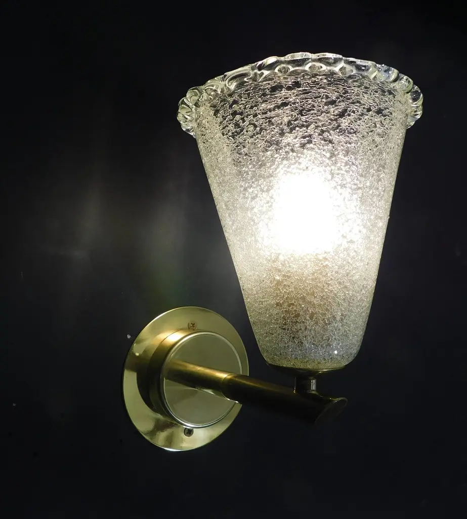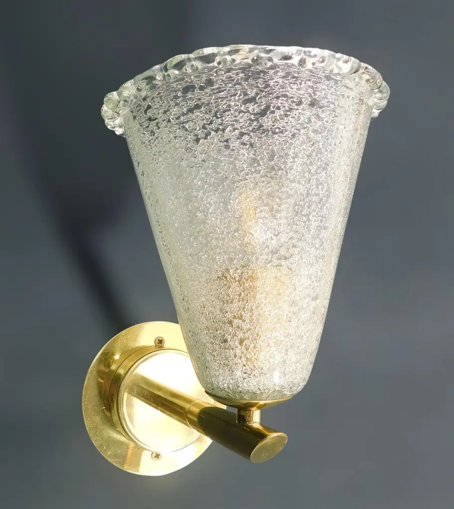 Vintage Italian wall light with clear textured cone shaped Murano glass cup, mounted on brass frames / Made in Italy by Barovier e Toso, circa 1950sOriginal maker's mark on the frameMeasures: Height 9.5 inches, width 6.5 inches, depth 9 inches1 light / E26 or E27 type / max 60W3 available in stock in Italy, price listed is for each itemOrder reference #: FABIOLTD L49
