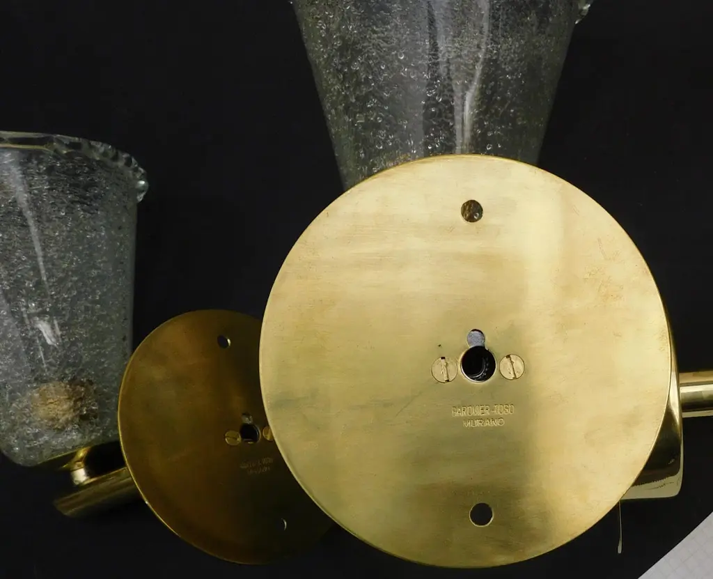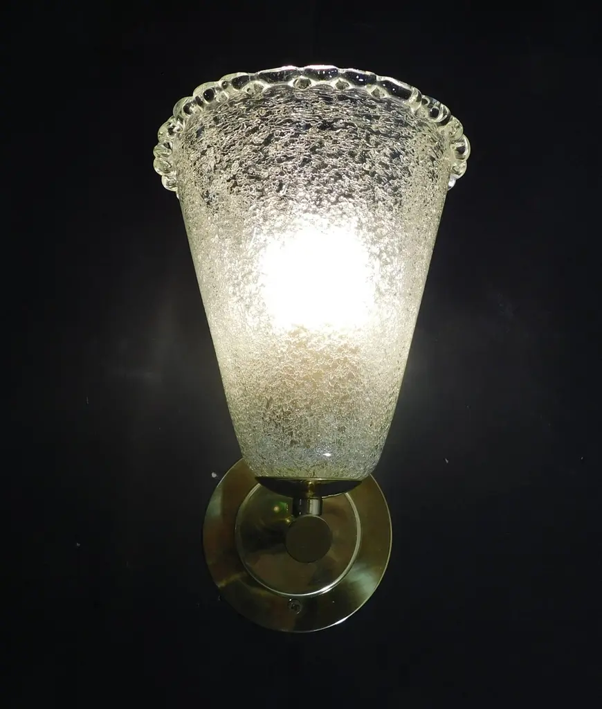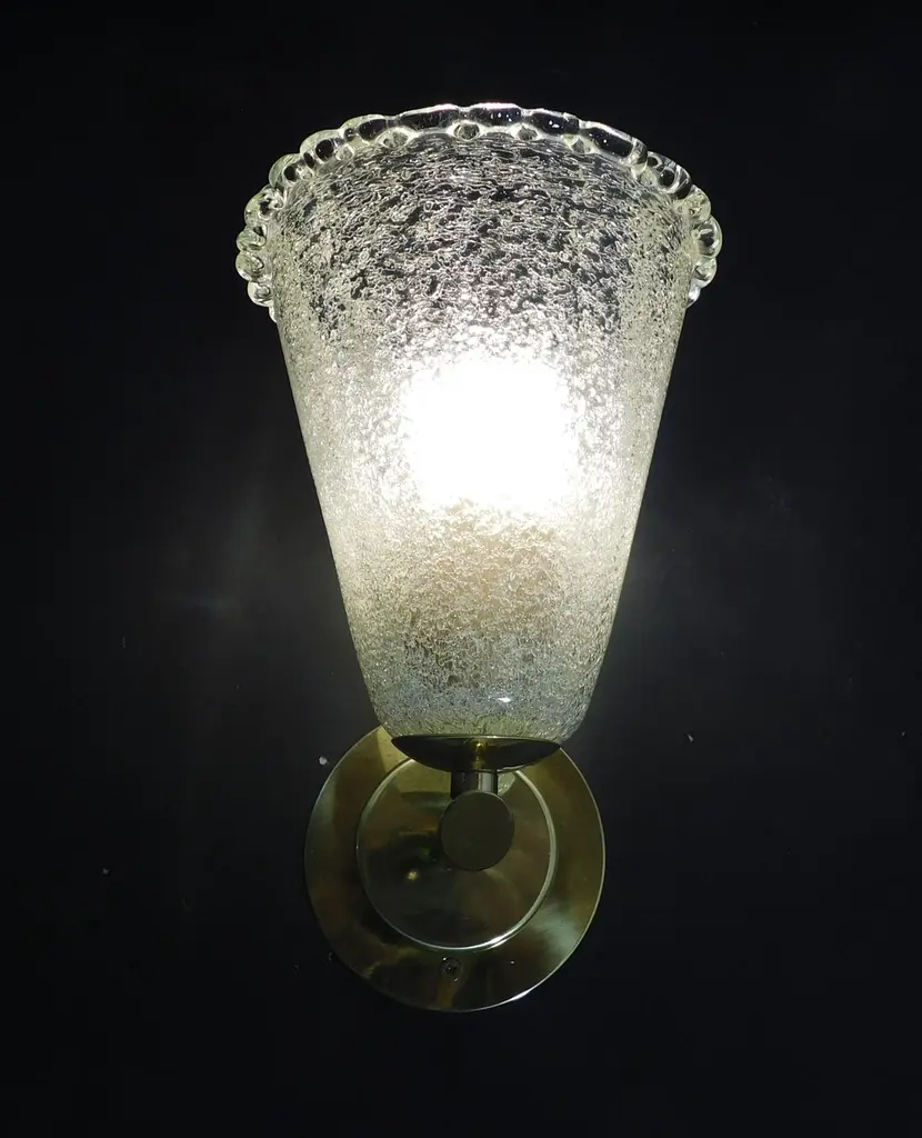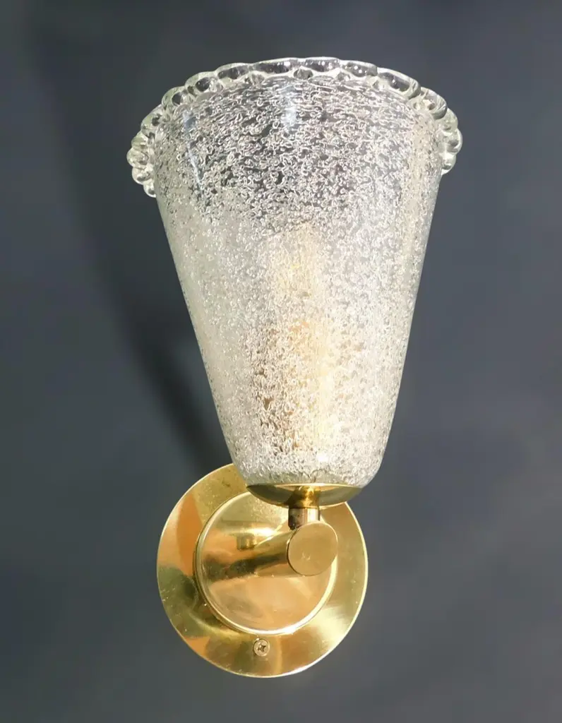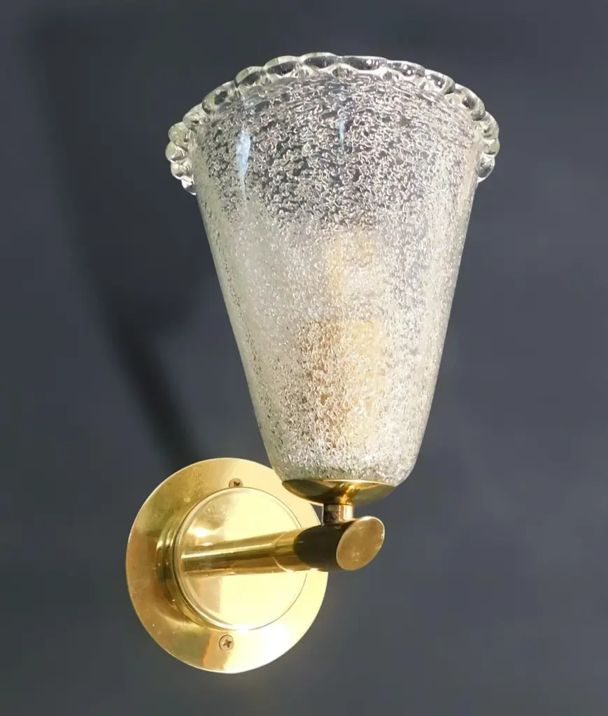 Vintage Italian wall light with clear textured cone shaped Murano glass cup, mounted on brass frames / Made in Italy by Barovier e Toso, circa 1950sOriginal maker's mark on the frameMeasures: Height 9.5 inches, width 6.5 inches, depth 9 inches1 light / E26 or E27 type / max 60W3 available in stock in Italy, price listed is for each itemOrder reference #: FABIOLTD L49