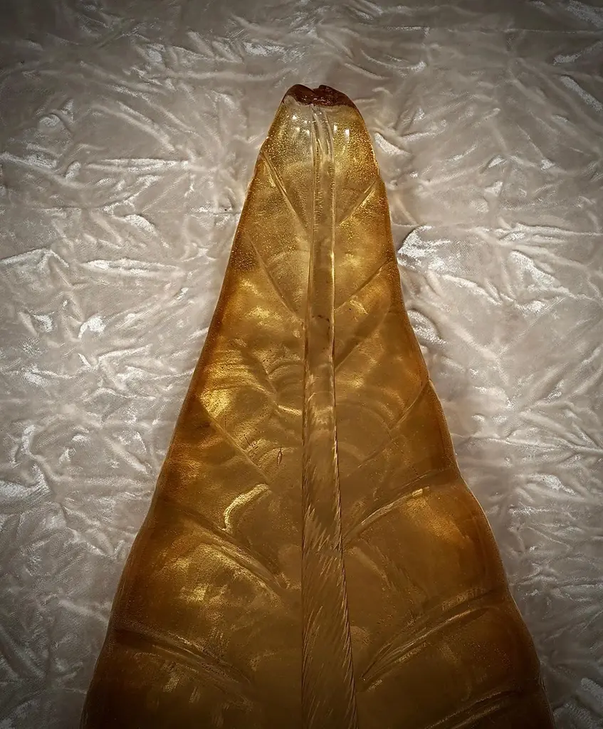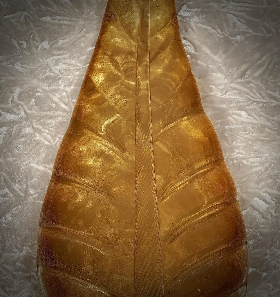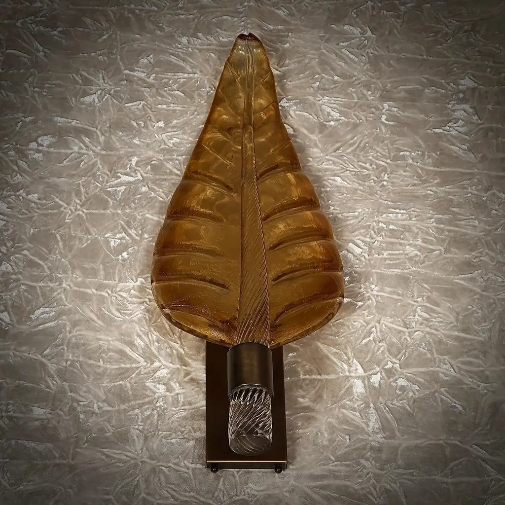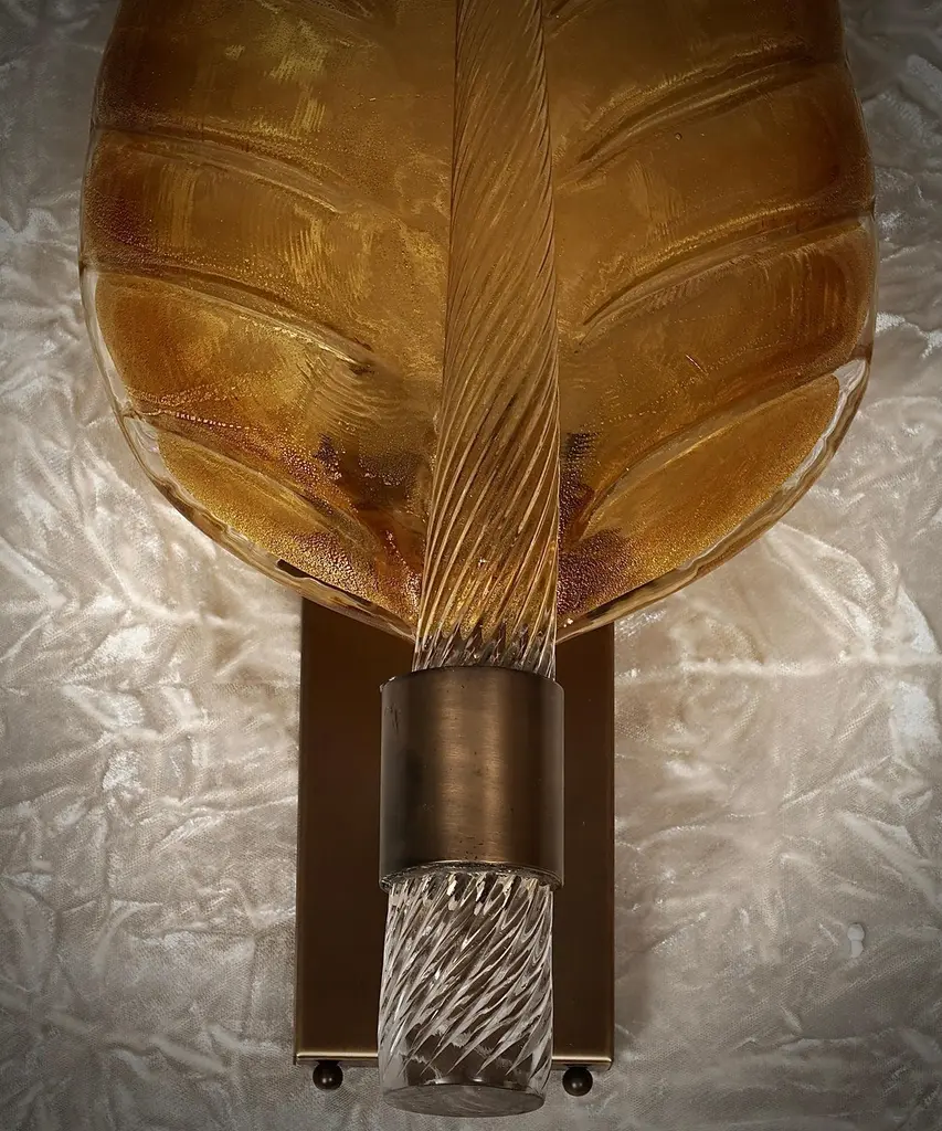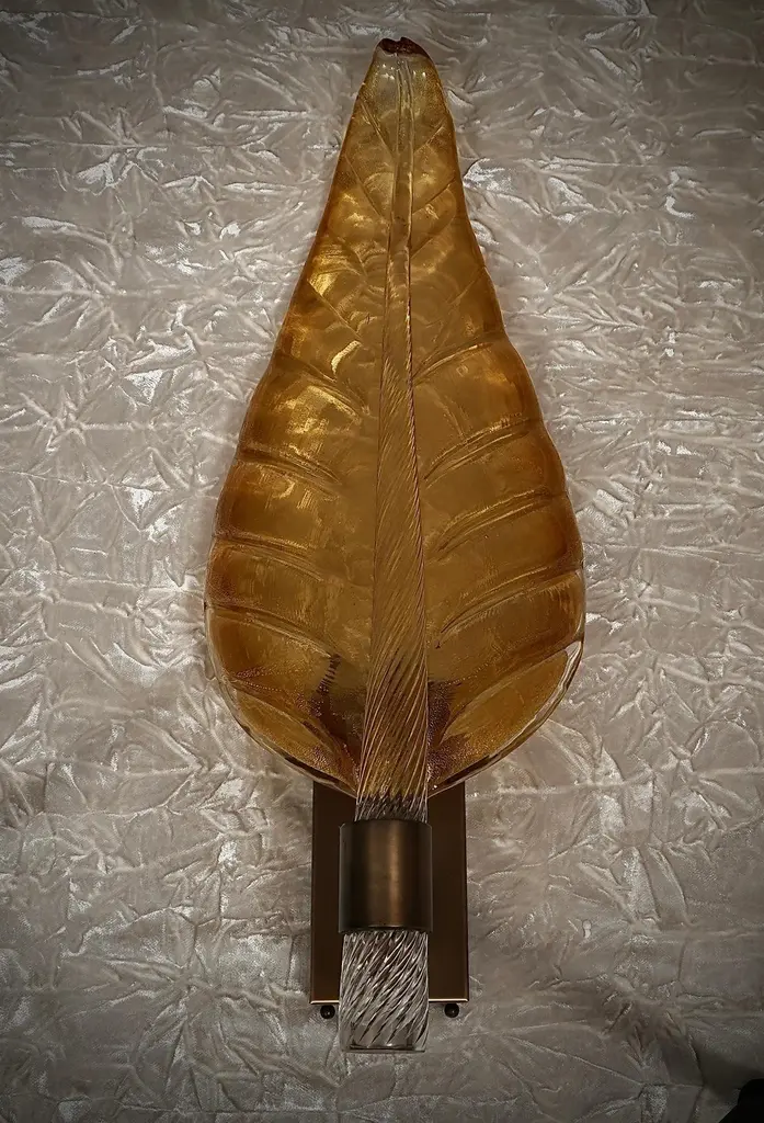 Majestic Murano glass leaf of a wonderful amber color, made even more beautiful by the satin brass base.The wall lamp is composed of a brass structure that is fixed to the wall with dowels and a large amber Murano glass leaf inserted into its appropriate seat. The leaf has a very thick glass structure; Due to its thickness it almost looks like "submerged" glass; To do this, the glassmakers join different layers of glass using heat and repeatedly immerse them in vases of molten colored glass. Note the accuracy and precision with which they are finished. Refinement and class as is the Murano style, unique pieces that always remain precious. When turned on, the wall lamp is very bright having a G9 bulb, it will perfectly illuminate your home.Wear consistent with age and use. Each item offered by the HannauRoma warehouse is checked by our team of craftsmen. We guarantee a very high quality standard, ask our design specialists for detailed information.