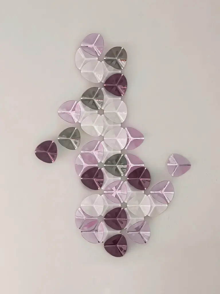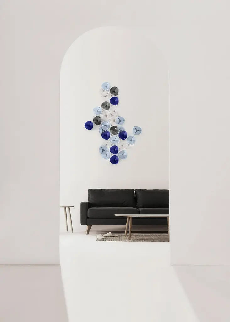 The DUNA wall art piece is a composition of 40 softly curved, artisan glass pieces. Their abstract shape gives a modern touch to the DUNA compositionsThere are 3 color palettes available and other combinations on demand.The colored artisan glass pieces are mounted on a polished stainless steel structure.Hand-crafter and ready-made for each customer.Designed in Barcelona and handmade in our workshop overlooking the Mediterranean sea.Illuminated compositions on a separate listing. DUNA wall lamp.