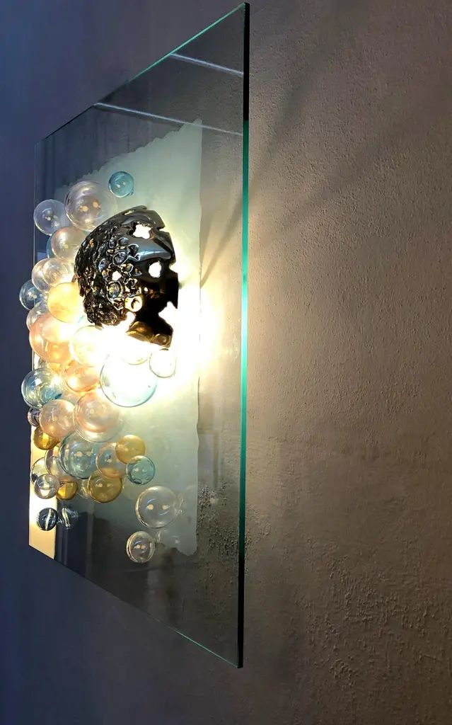 Murano "Bolle in Aria" wall sconce, Angelo BrottoDimensions: 80 x 7 x 80cmMaterials: Murano glass, brassDesigned by Angelo Brotto in 1972. Luminous wall sculpture made with a pane of transparent tempered glass, a central portion in frosted glass, colored spheres of Murano glass and a sculptural seashell in brass.