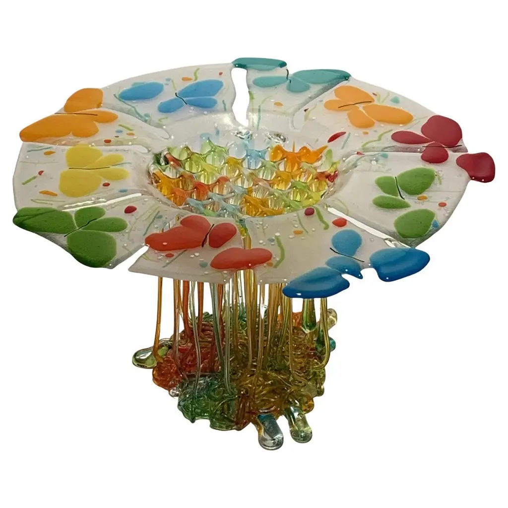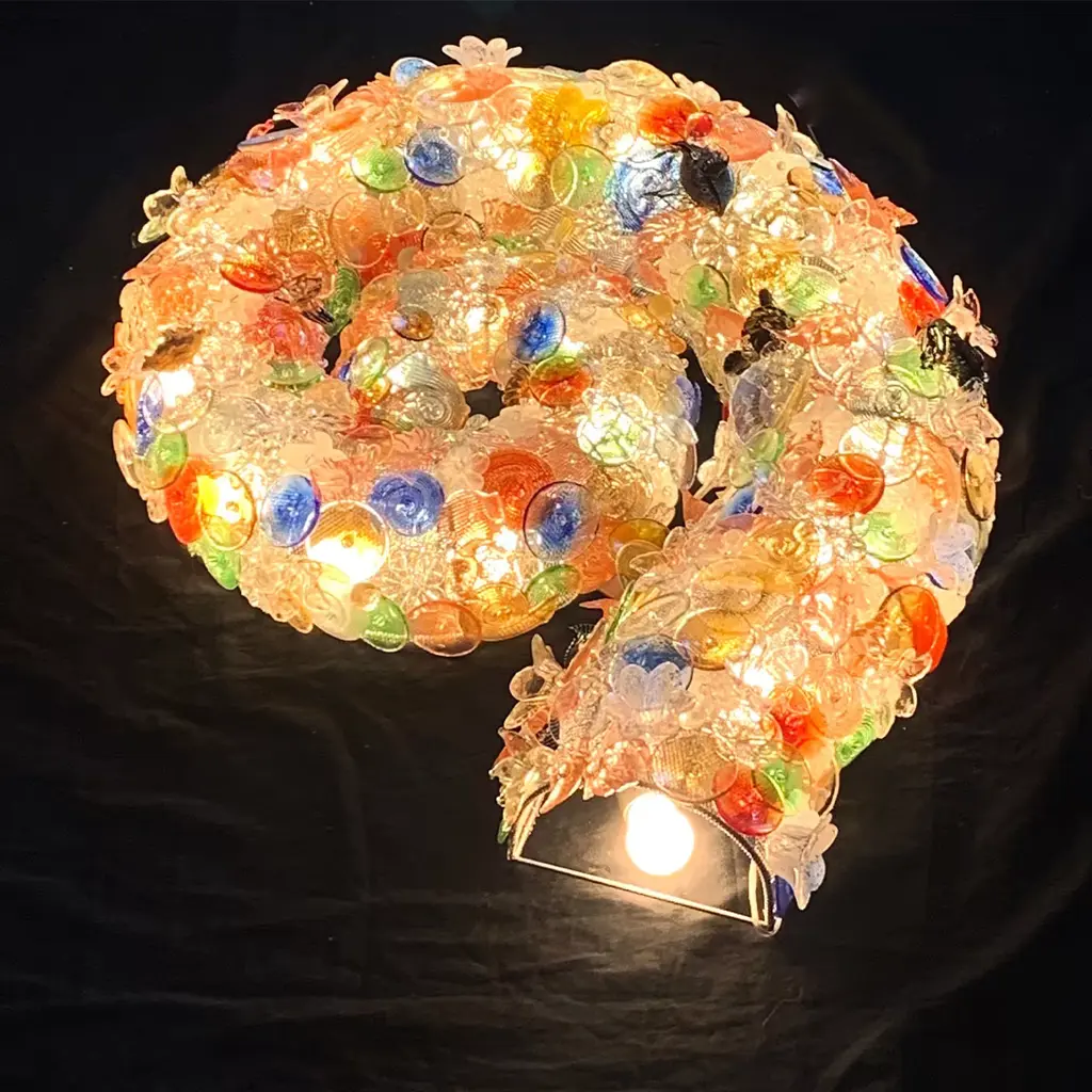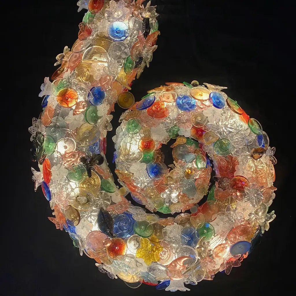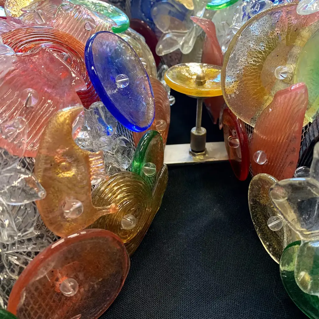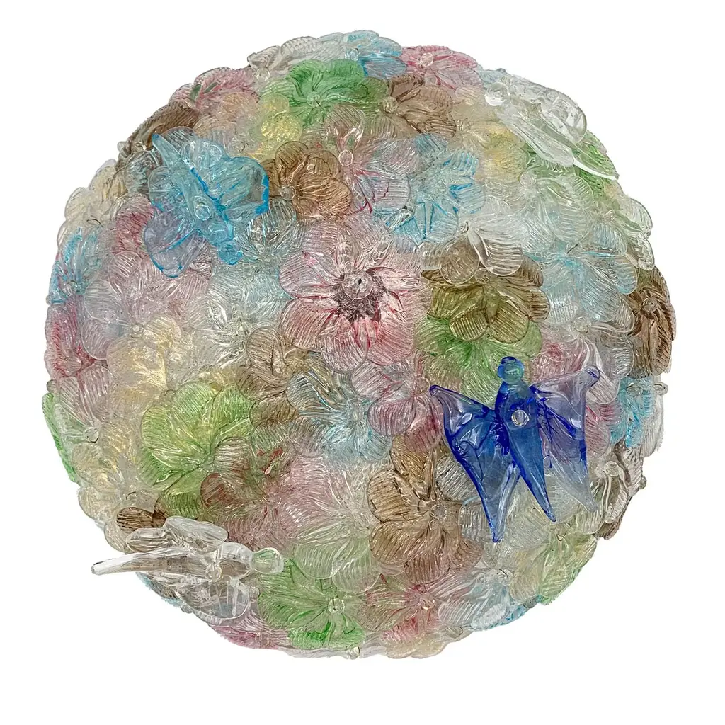 A skillfully restored vintage Murano sconce, this delightful one-off objet d'art showcases a remarkable iron-crafted nautilus shell structure with welded wire mesh. Embellished by Murano decorative ornaments were inserted in the netting, including seashells, fish, and marine life sculpted glass. Use with E14 bulbs, it is equipped with brand new electrical wiring.