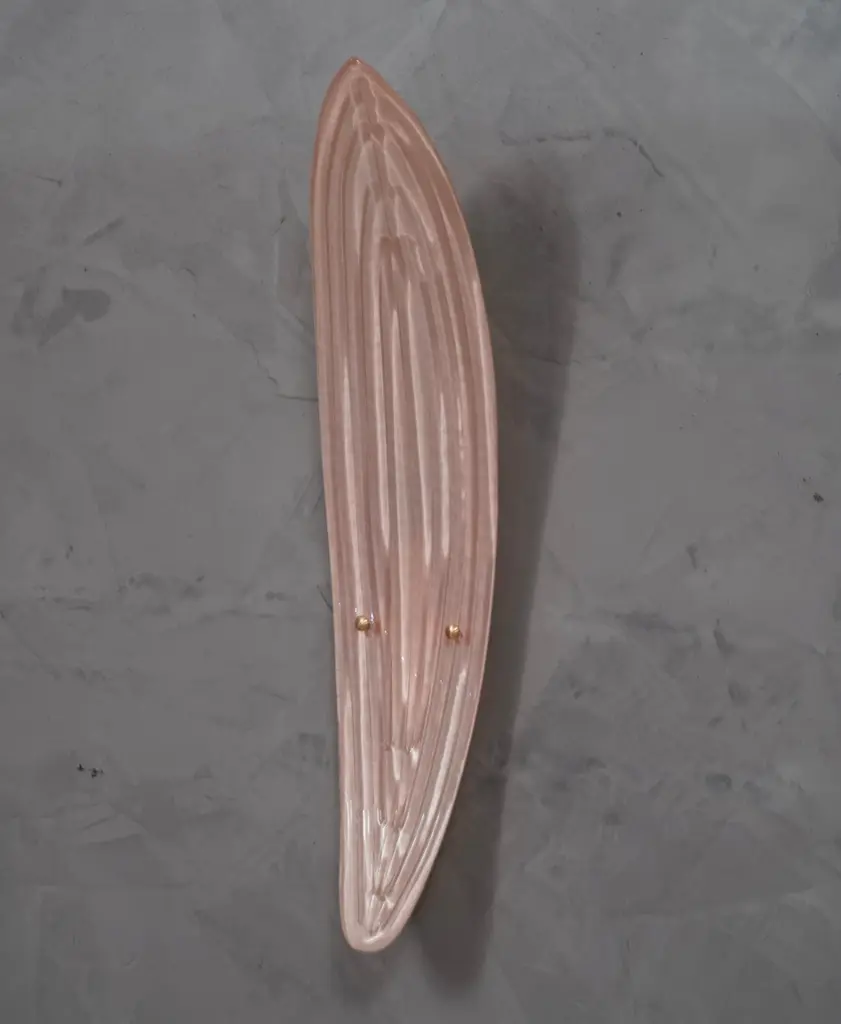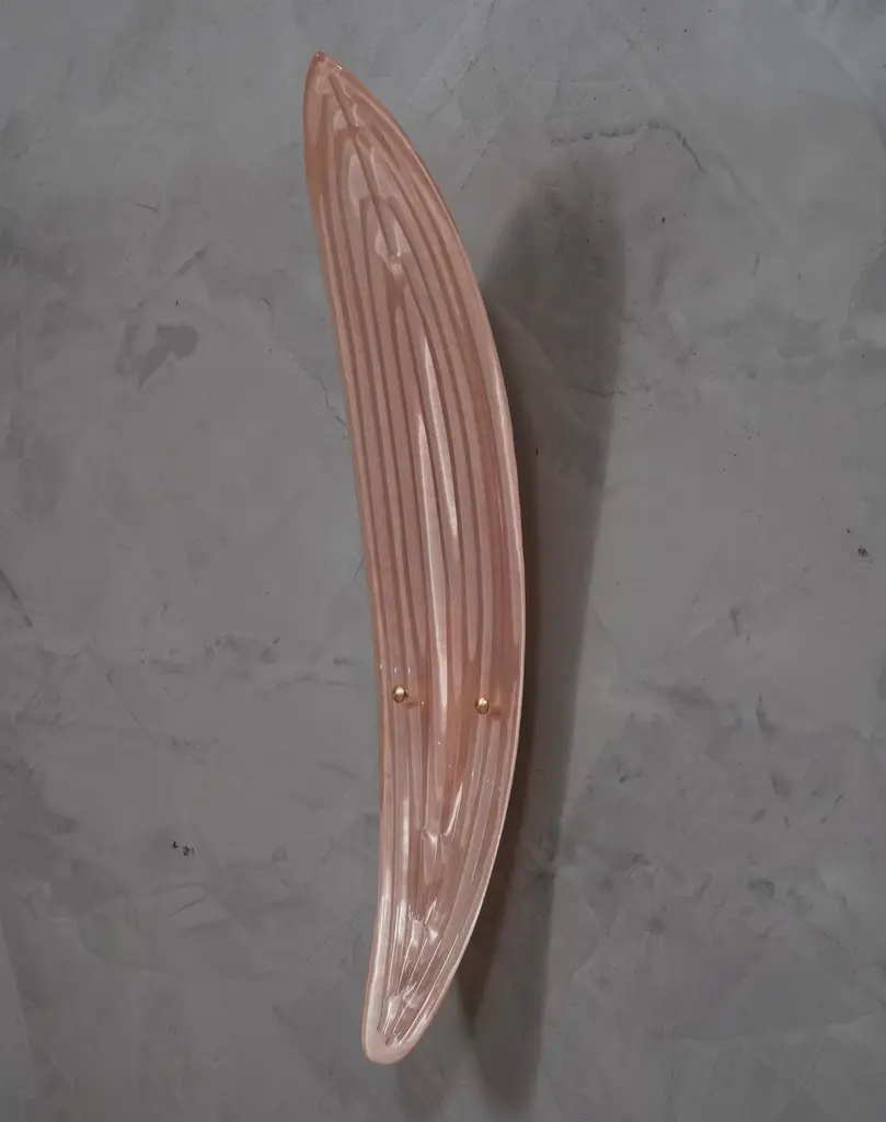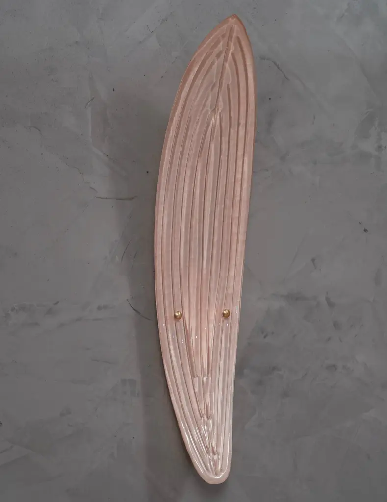 Beautiful design for this leaf-shaped applique, all pink with a series of a vertical rib. Very extensive stylized leaf, an artistic masterpiece of Murano.The applique consists of a structure behind in white painted metal where two bulbs with G9 attack are inserted and a very light and slender murano glass leaf of a beautiful pink color attached to the metal structure with two brass screws. Note the beauty of the leaf and the care with which it was made, its long ribs that run throughout its length. Refinement and class as it is in the style of Murano, unique pieces of their kind that remain precious always. On the wall the wall light is very bright having two bulbs with G9 lamp holder, it will perfectly illuminate your wall.