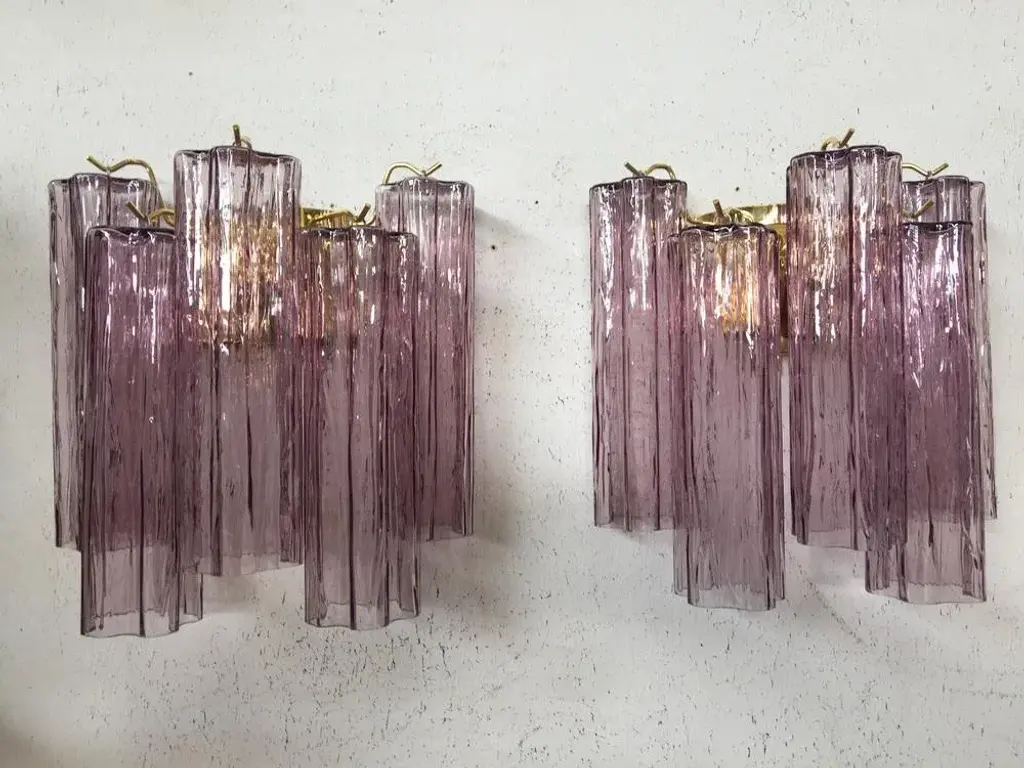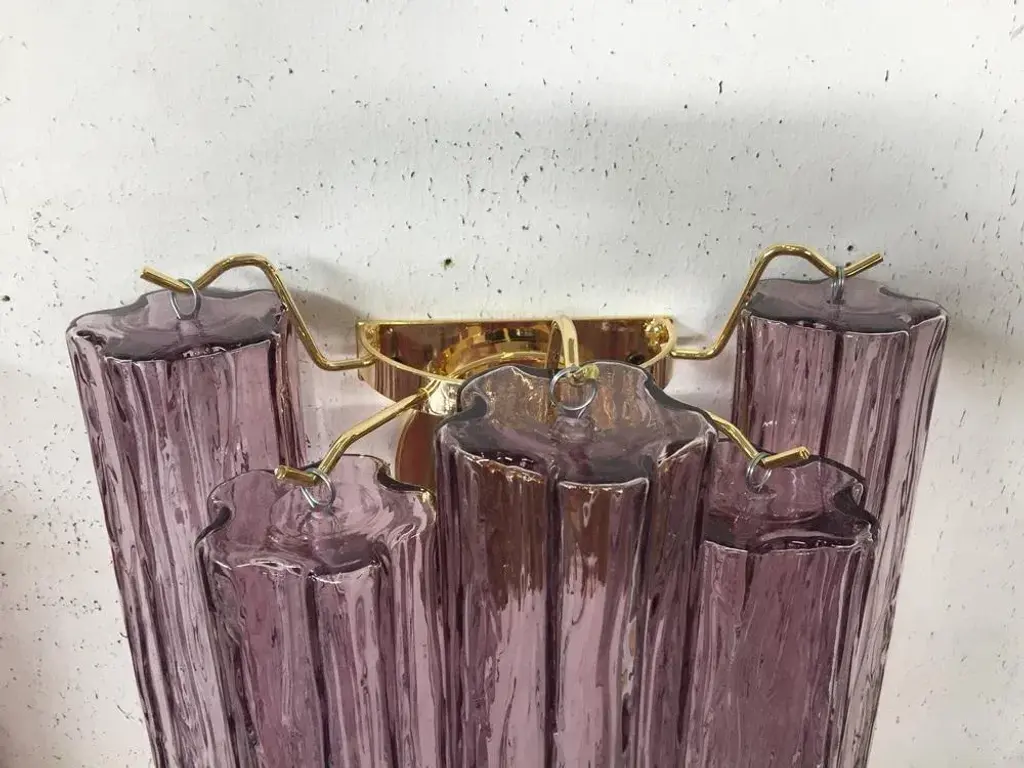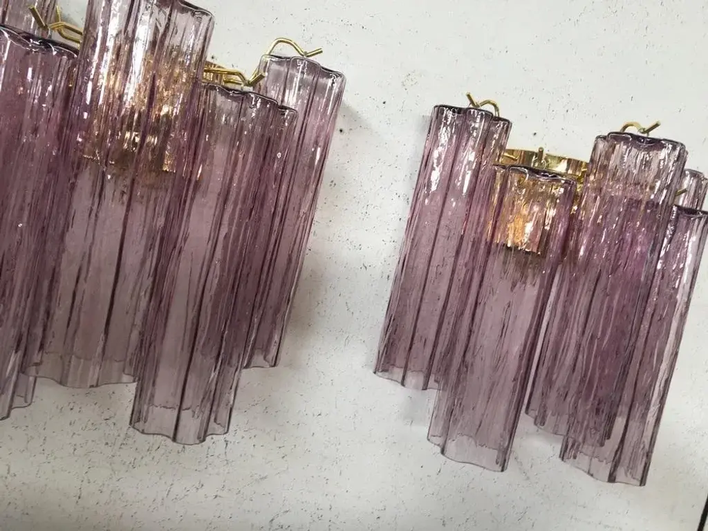 A pair of 2 murano glass "murano glass "tronchi" wall sconces spare parts included. 2 bulbs. a pair of 2 murano glass wall sconces rare fucsia color with a gold metal frame mazzega zuccheri venini barovier style gold 24 karat metal frame 2 x e14 bulbs height 30 cm = 11.8" widht 30 cm =11.8" depth 15 cm = 5.9" european plug (up to 250v).