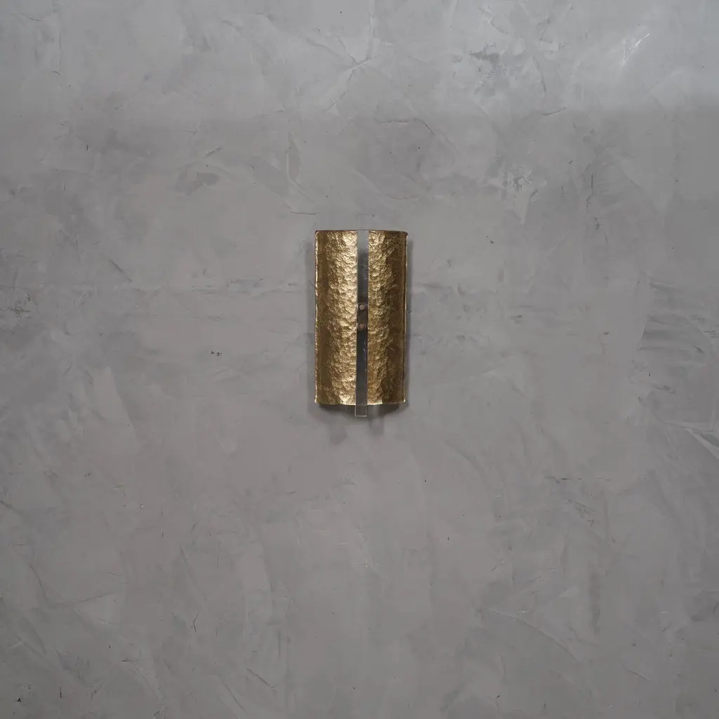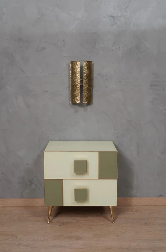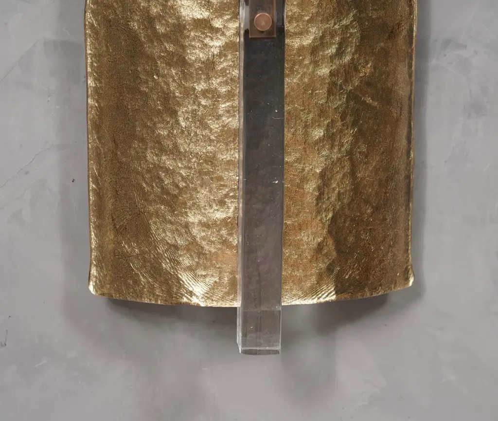 Beautiful assembly for this Murano glass applique. A very particular and rare glass to find, a gold effect and transparent glass; classic Murano style.The applique is composed of a beautiful smooth and curved glass to form a semi circle. The glass has been gold in the back part, very beautiful and strong. Above this curved glass a narrow and long transparent glass parallelepiped was placed, which makes the applique even more beautiful in its design, it is fixed by two brass screws. The structure to which the glass is attached is burnished brass and the two lamp holders are gold colored. Refinement and style as it is in the style of Murano glass factories, unique pieces of their kind and pieces that always remain precious. When turned on, the applique is very bright having two bulbs lamp holders, it will perfectly illuminate your home.