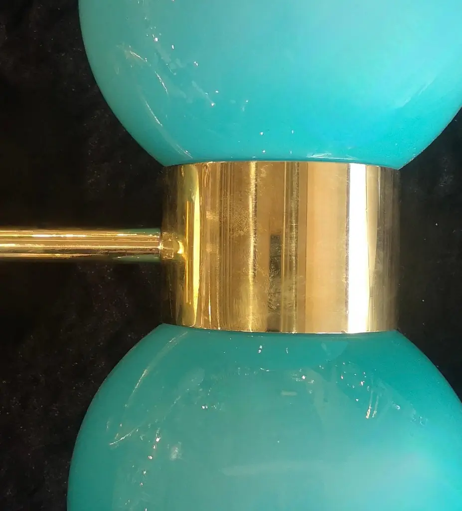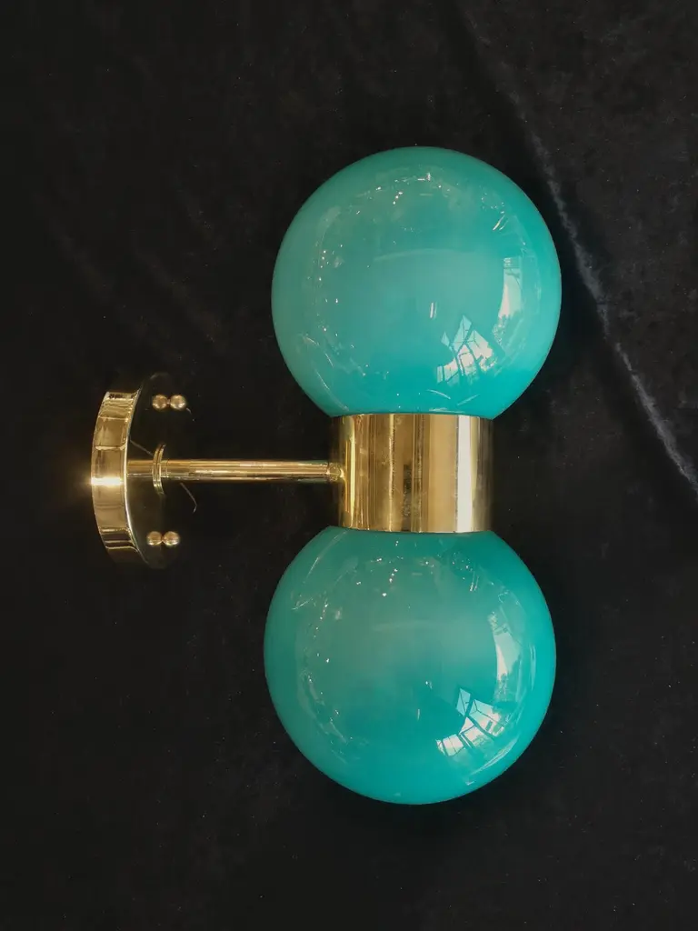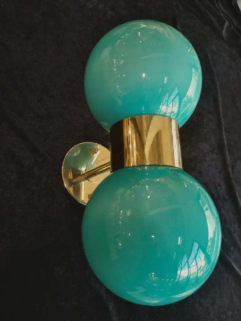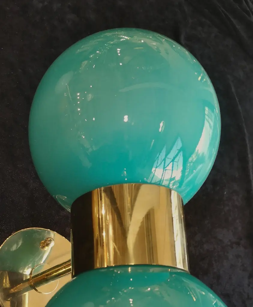Refined and delicate design for this wall light with green Murano glass.The applique is formed by a brass structure that allows the superimposed housing of two beautiful emerald green Murano glass spheres. The design is very clean and simple, but at the same time gives the applique a very refined elegance. Its polished brass frame makes it very rich. Its installation on the wall is made possible by means of a small canopy present on the horizontal tube. Refinement and style as it is in the Murano style of that period, unique pieces of their kind and pieces that always remain precious. When turned on, the lamp is very bright having two bulbs, one per sphere, it will perfectly illuminate your space.