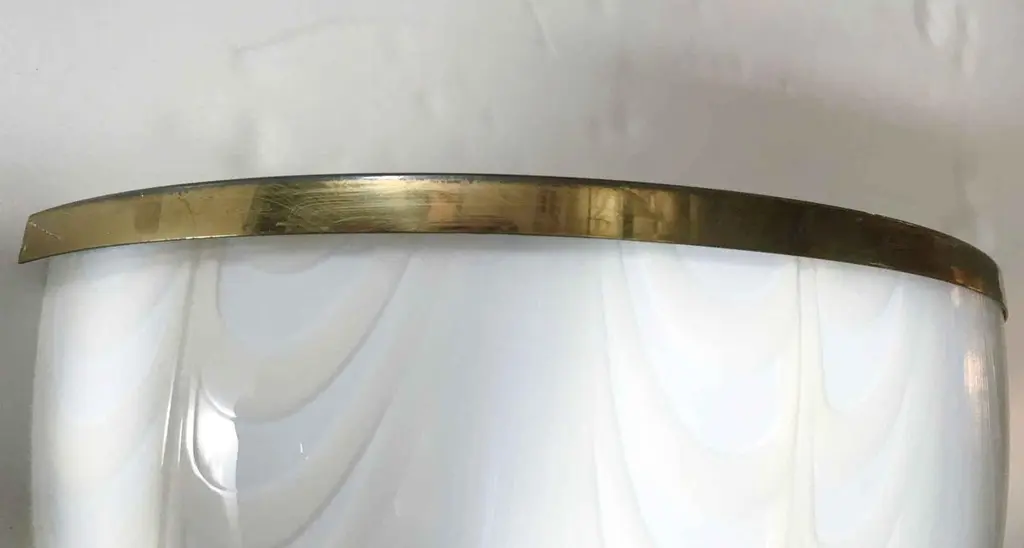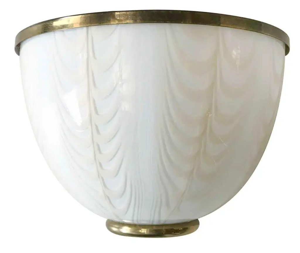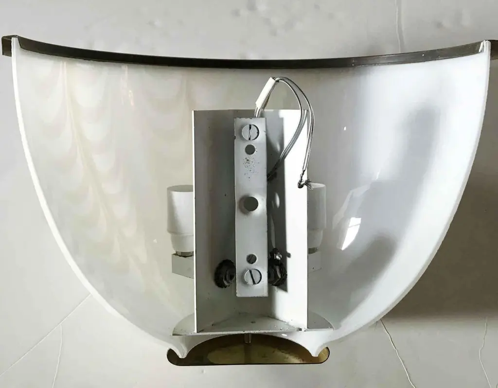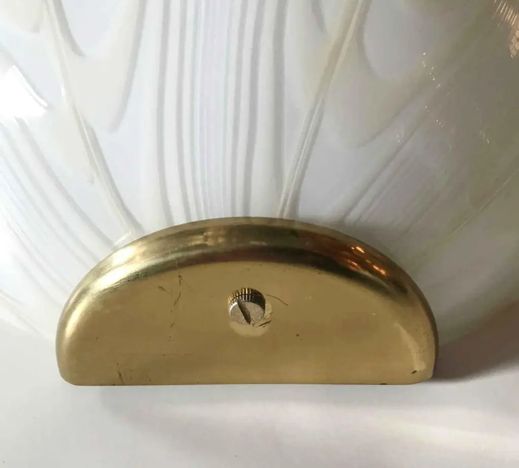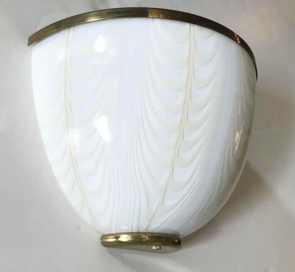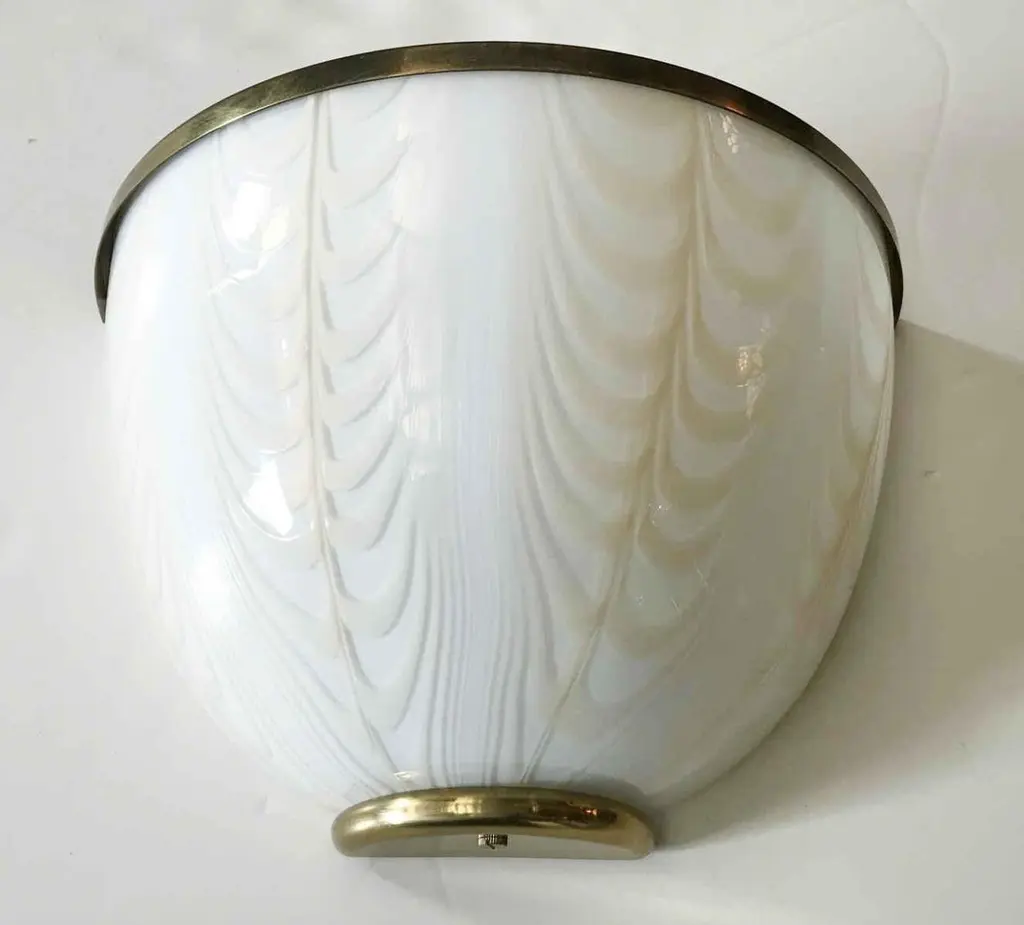 Vintage wall light with cream colored Murano glass decorated with amber feather-shaped details on brass frame and painted metal back plate, by F. Fabbian for Mazzega / Made in Italy in the 1970s2 lights / E12 type / max 40W eachMeasures: Height 8 inches / width 12 inches / depth 5.5 inches3 available in stock in Los Angeles, price listed is for each item