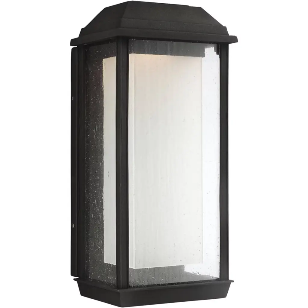 One Light Outdoor Wall Sconce from McHenry collection in Textured Black finish. Number of Bulbs 1. Max Wattage 14.00. No bulbs included. The Feiss McHenry one light outdoor wall fixture in textured black creates a warm and inviting welcome presentation for your home`s exterior. The transitional McHenry lighting collection by Feiss is not only LED lighting-efficient, its made of StoneStrong material for added strength, durability and longevity. The advanced, field-replaceable LED warm-on-dim technology warms in color when dimmed, going from 2700K to 2200K, and is CA Title 24 compliant. The fixtures feature 4 panes of Clear Seeded glass which subtly reveal White Opal inner glass, and the framed architectural details complement the chamfered edges of the roof line, all in a Textured Black finish. McHenry has a 5-year warranty, and is recommended for coastal areas. Three, varying sizes of 1-light outdoor wall sconces, a 1-light outdoor post lantern, a 1-light outdoor pendant and a 2-light outdoor flush mount are included in this line. The LED light source is California Title 24 compliant. No UL Availability at this time.