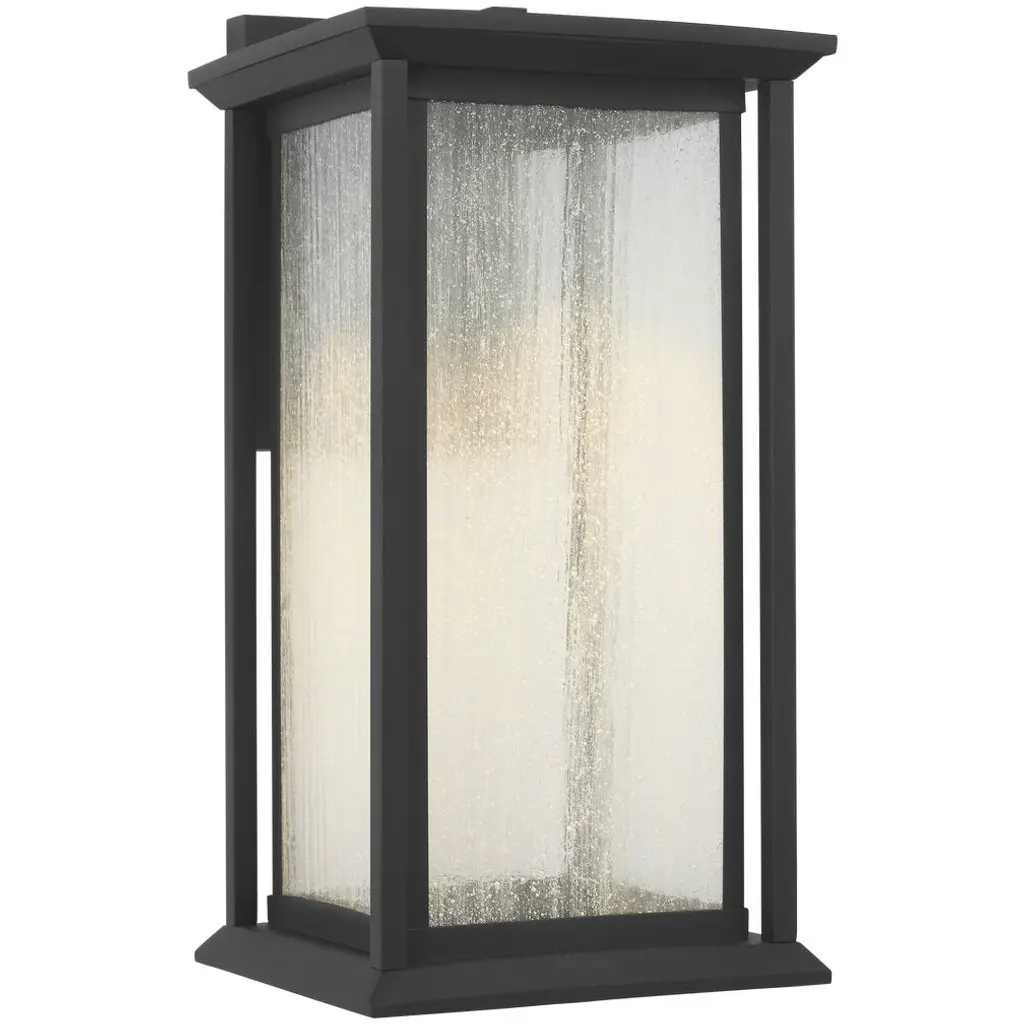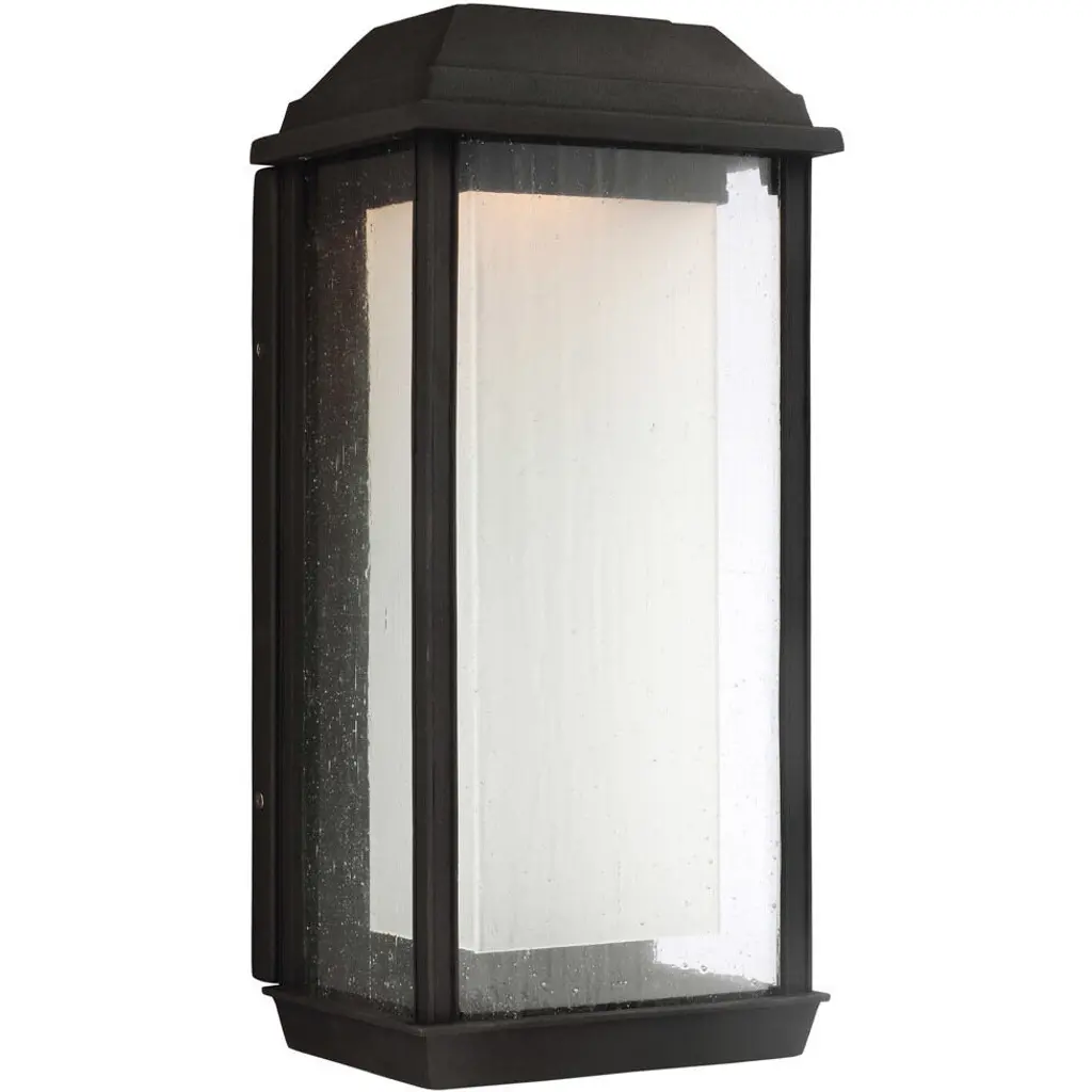 One Light Outdoor Wall Sconce from McHenry collection in Textured Black finish. Number of Bulbs 1. Max Wattage 14.00. No bulbs included. The Feiss McHenry one light outdoor wall fixture in textured black creates a warm and inviting welcome presentation for your home`s exterior. The transitional McHenry lighting collection by Feiss is not only LED lighting-efficient, its made of StoneStrong material for added strength, durability and longevity. The advanced, field-replaceable LED warm-on-dim technology warms in color when dimmed, going from 2700K to 2200K, and is CA Title 24 compliant. The fixtures feature 4 panes of Clear Seeded glass which subtly reveal White Opal inner glass, and the framed architectural details complement the chamfered edges of the roof line, all in a Textured Black finish. McHenry has a 5-year warranty, and is recommended for coastal areas. Three, varying sizes of 1-light outdoor wall sconces, a 1-light outdoor post lantern, a 1-light outdoor pendant and a 2-light outdoor flush mount are included in this line. The LED light source is California Title 24 compliant. No UL Availability at this time.