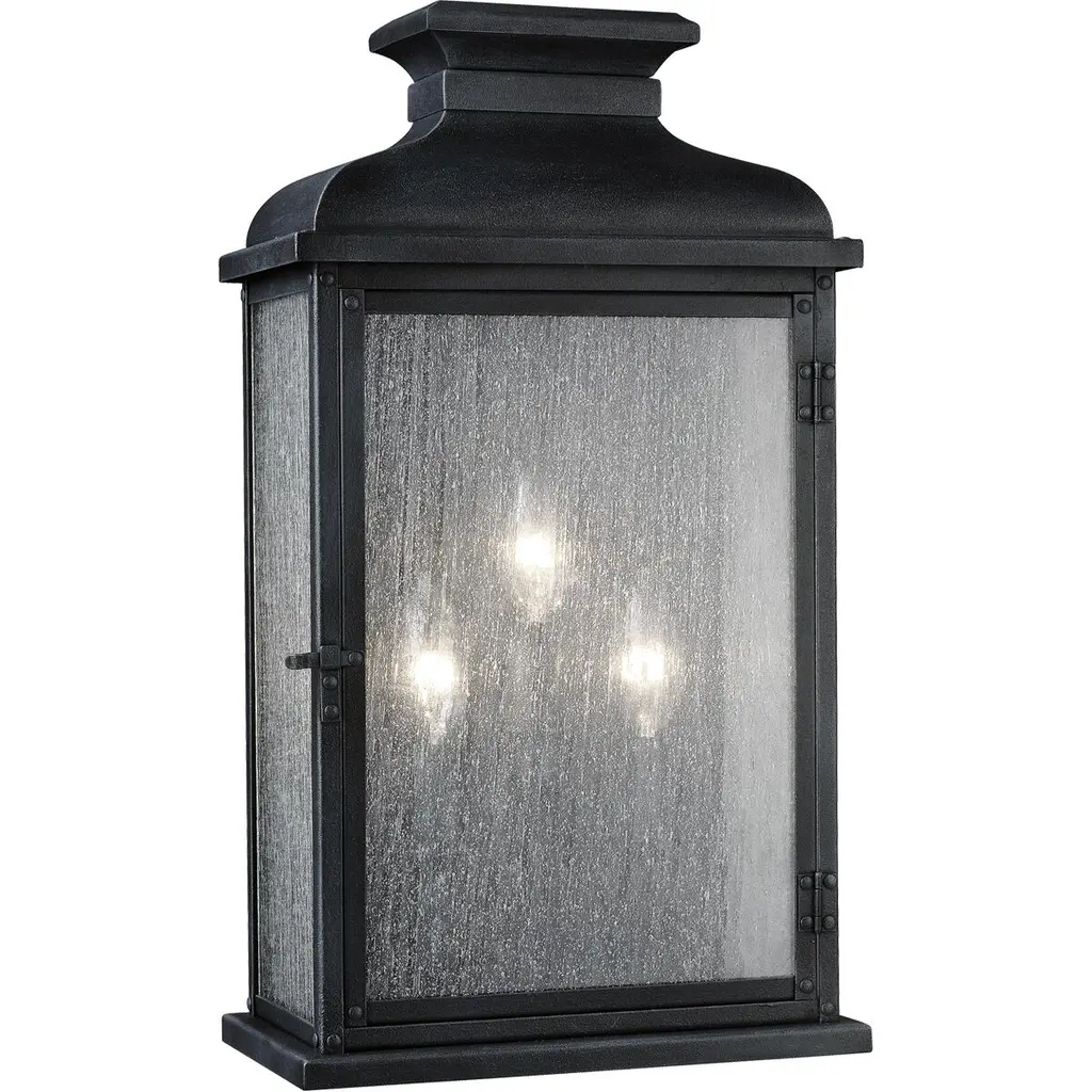Three Light Outdoor Wall Sconce from Pediment collection in Dark Weathered Zinc finish. Number of Bulbs 3. Max Wattage 60.00. No bulbs included. The Feiss Pediment three light outdoor wall fixture in dark weathered zinc enhances the beauty of your property, makes your home safer and more secure, and increases the number of pleasurable hours you spend outdoors. Inspired by distinctive, outdoor lanterns commonly found throughout the streets of London, the crowning detail of the traditional Pediment outdoor lighting collection by Feiss is its classically, curving roof line. The hinged and latched front panel adds a historical reference and also makes relamping easy. The Clear Seeded glass subtly obscures the lamping and helps create the visual appearance of vintage gas lanterns. Offered in either Dark Weathered Zinc or Dark Aged Copper finishes, the collection includes 12. ?� and 18. ?� 2-Light Outdoor Wall Lanterns, 18. ?� and 24. ?� 3-Light Outdoor Wall Lanterns, 2-Light Outdoor Post, 2-Light Outdoor Hanging Lantern and a 2-Light Outdoor Flushmount. No UL Availability at this time.