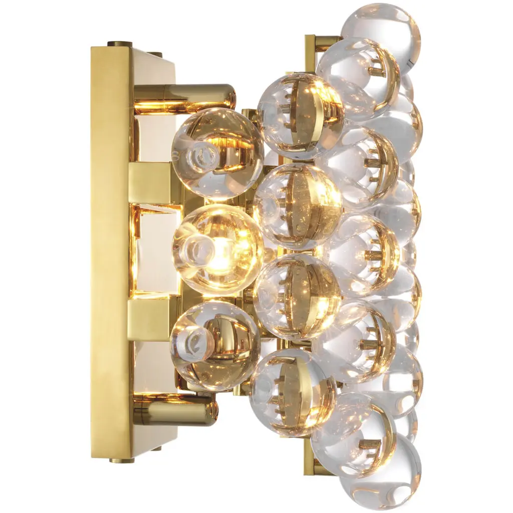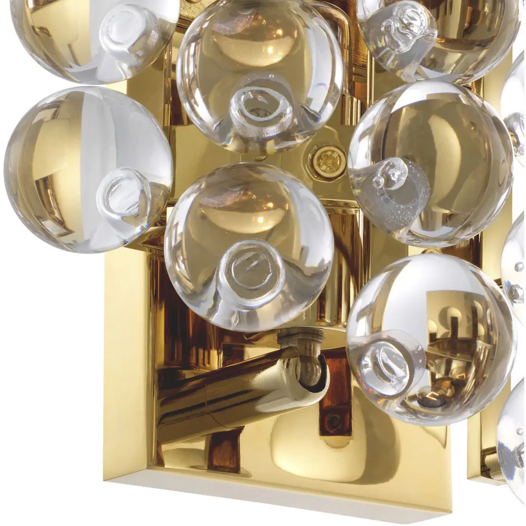 Add a touch of modernism to your living space with the Mylo Wall Lamp. This glamorous sconce is ideal for lighting up your lounge or dining room. The gold finished luminaire features delicate spheres of clear glass. Each sphere bounces the reflections of the others, thus creating a spectrum of colours.