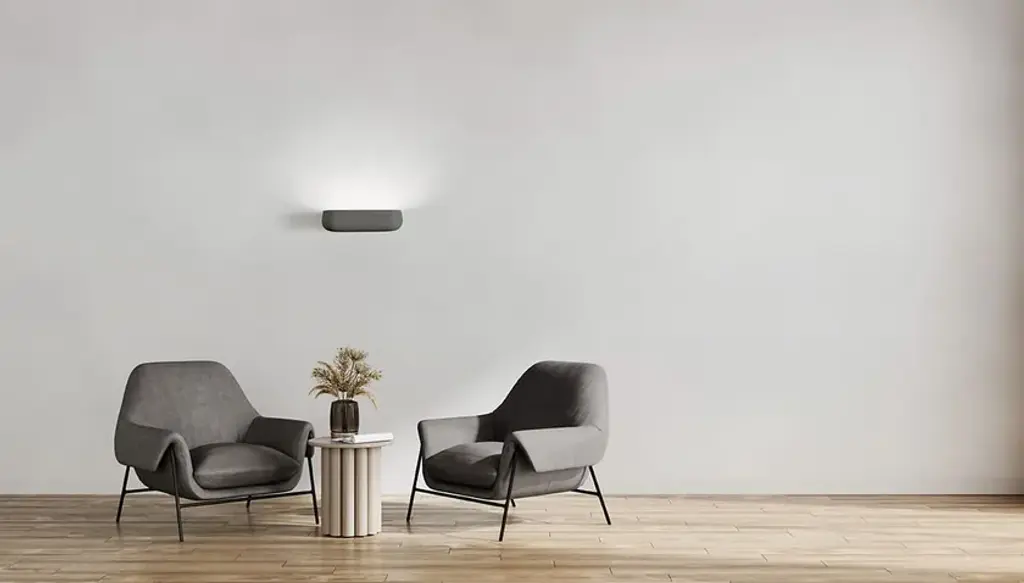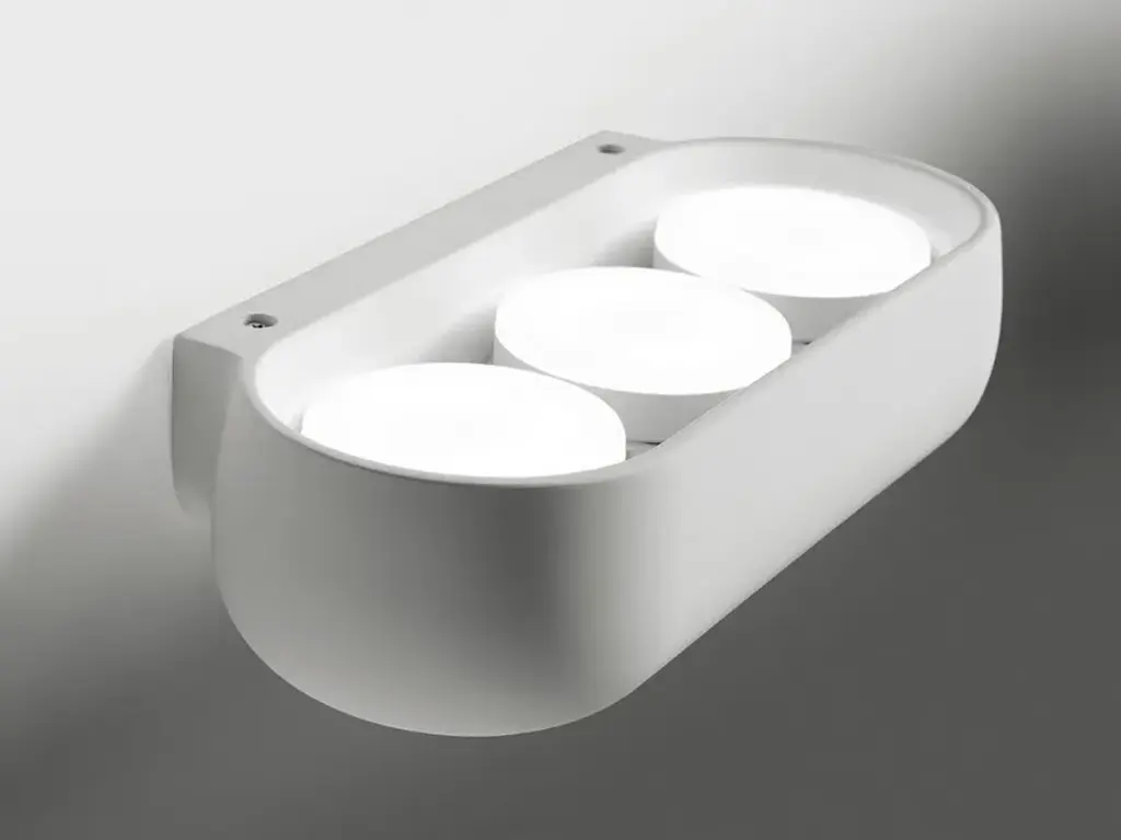 Mysia is a plaster wall lamp. Available in White or Quartz Gray (RAL7039). Equipped with three GX53 lamp holder.