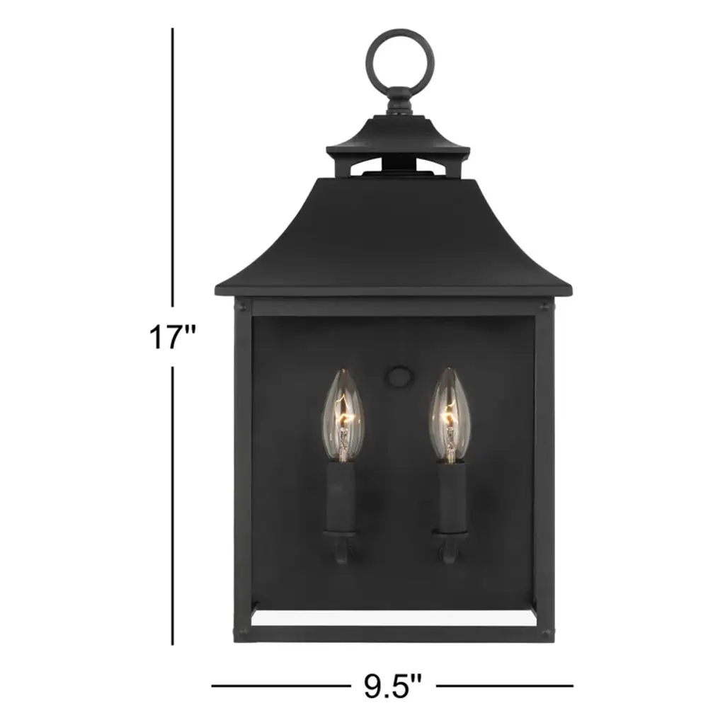 This 2-light outdoor wall lantern brings a boost of brightness and a traditional design to your exterior space. The stainless steel frame sports a textured black finish, while the tapered clear-seeded glass shades house two candelabra bulbs (not included) for ambient illumination that's warm and inviting. The gently curved hook atop the vented roofline adds a subtle flair to the overall look. Rated for wet locations, this wall lantern is a great choice for your porch or patio. To maintain its appearance, simply wipe clean with a dry cloth.