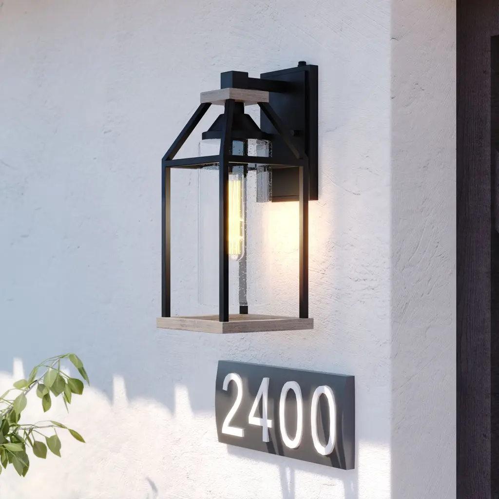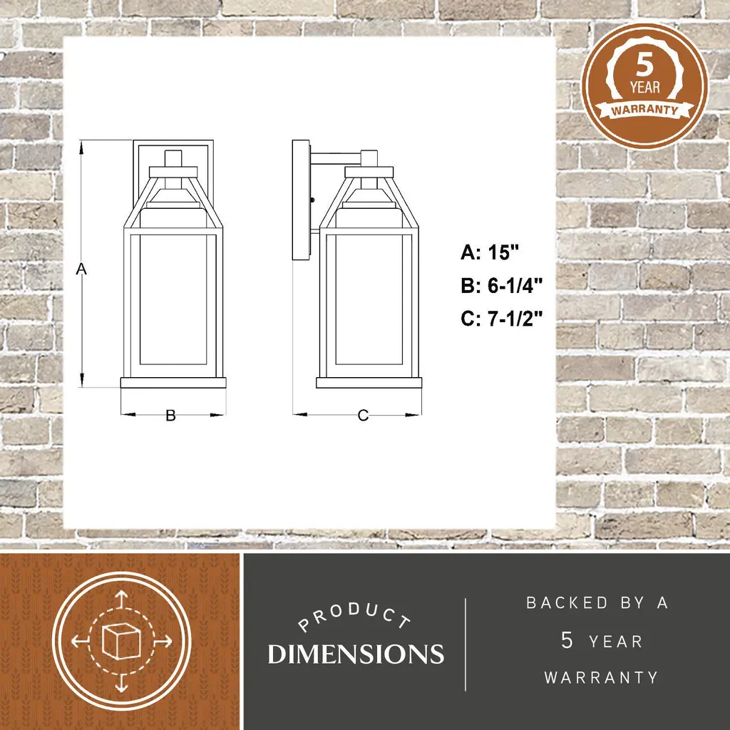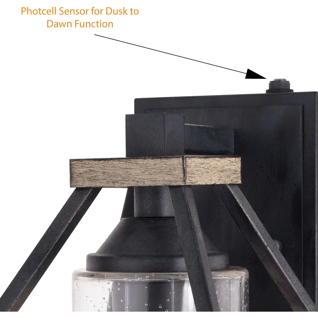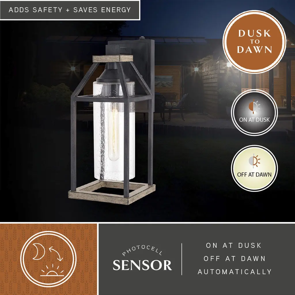 The Napier collection features forged black iron paired with a warm rustic Elm wood finish creating a two-tone design ideal for industrial or modern decor. An open and airy frame encases an elongated clear seeded glass shade offering the maximum light output for your outdoor spaces. For added security, this wall mount light fixture has a built-in photocell sensor that automatically turns the light on at dusk and off at dawn, saving you energy during daylight hours. Made of weather resistant materials that can withstand rain, sleet and snow providing long lasting durability for the safety of your family and home. This lantern sconce is perfect for a wide variety of applications including your front door, porch, patio, garage, barn, entryway, and more