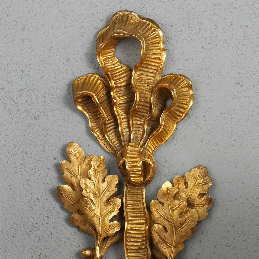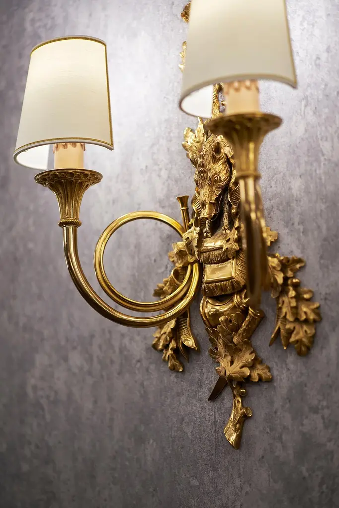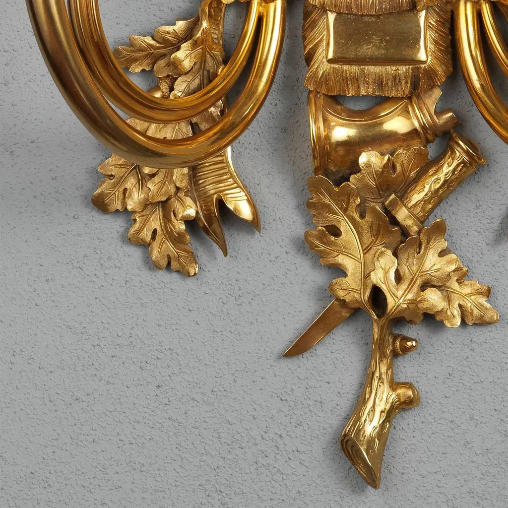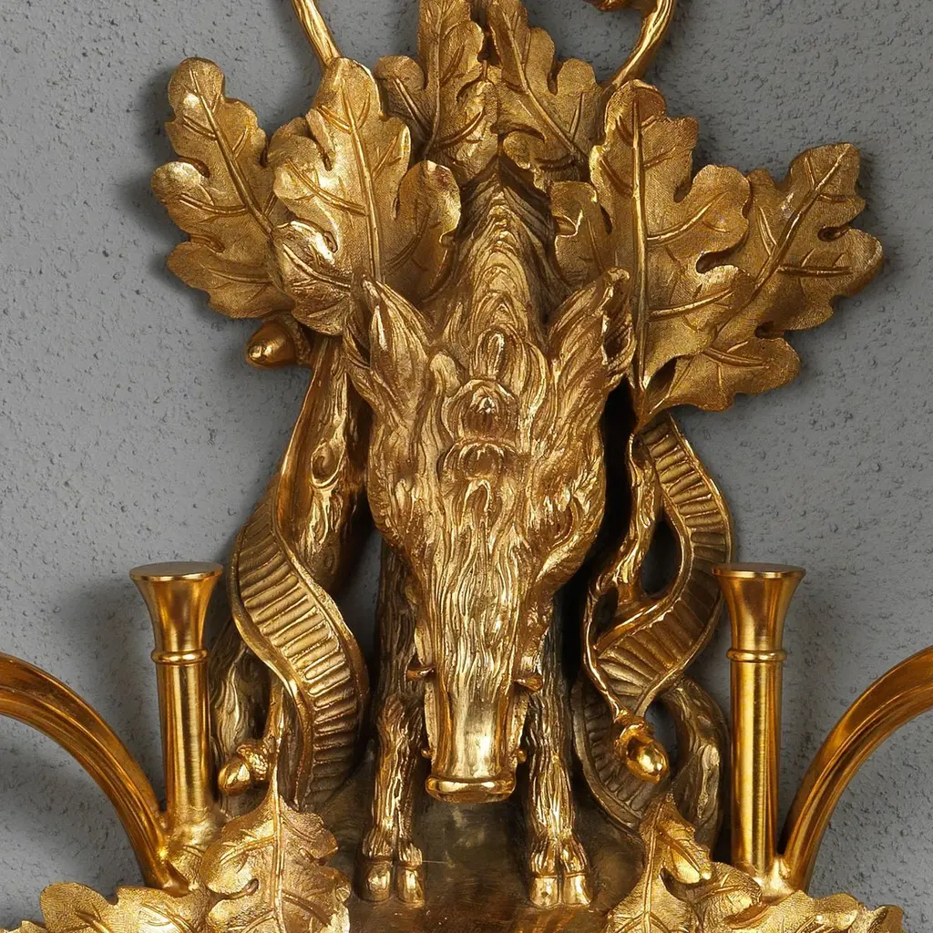 In this Napoleon III Style Gilt Bronze Sconce By Gherardo Degli Albizzi You can appreciate both hunting and vegetal motifs in the form of a boar and oak leaves that create a sinuous gilded backplate to which the trumpet shaped arms are attached.