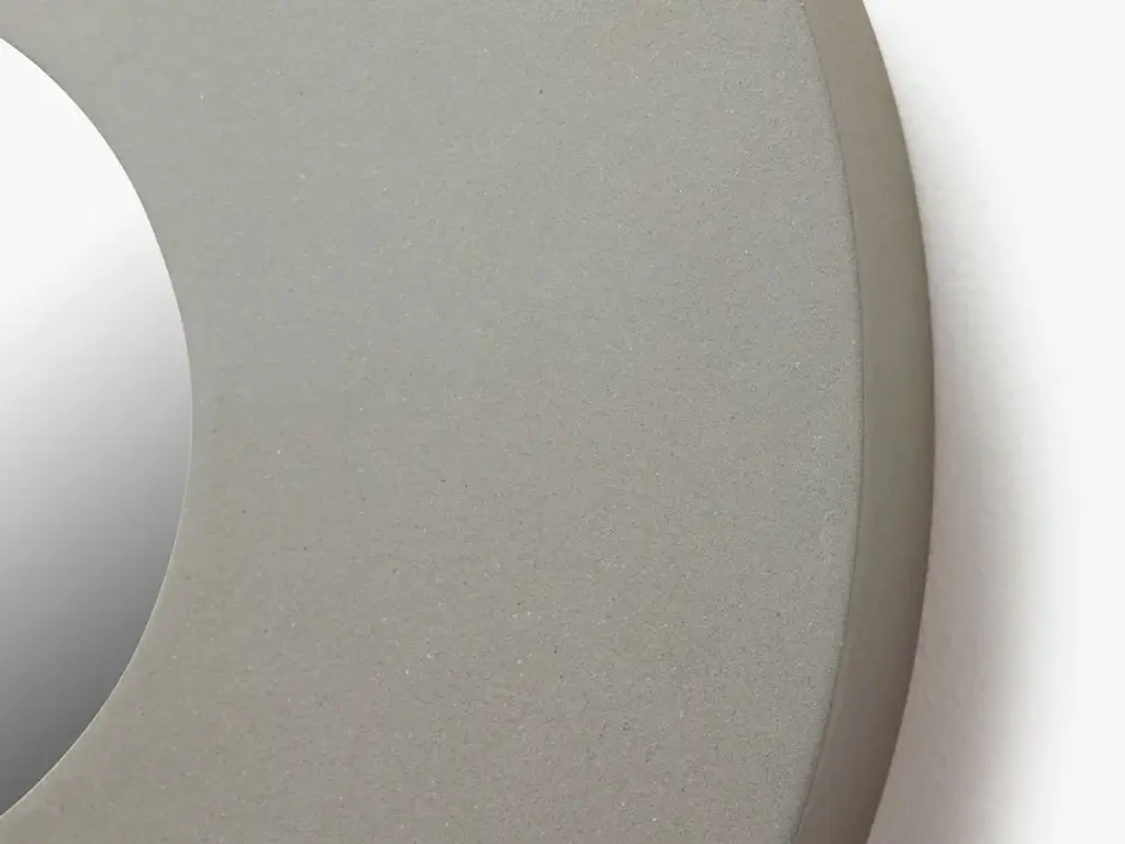 Narcisse is a round concrete wall mirror in concrete.The 'n°1 Narcisse' mirror is made of cemboard. Known as a wall construction material, it offers a clean concrete look. The thin frame and larger glass create a contemporary look, making the Narcisse mirror a perfect addition to any modern interior.When setting up her second studio in Brussels, Anita Le Grelle decided not to use a boring spot-lamp above her desk. Instead, she took a random collection of bowls and pots from her Terres de rêves tableware collection, punched holes in them, stacked them, and added a lamp. She expanded this idea further and so 3 unique pendant lamps were born. In addition, Le Grelle also created wall lamps in stoneware made from different strips of clay.