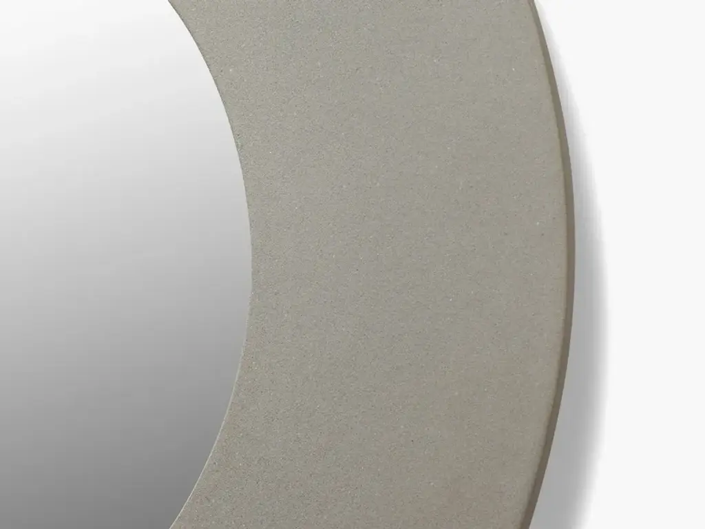 Narcisse is a round concrete wall mirror in concrete.The 'n°2 Narcisse' mirror brings minimalism to a higher level. Anita Le Grelle's experiment with cemboard, a wall construction material, results in a clean concrete look. The thicker frame and smaller glass give this mirror a robust look, making the Narcisse mirror a statement in any room.When setting up her second studio in Brussels, Anita Le Grelle decided not to use a boring spot-lamp above her desk. Instead, she took a random collection of bowls and pots from her Terres de rêves tableware collection, punched holes in them, stacked them, and added a lamp. She expanded this idea further and so 3 unique pendant lamps were born. In addition, Le Grelle also created wall lamps in stoneware made from different strips of clay.