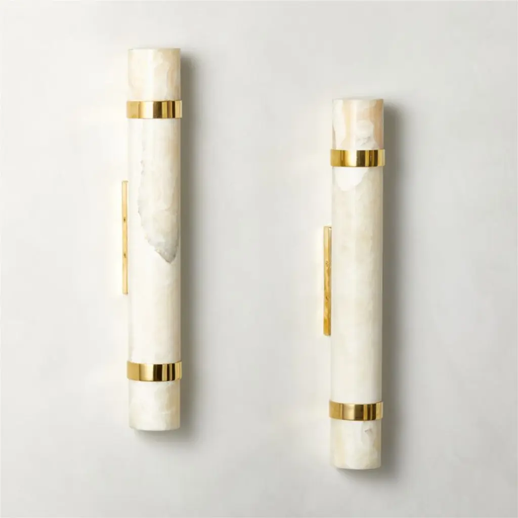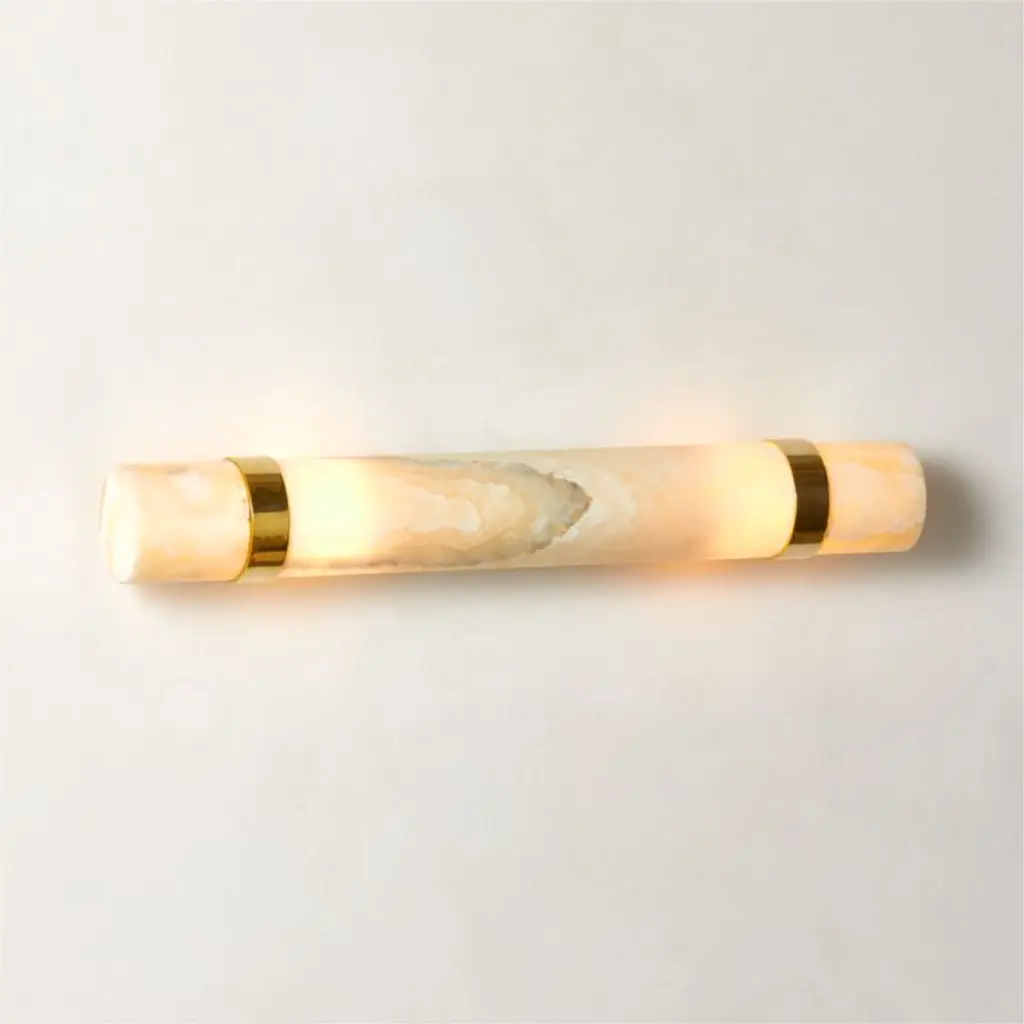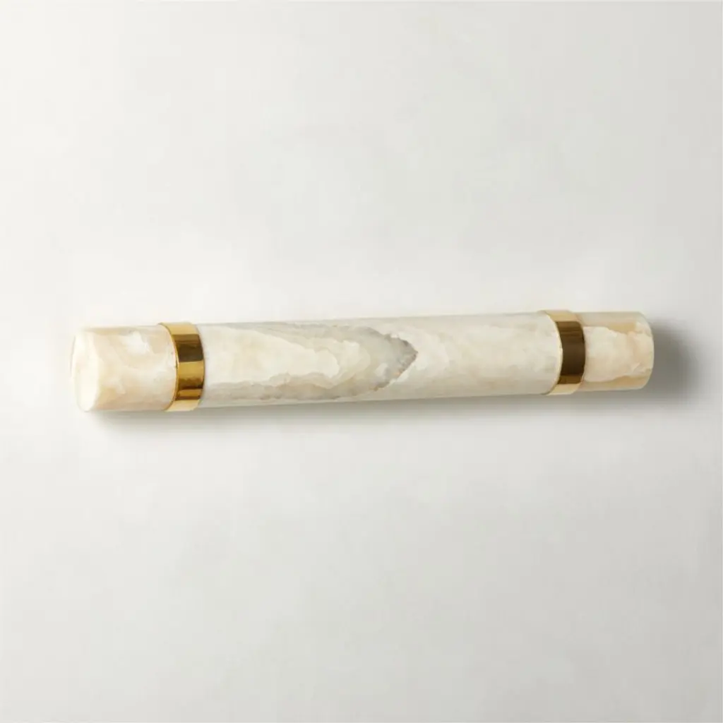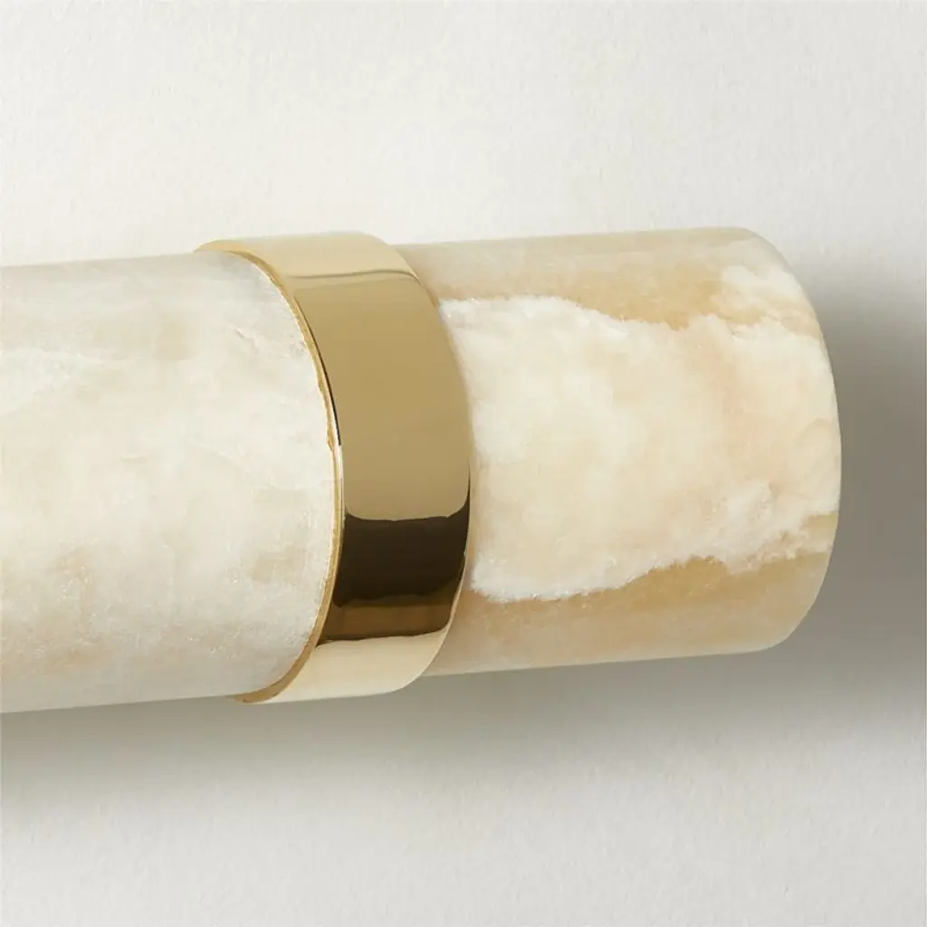Designed by Melbourne-based VUUE, onyx double wall sconce showcases dramatic natural beauty in fundamental form. Carved into a cylinder, cream onyx is precisely cut so that a warm light passes through. Brass frame is unlacquered, offering a living finish that will develop the the patina of a vintage find. Can hang vertically or horizontally. CB2 exclusive.Due to the nature of the material, brass patina will vary in color and darken over time.