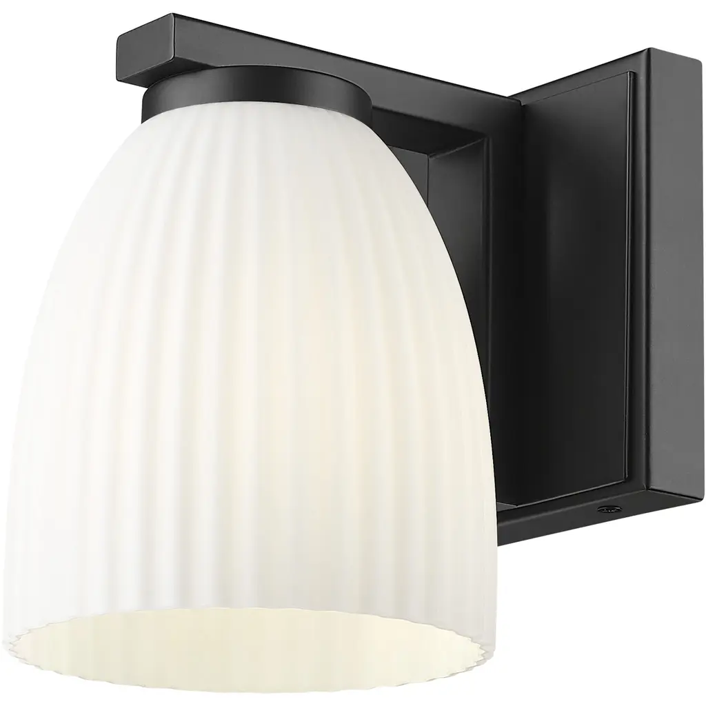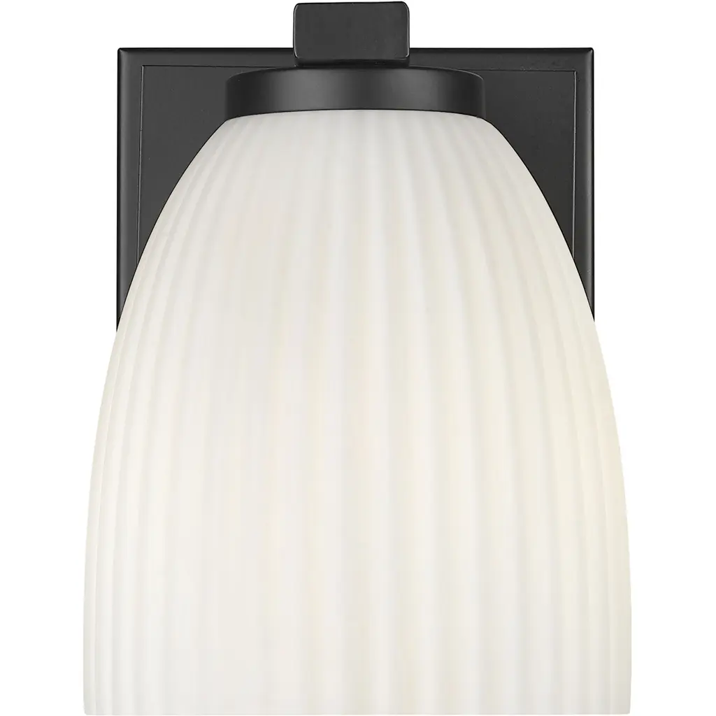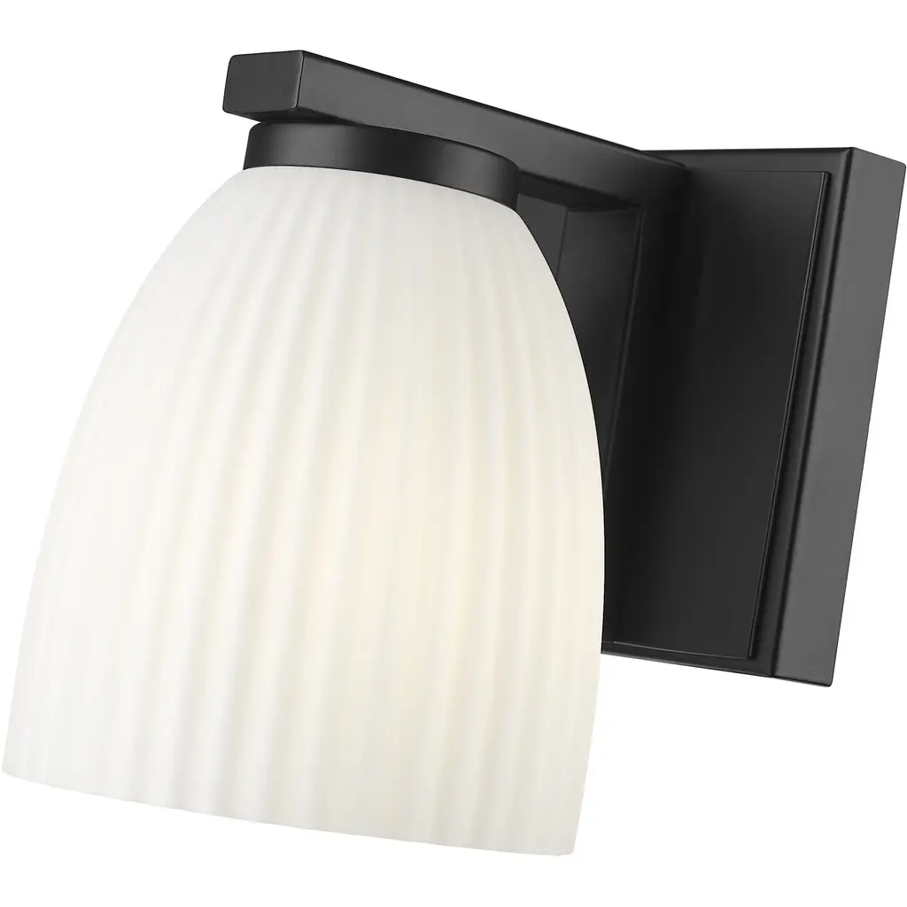 Sharp lines meet soft glow in this matte black wall sconce designed to elevate modern interiors. A matte opal glass shade diffuses the light with a ribbed texture that feels quietly refined. Its a subtle accent that delivers effortless sophistication.