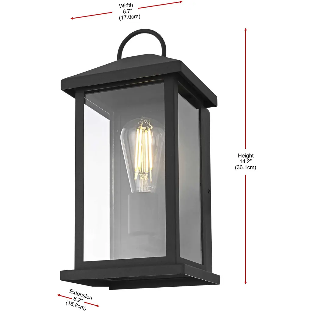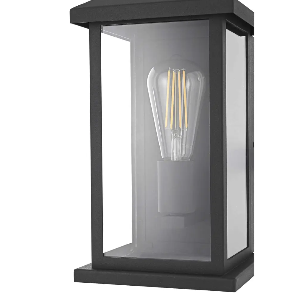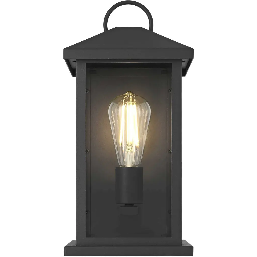 Enhance your outdoor space with the charm and functionality of this modern lantern-style wall light. A strong iron frame, finished in bold matte black, creates a timeless architectural presence, while clear glass panels allow the bulbs warm glow to shine through unobstructed. A decorative ring detail at the top adds a subtle nod to classic lantern designs, blending tradition with modern refinement. The open-bottom design ensures easy bulb changes and effortless maintenance, making it as practical as it is stylish. Designed with an E26 socket (bulb not included), this light allows for complete customization in brightness and style. Wet rated for durability, its the perfect lighting solution for front porches, patios, and outdoor walkways, offering a radiant, welcoming ambiance year-round.