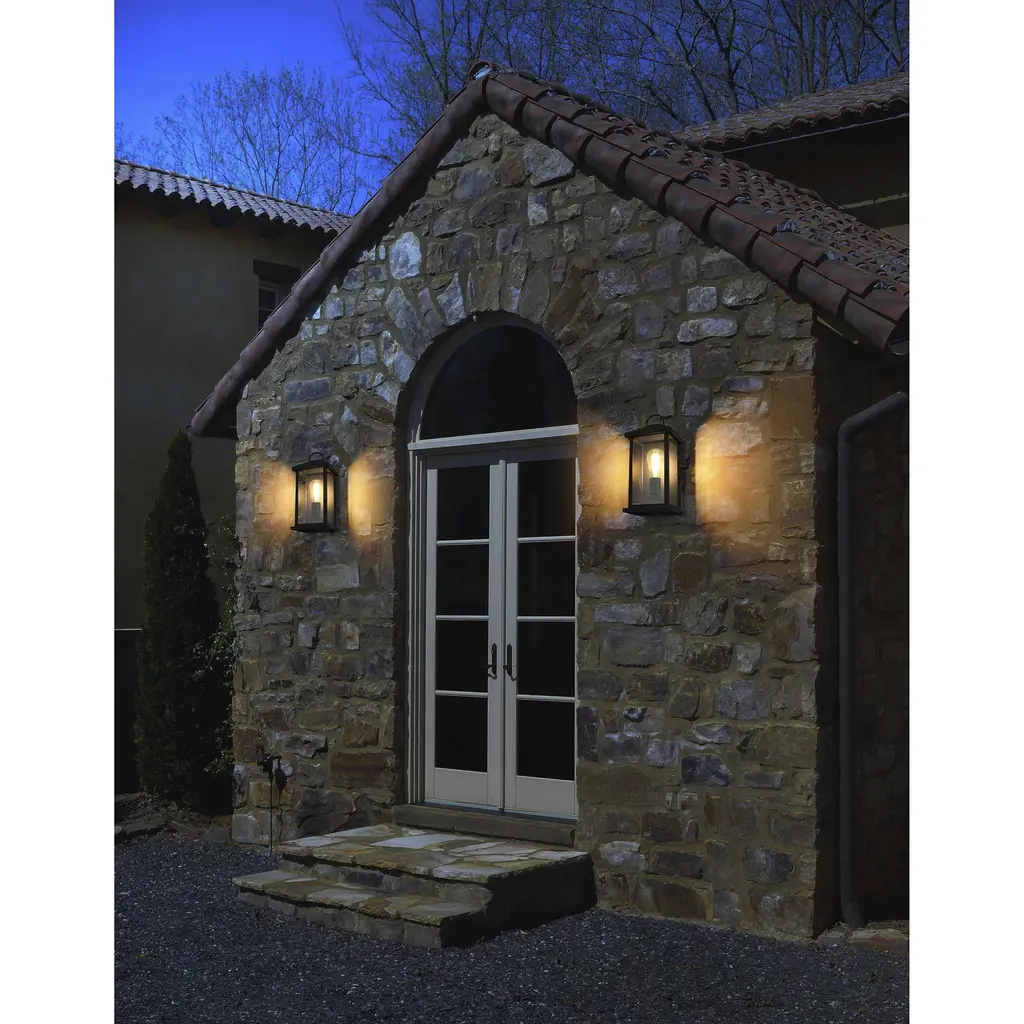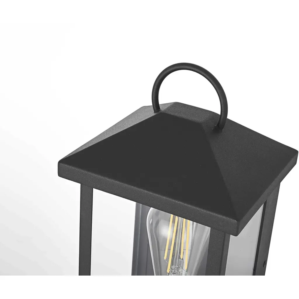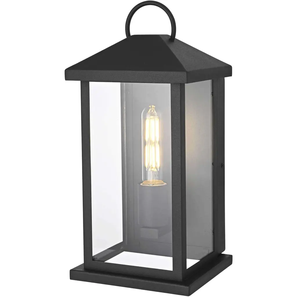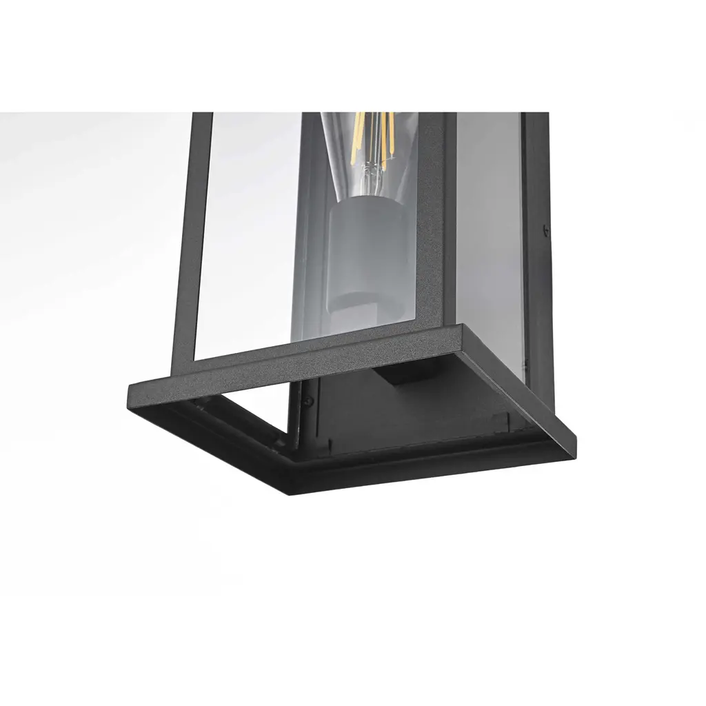Enhance your outdoor space with the charm and functionality of this modern lantern-style wall light. A strong iron frame, finished in bold matte black, creates a timeless architectural presence, while clear glass panels allow the bulbs warm glow to shine through unobstructed. A decorative ring detail at the top adds a subtle nod to classic lantern designs, blending tradition with modern refinement. The open-bottom design ensures easy bulb changes and effortless maintenance, making it as practical as it is stylish. Designed with an E26 socket (bulb not included), this light allows for complete customization in brightness and style. Wet rated for durability, its the perfect lighting solution for front porches, patios, and outdoor walkways, offering a radiant, welcoming ambiance year-round.