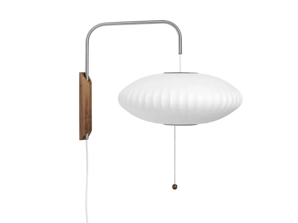 Part of the Nelson Bubble Lamp series, the Nelson Wall Lamp series comprises a range of wall-mounted lighting solutions. Featuring a spherical shade suspended from a walnut wall mount and steel arm, the lamp fills any interior with a warm, diffused light. The lamp’s arm can be adjusted from left to right and up and down without having to change its position on the wall. Available in Ball, Pear, Cigar, and Saucer variants.HIGHLIGHTS- Part of a progressive and technologically advanced lighting collection.- A family of refined wall sconces.- CE approved.- Suitable for both private and office environments.MATERIALSSHADE: Webbing polymerFRAME TOP & BOTTOM RING: Coated and brushed metal and nickelCORD: White PVC insulationAll Bubble Lamp models have a steel-wire skeleton on the interior which is spray coated with the translucent plastic polymer resulting in a lamp that is both opaque and transparent as it glows.TECHNICAL SPECIFICATIONSRECOMMENDED LIGHT SOURCE: LED E27 (A15)POWER (WATTS): 5-8WDIMMABLE: NoPOWER SUPPLY: 220-240V AC at 50/60Hz polarized plug and cable includedCORD LENGTH: 366 cmSWITCH: Pull switchFLUX (LUMENS): 500-800lmCCT (KELVIN) & CRI (1-100): The levels will vary depending on the type of bulb used in the lamp.Designed by pioneering American designer George Nelson in 1947, and first produced in 1952, the Bubble Lamp signaled a revolution in the Modernist lighting industry. Available in an assortment of organic sizes and shapes, these elegant orbs were inspired by a set of silk-covered Swedish pendant lamps Nelson wanted for his office, but found to be too expensive. Employing the resourcefulness that characterized his working process, he decided to use a self-webbing plastic spray developed by the U.S. military, and applied it over a lightweight, rounded-steel frame to produce these soft, glowing fixtures.