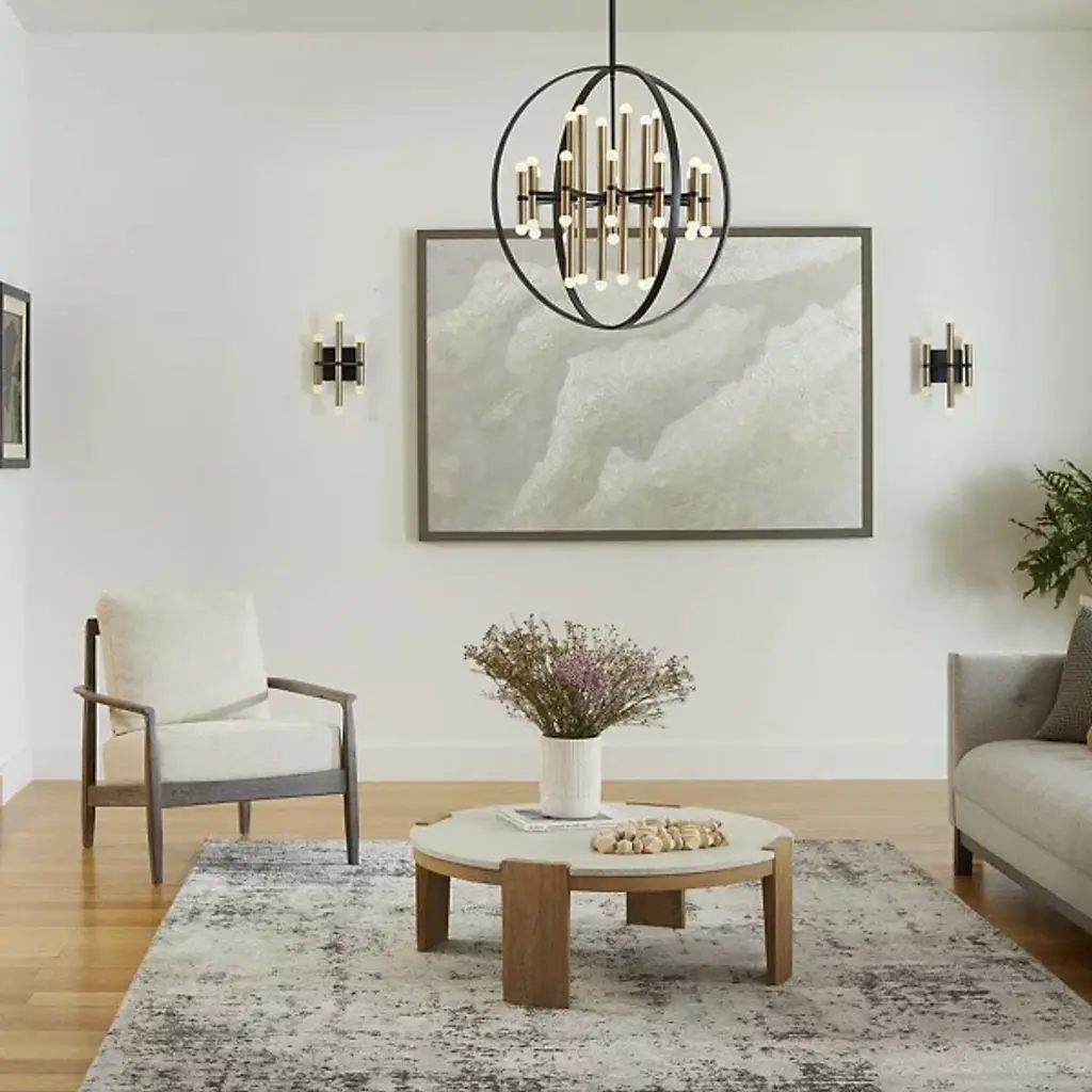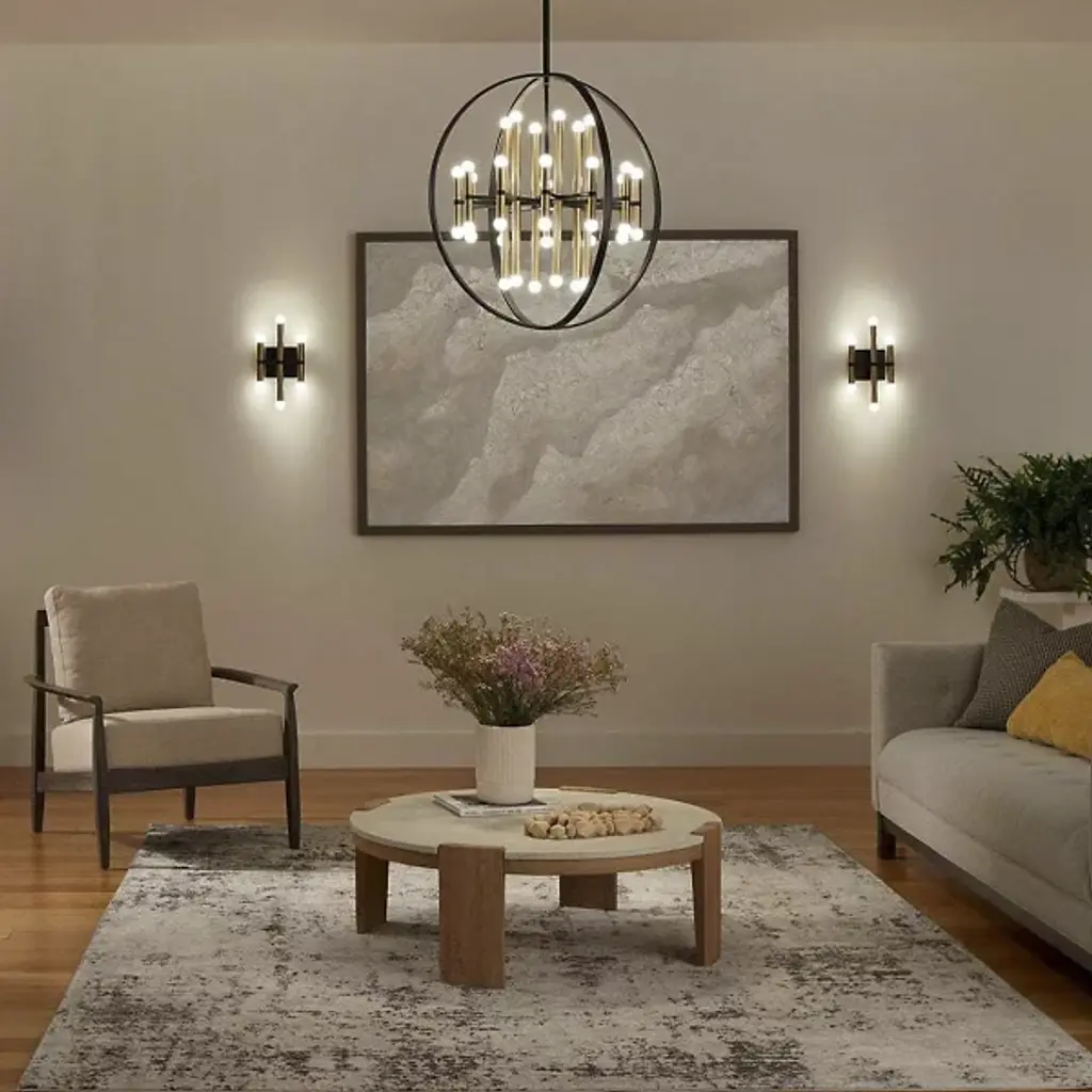 The Nero LED Wall Sconce from Oxygen Lighting pairs contemporary simplicity with retro refinement. Held in place by a square steel wall plate, it extends a central beam to short, angular branches that support cylindrical light housings that contrast their smooth brass-textured exteriors with the matte appeal of the support structure. Damp-listed, ADA-compliant LED lamping emerges vertically from each end of the cylinder housings and is capped by an acrylic orb accent that transforms direct glare into a gentle glow.