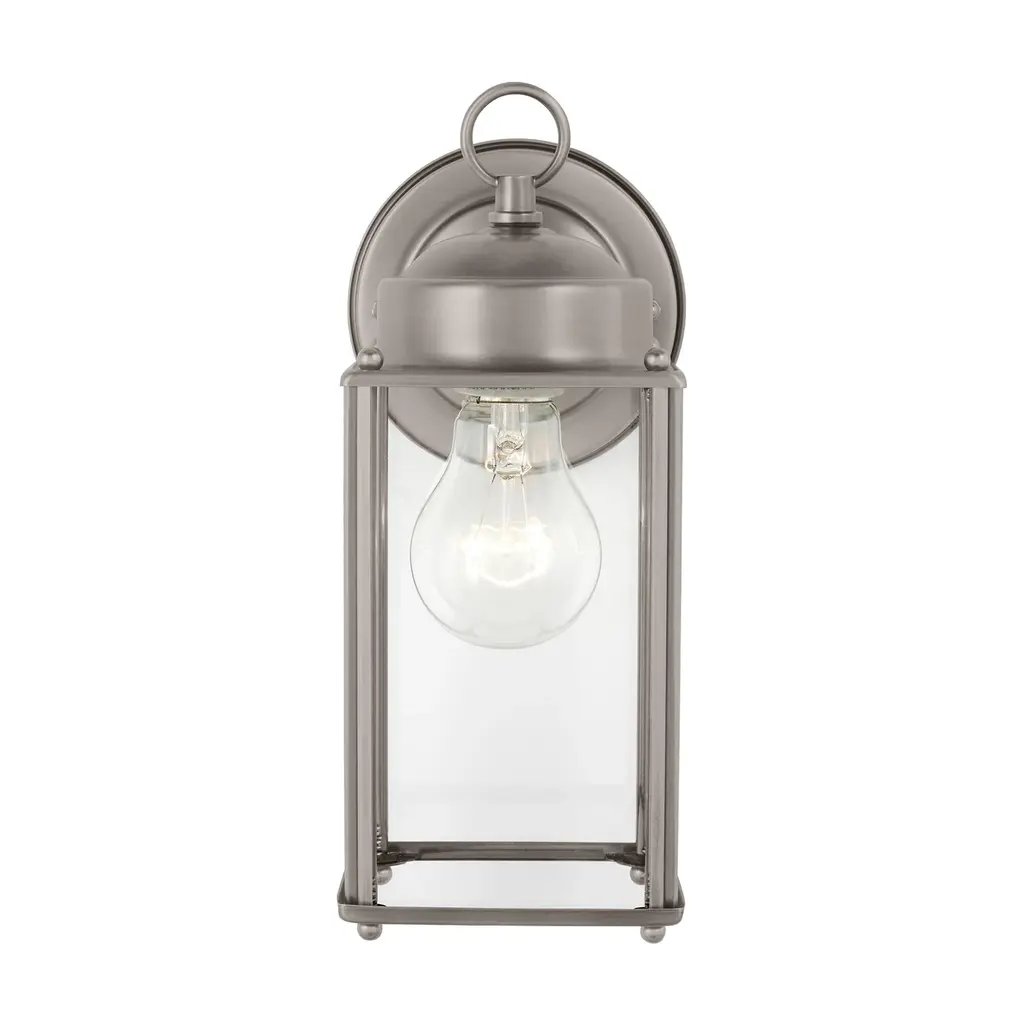 Welcome guests in sophisticated style with the New Castle Outdoor Wall Light by Generation Lighting. Crafted from sturdy metal and complemented with your choice of Satin Etched or Clear glass accents, this wall light offers timeless transitional design that blends seamlessly with any outdoor decor. Highlights