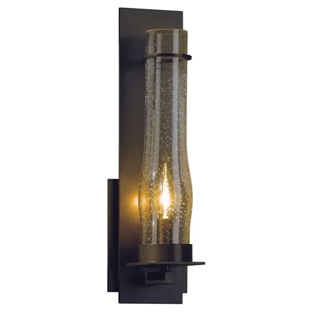 The Hubbardton Forge New Town Wall Sconce with Seedy Hurricane Clear Glass adds splendor to your decor with its magnetic formation while charming the onlookers. The New Town Wall Sconce with Seedy Hurricane Clear Glass features hand-blown Seedy Clear glass shade and hand-forged wrought iron body.