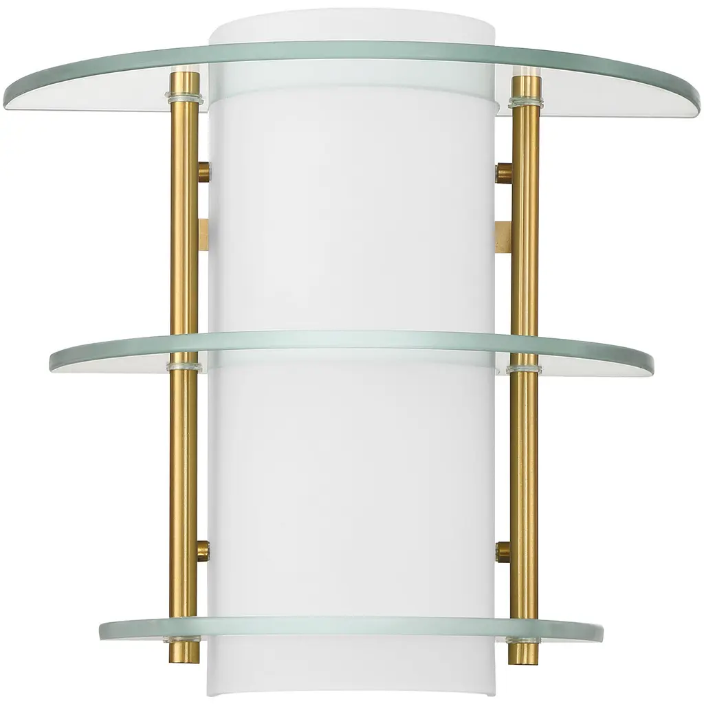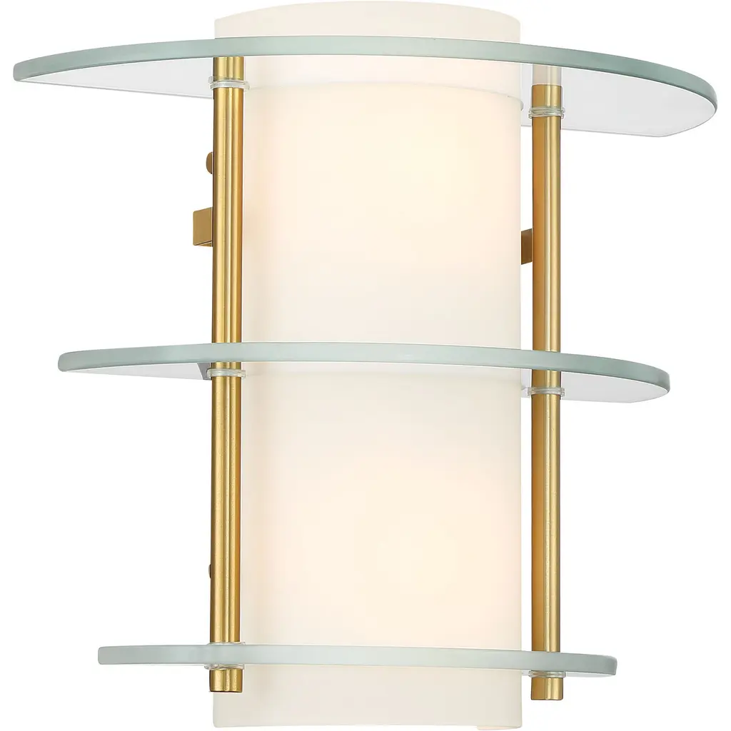 The Newell 2-light sconce from Savoy House is a standout example of Art Deco style. Three sleek discs of clear glass surround a core shade of opal glass to create a bright and intriguing glow. The Warm Brass finish is bright and chic. Newell is 12" in height, 10.25" in width and extends 6.25" from the wall. Uses two candelabra size bulbs of up to 60 watts per bulb. Bulbs not included. This sconce is damp area rated.