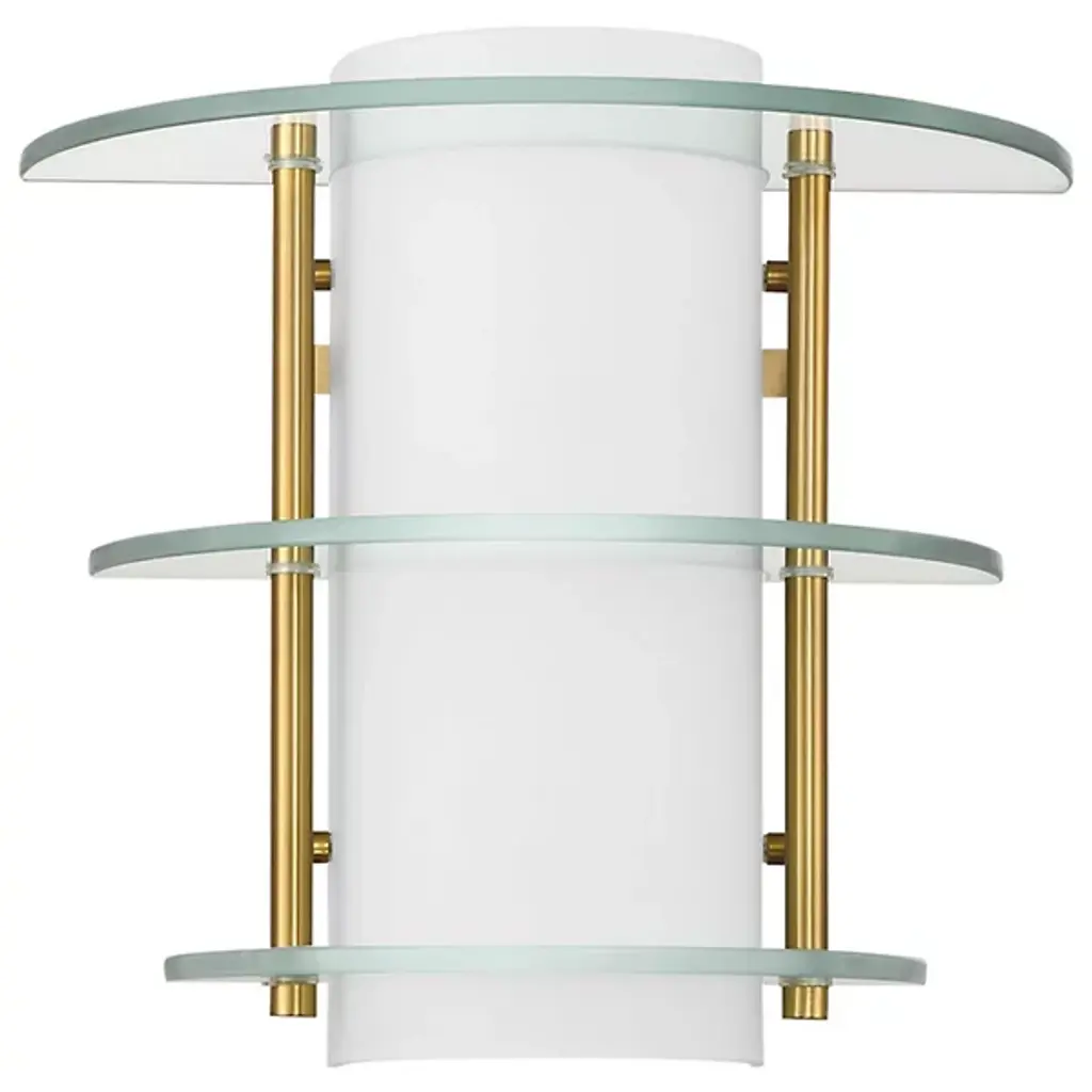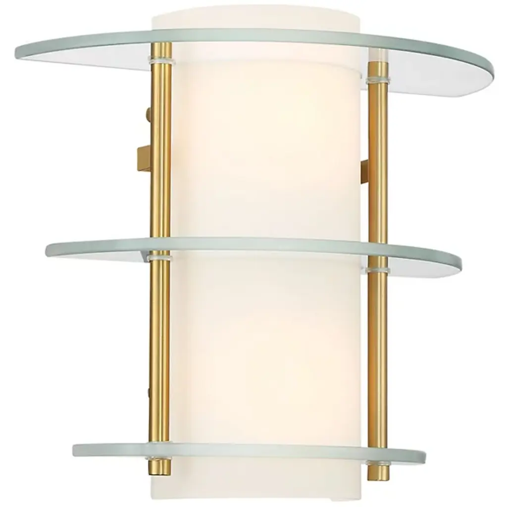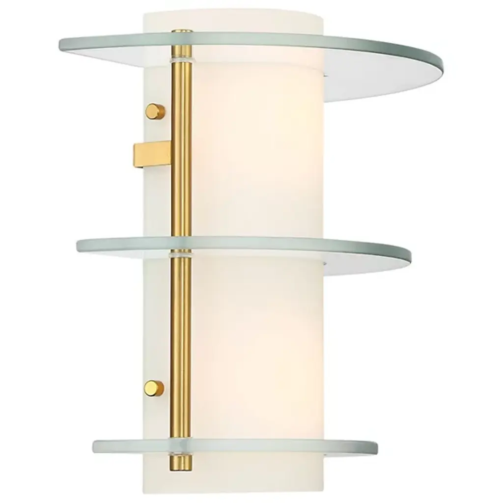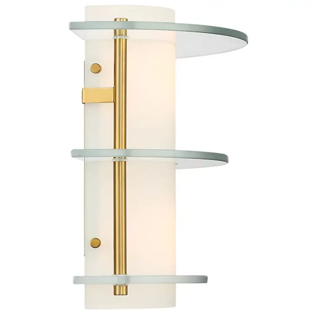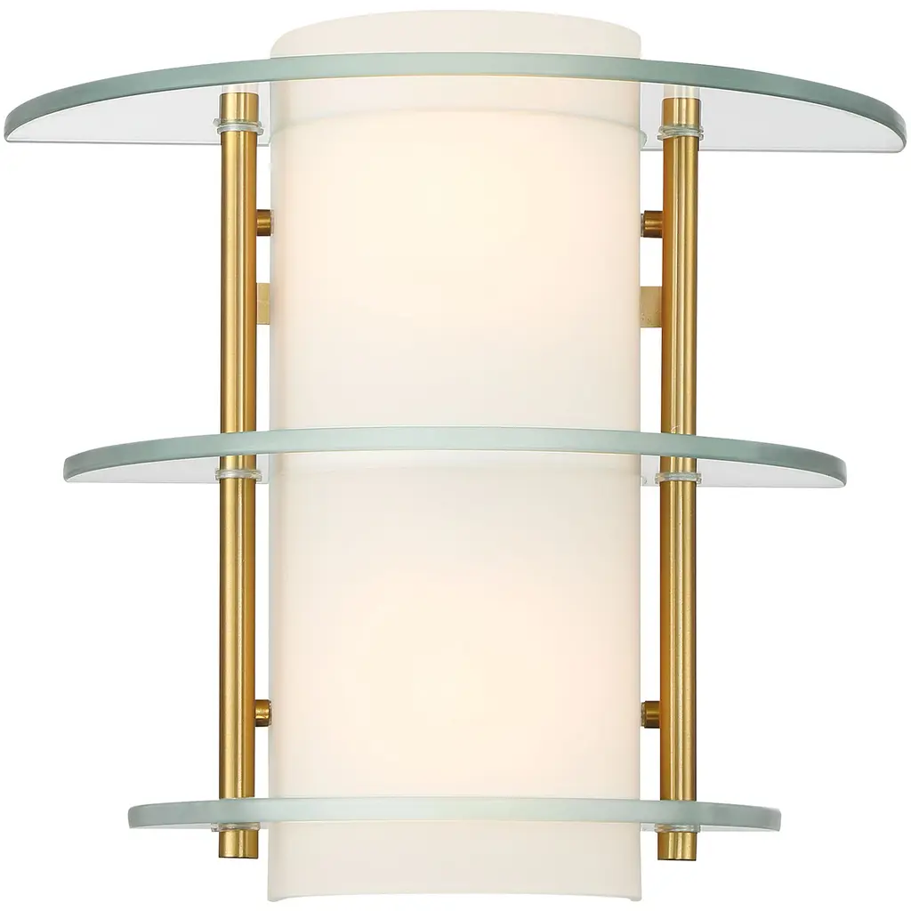 The Newell Sconce from Savoy House features a layered Art Deco design. Three clear glass discs encircle an opal glass diffuser suspended from a low-profile metal frame, casting a radiant glow once lit. The framework’s Warm Brass finish also adds a touch of visual contrast that is pleasing to the eye. This retro-inspired design is a refined, vintage addition to any modern interior, whether installed alone in a key area or along walls in a group.