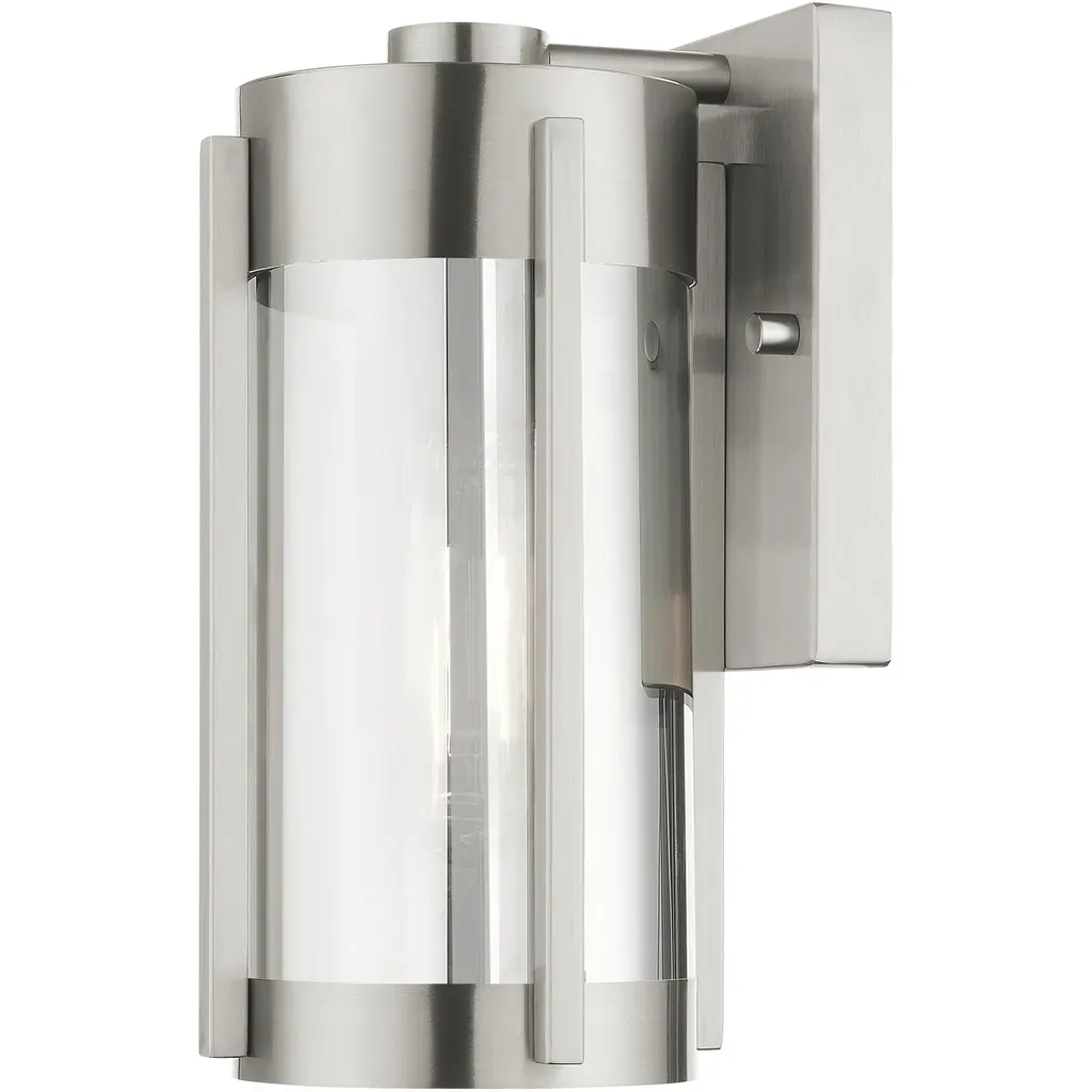 The Nicholas Outdoor Wall Sconce by Alder & Ore has a clean, contemporary look that embraces the classic build of lantern-style fixtures. Attached to the wall with a boldly finished, rectangular backplate, a cylindrical glass shade is encased in a metal body that features clean lines and curves, creating evenly divided sections for light to filter through softly. A stacked top adds a tailored touch to the look of this wall sconce, and it handsomely complements a variety of architectural styles to create a welcoming environment wherever it shines.