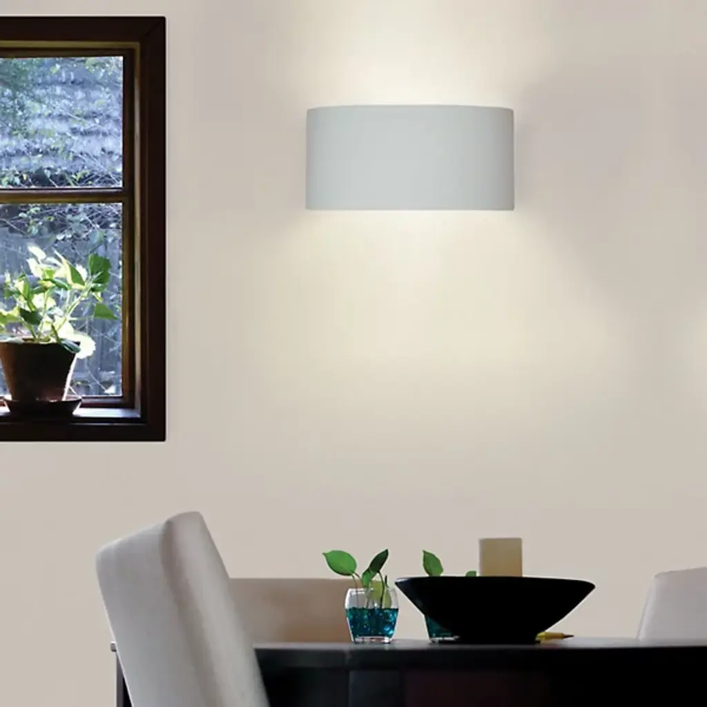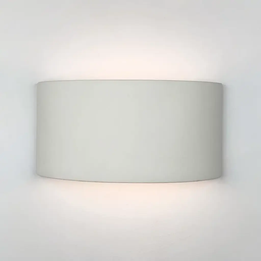 Graceful curves that glam up your wall. The Nicosia Wall Sconce by A19 is crafted from ceramic and features a smooth, flowing profile. The horizontal band arches over a lamp that produces a wash of light against the wall in both upward and downward directions. The shade can be painted to match your room setting. This handcrafted design looks beautiful in hallways, living spaces, and bedrooms.