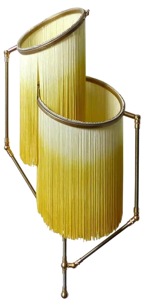 Blue Charme sconce lamp, Sander BottingaDimensions: 50 x W 38 x D 27 cm.Hand-sculpted in brass, leather, wood and dip dyed colored Fringes in viscose.The movable arms makes it possible to move the circles with fringes in differed positions.So you can change the light object in multiple models.The brass lamp base, lamp holder and dimmer are inlaid with leather.The design artwork is meticulously handcrafted in a limited series, sometimes in corporations with small artisan workshops.