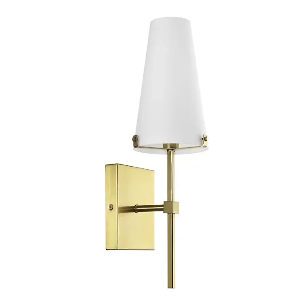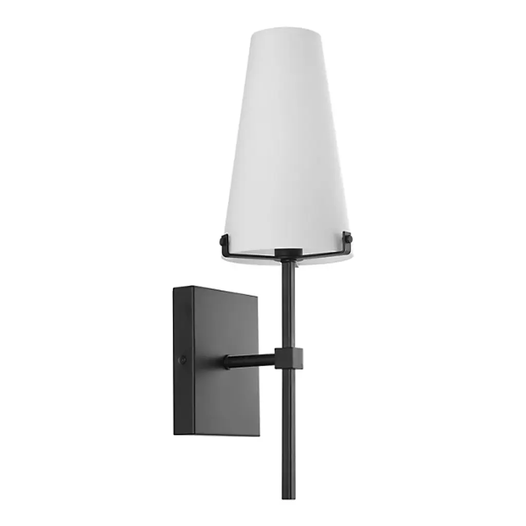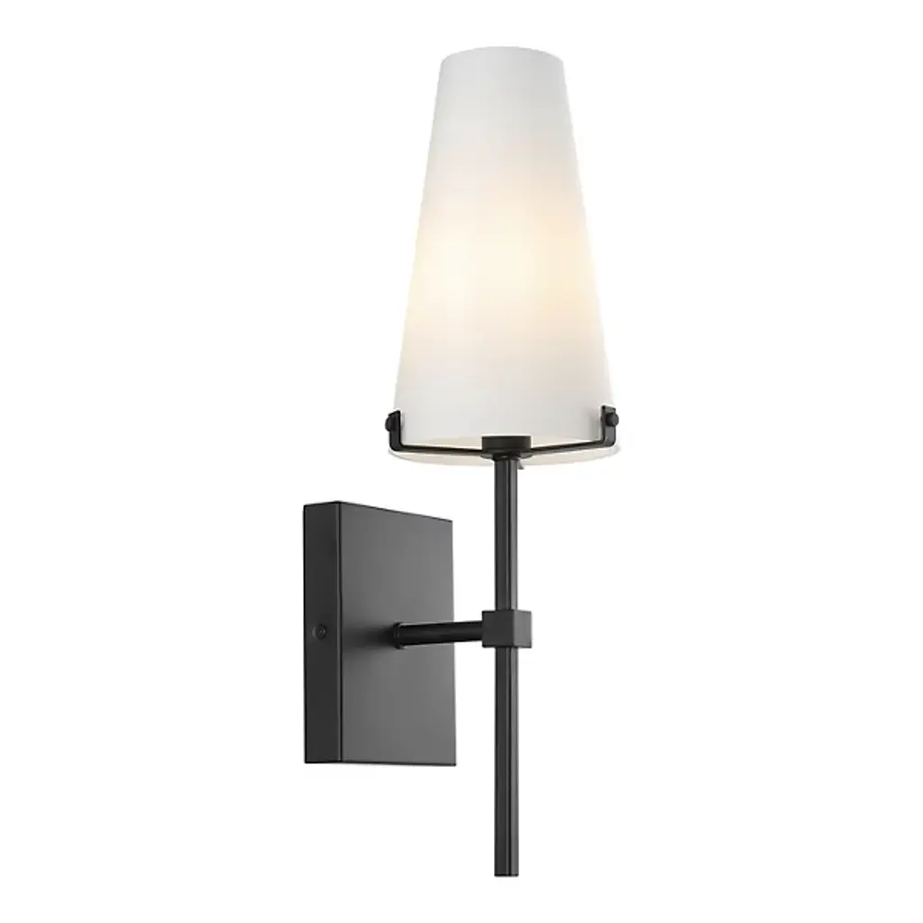 The Noa Wall Sconce from Alder & Ore presents intriguing transitional creativity, providing elegance to various decor styles. A slim metallic arm and rectangular wall plate support the tapered glass shade, contrasting its black powder-coated iron finish. The gauzy shade offers a warm, filtered glow, adding soft texture to wall spaces. Great for transitional or modern interiors, this sconce combines simple structure with classic elements, enhancing the ambiance of any room with its refined charm.