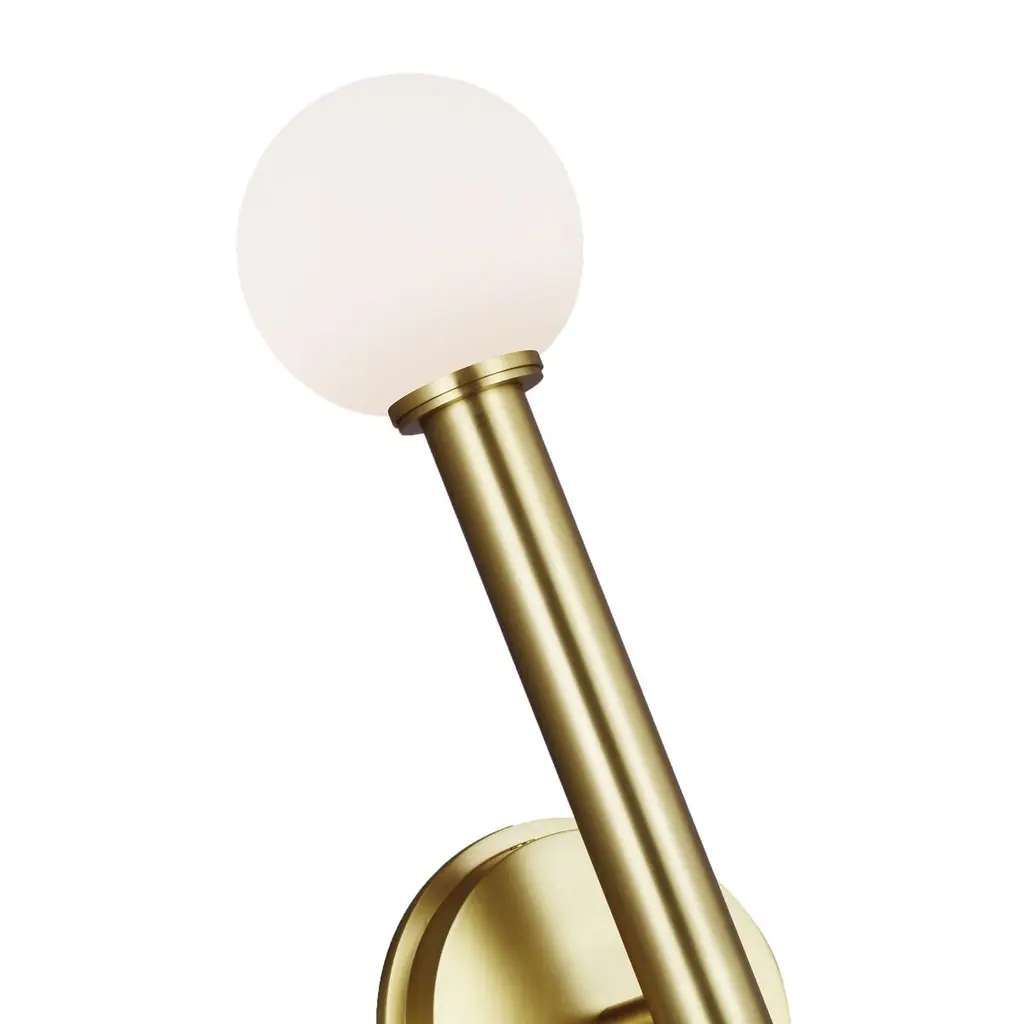 This two-arm sconce is a sleek study of contrasts: straight lines and graceful circles, opalescent mouth-blown milk glass and steel given a gleaming brass finish. Because it's safety listed for damp locations, you can use it in a bathroom as well as in an entry, a hallway, or just about anywhere else in your home.