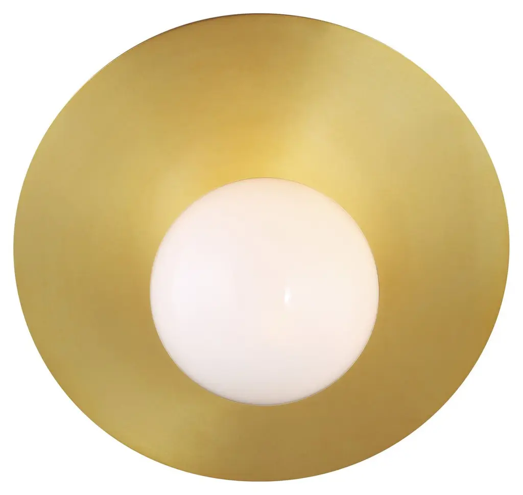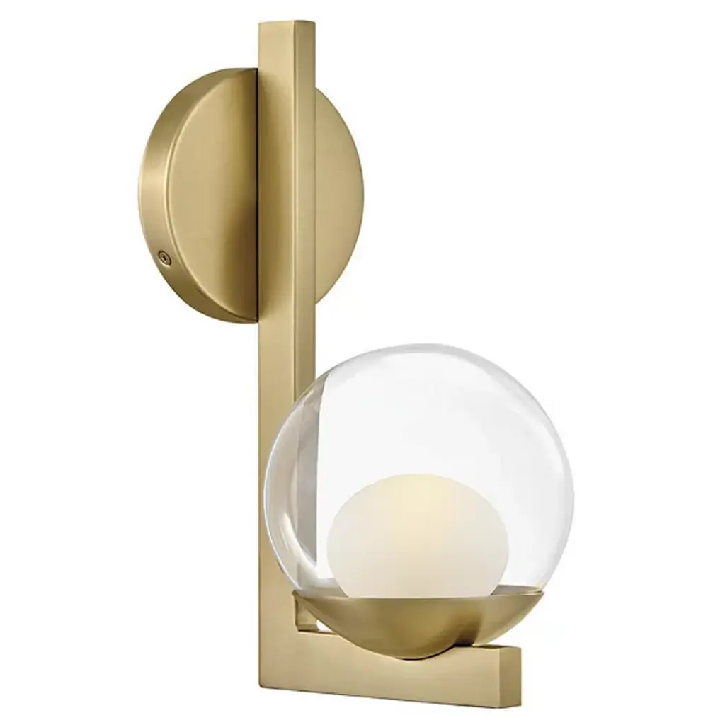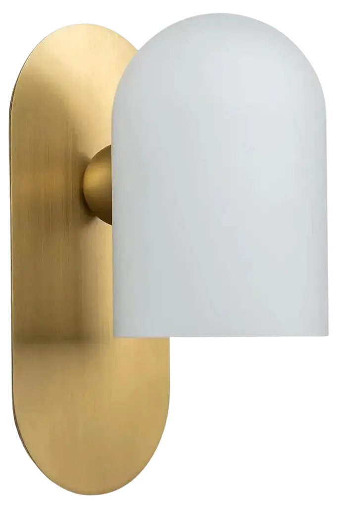 This sconce is a sleek study of contrasts: straight lines and graceful circles, opalescent mouth-blown milk glass and steel given a gleaming brass finish. Its adjustable arm allows you to direct light wherever you need it, making this ideal for beside a bed. And because it's safety listed for damp locations, you can use it in a bathroom.