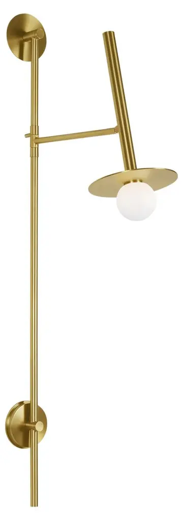 This sconce is a sleek study of contrasts: straight lines and graceful circles, opalescent mouth-blown milk glass and steel given a gleaming brass finish. Its adjustable arm allows you to direct light wherever you need it, making this ideal for beside a bed. And because it's safety listed for damp locations, you can use it in a bathroom.