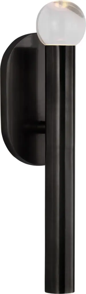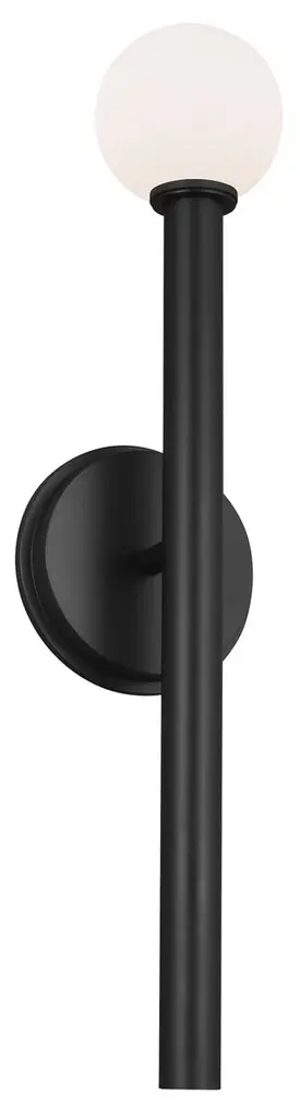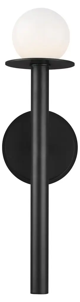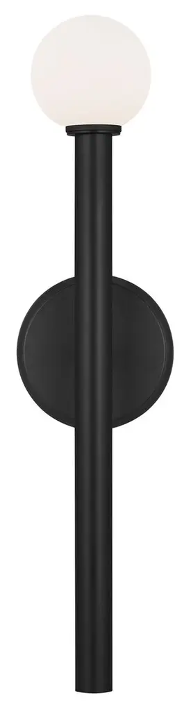 This sconce is a sleek study of contrasts: straight lines and graceful circles, opalescent mouth-blown milk glass and steel given a rich black finish. Because it's safety listed for damp locations, you can use it in a bathroom as well as in an entry, a hallway, or just about anywhere else in your home.
