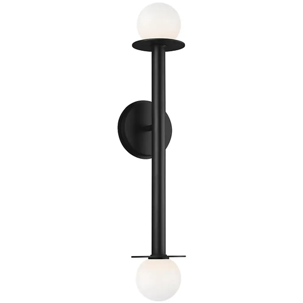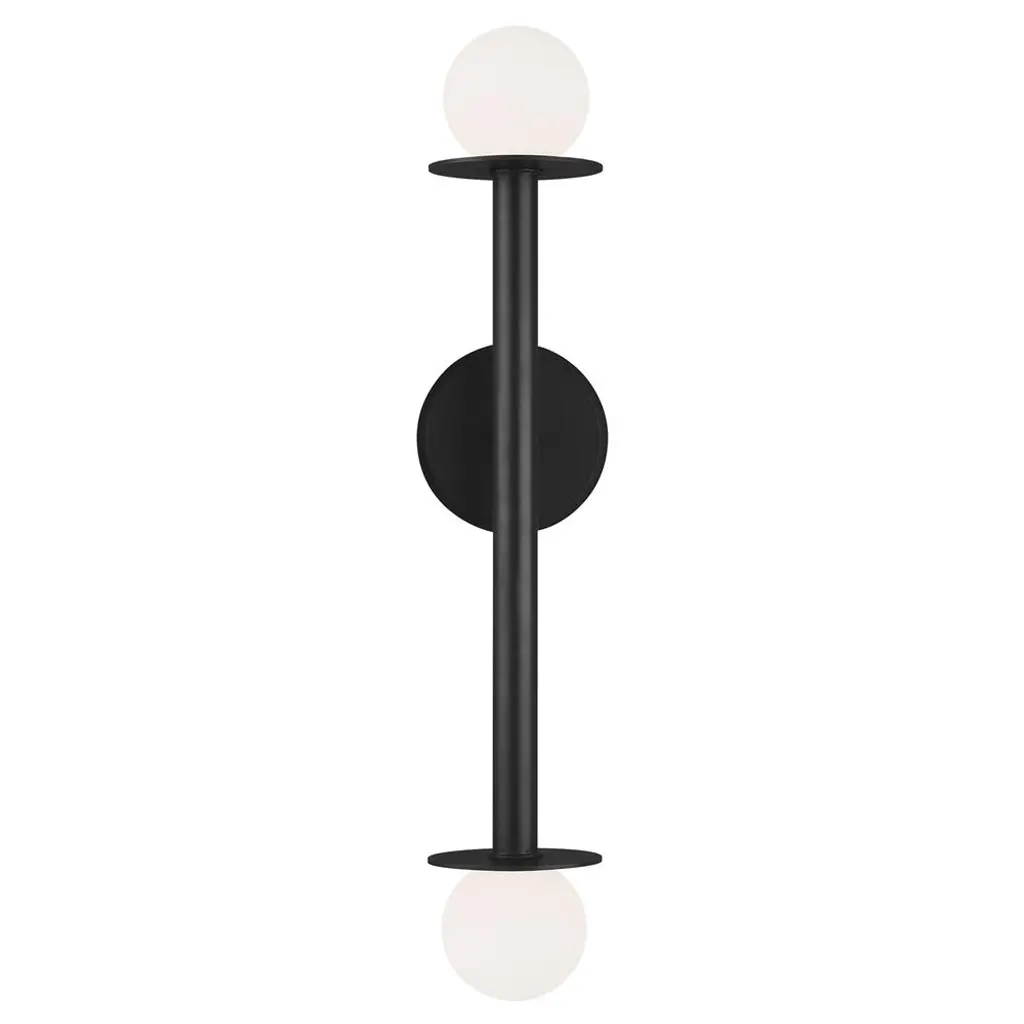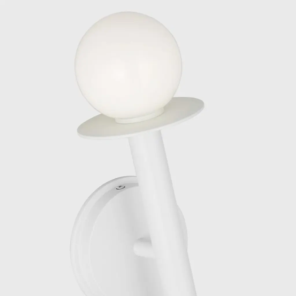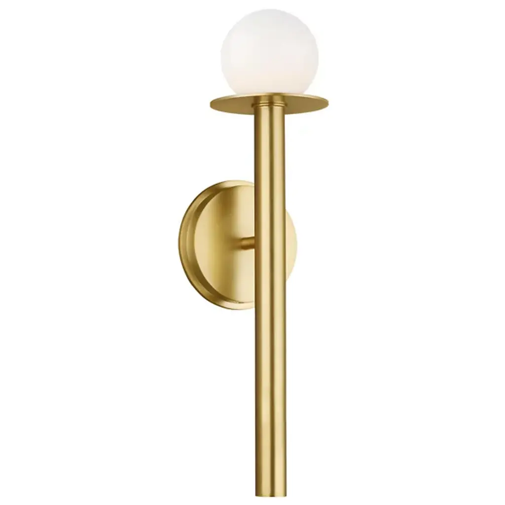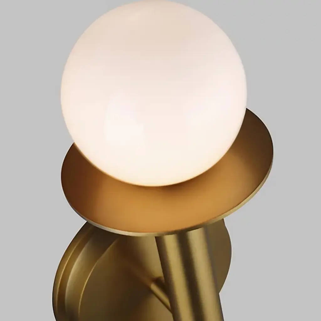 Modern, Minimal and Bold. The Nodes 1 Light Wall Sconce by Visual Comfort Studio, formerly known as Kelly by Kelly Wearstler, combines a distinctive form into a refined fixture. A beautiful metallic finish highlights a circular cast canopy and bold arm that are topped with a sleek disk and soft Milk Glass Globe. The minimally inspired silhouette can be further showcased by removing the disk that accents the glass globe. Refined and strong, this sconce is a complement to bathrooms, hallways, and entryways.