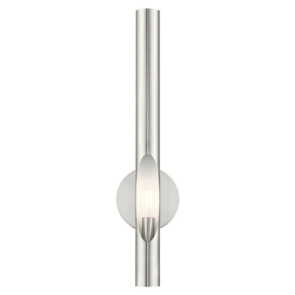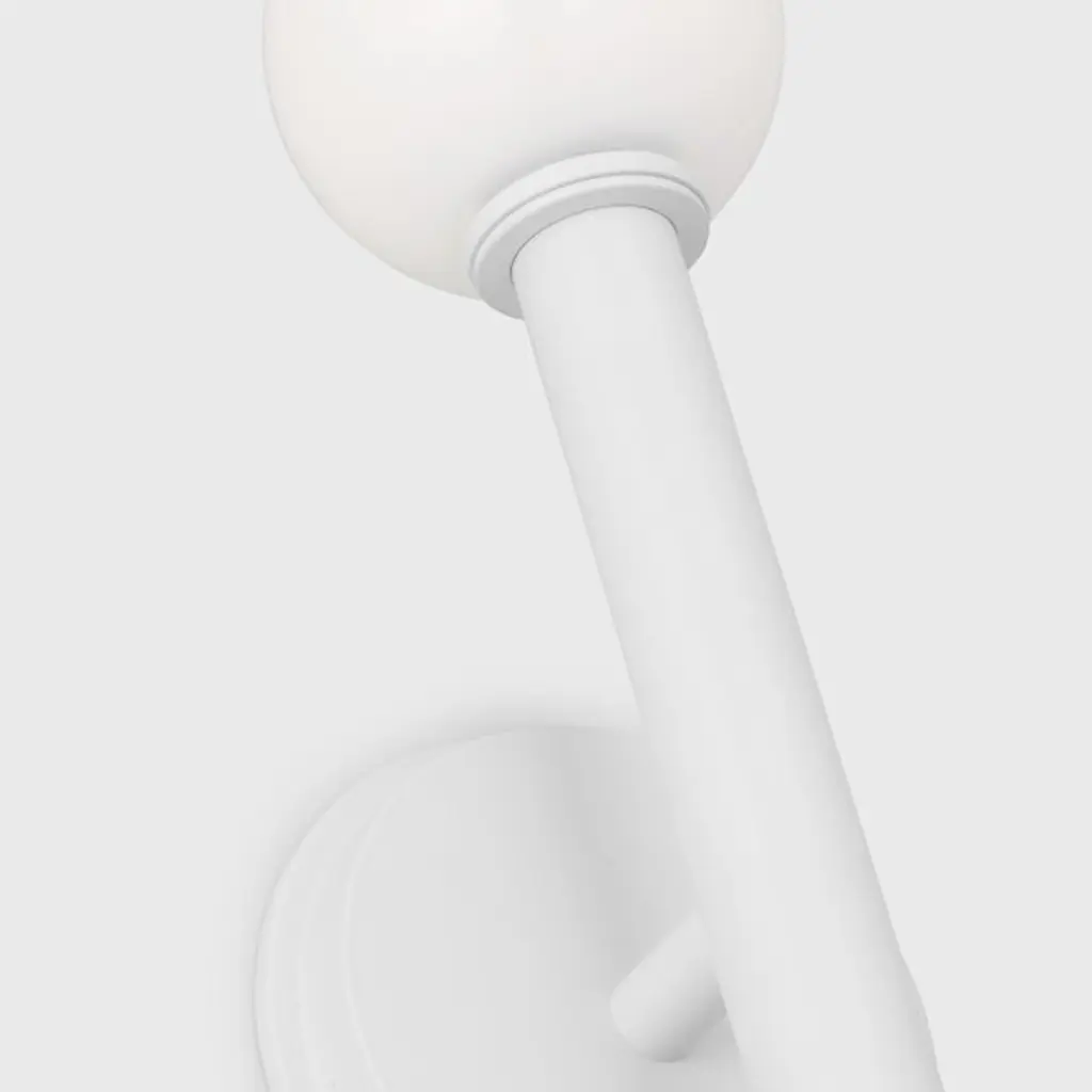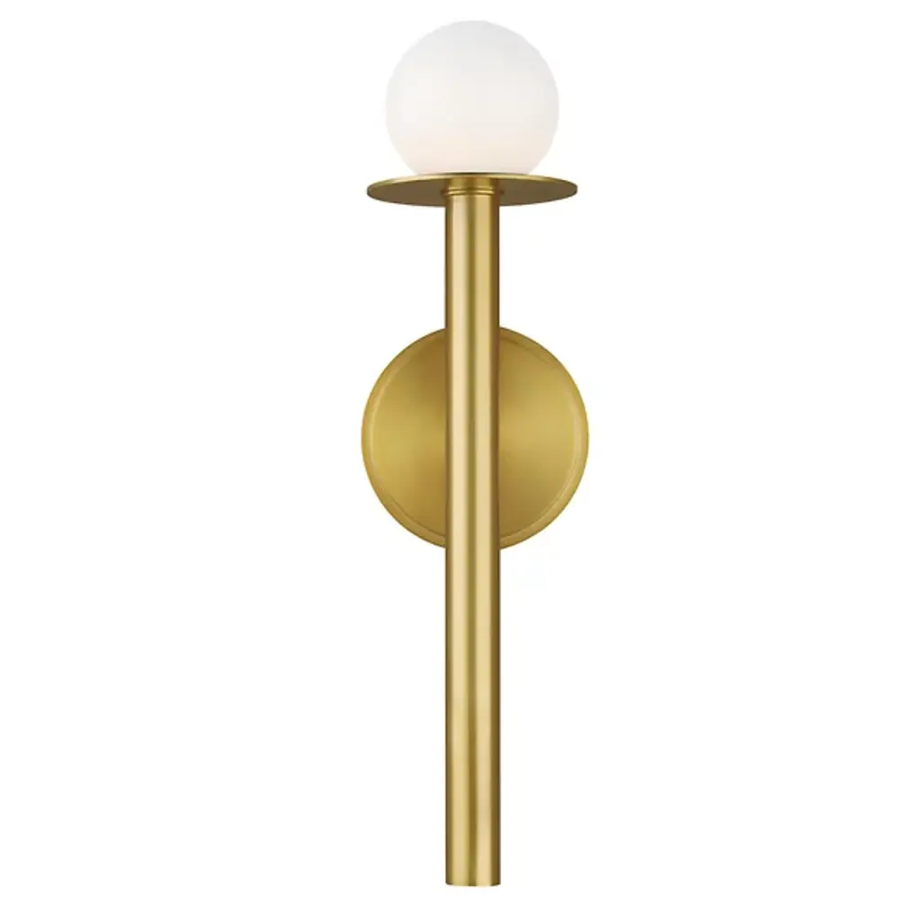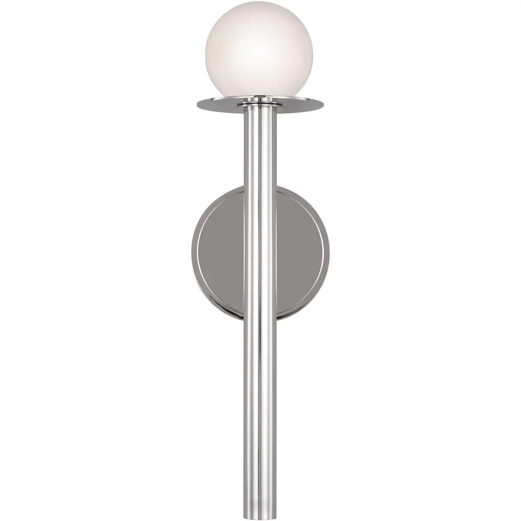 Modern, Minimal and Bold. The Nodes 1 Light Wall Sconce by Visual Comfort Studio, formerly known as Kelly by Kelly Wearstler, combines a distinctive form into a refined fixture. A beautiful metallic finish highlights a circular cast canopy and bold arm that are topped with a sleek disk and soft Milk Glass Globe. The minimally inspired silhouette can be further showcased by removing the disk that accents the glass globe. Refined and strong, this sconce is a complement to bathrooms, hallways, and entryways.