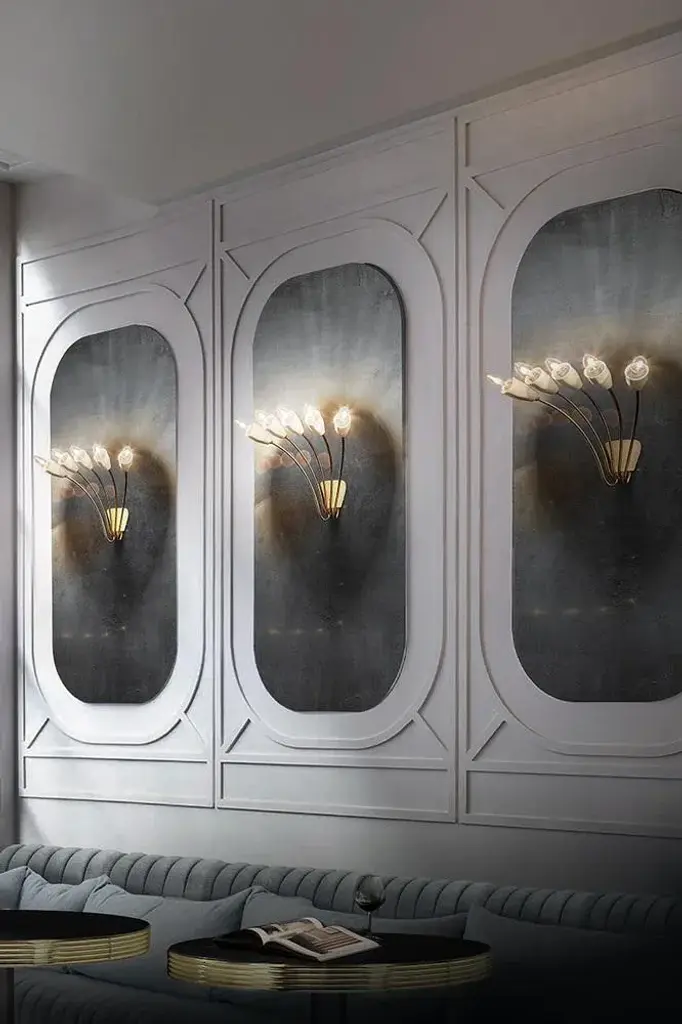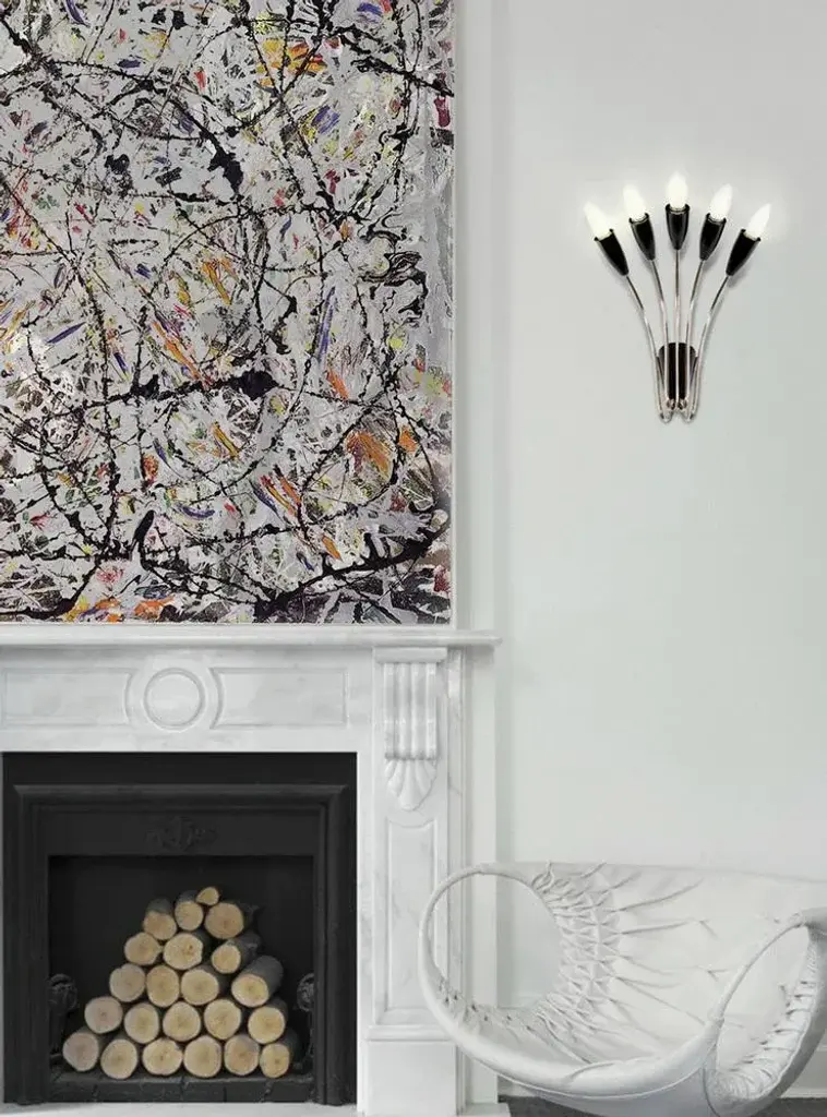 Due to its delicate and curved forms, Norah wall lamp has a vintage style that will transmit a sense of elegance and sophistication in every single space. This decorative wall light consists of five fixed arms made of brass with nickel plated and glossy black finishes. The wall lamp bulb holders are made in aluminum with a matte black finish. with five bulbs, this interior wall sconce includes E14 Bulbs. Up to 250V (Europe/UK Standard).