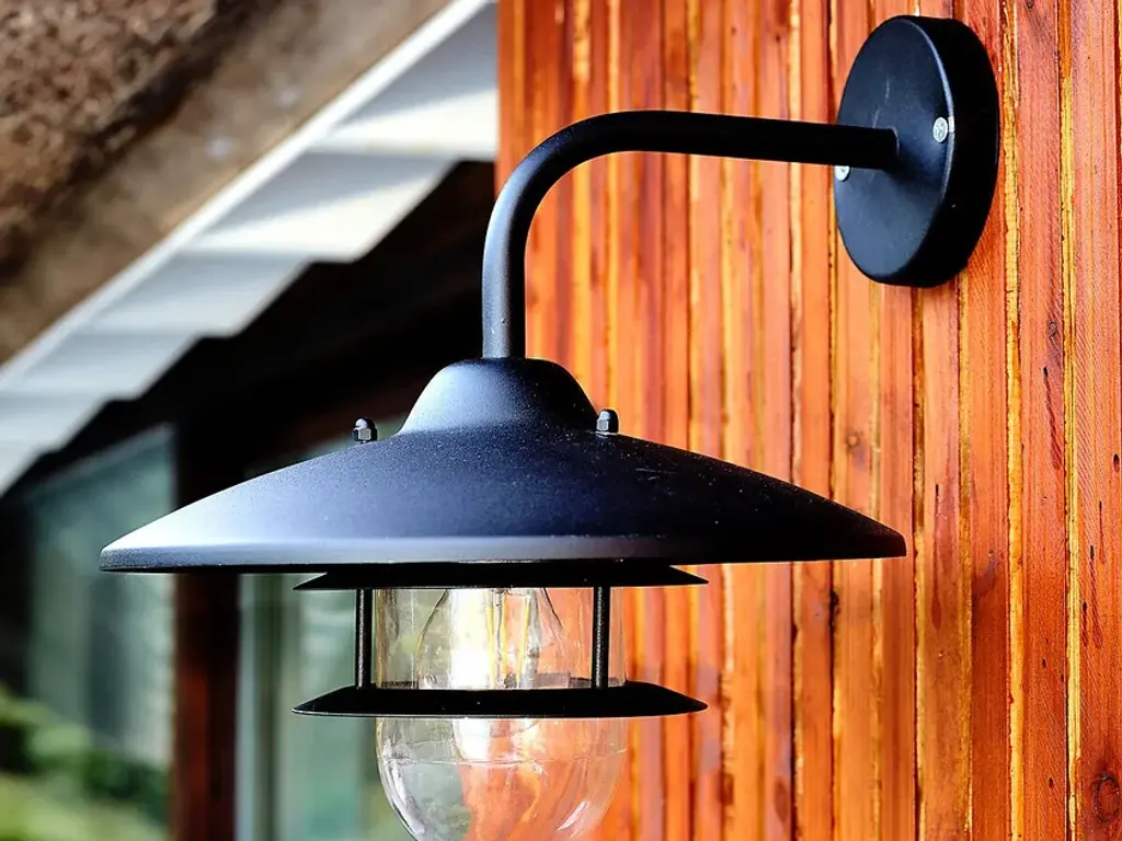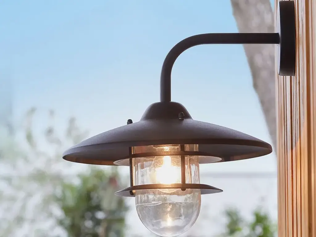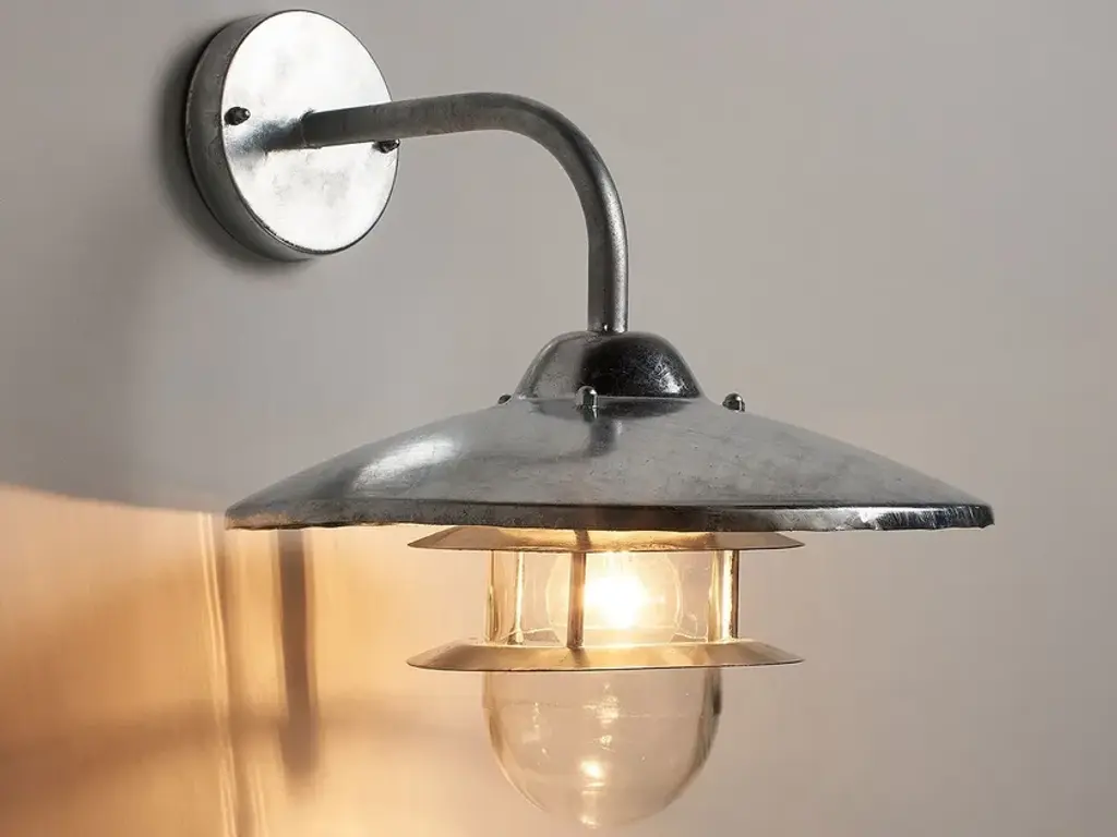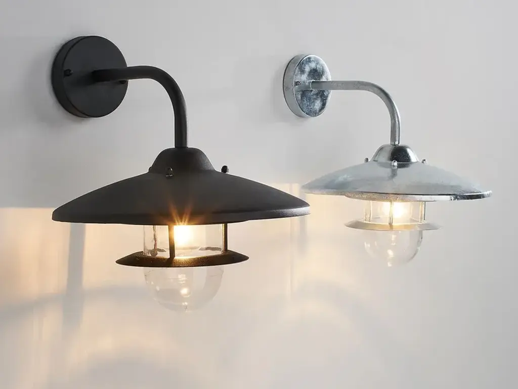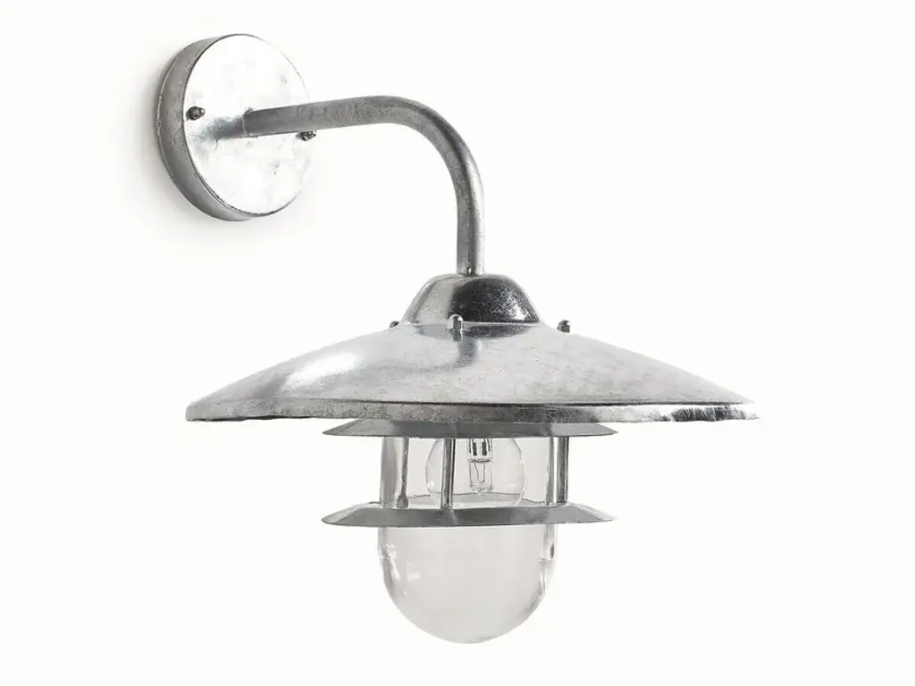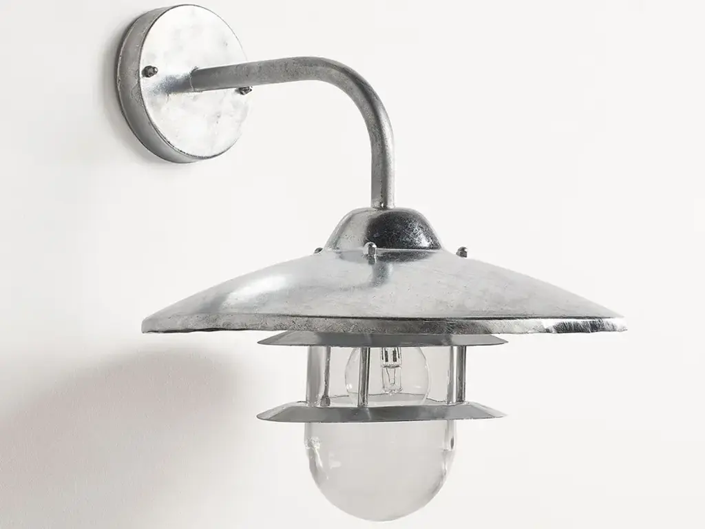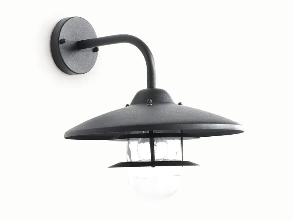 NORIA outdoor wall lamp, for indoor or outdoor installation, designed to withstand the elements.Features:Metal with galvanised steel or black epoxy finishReflective lampshadeGlass diffuserIP44 degree of protection: guarantees against water splashes from all directionsE27 lamp holder, for max. 60W bulb (not included)