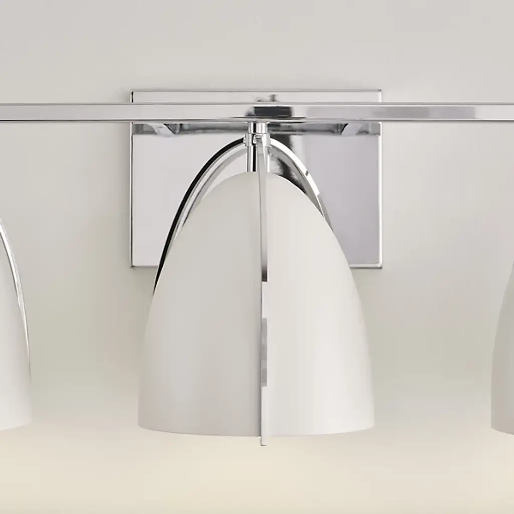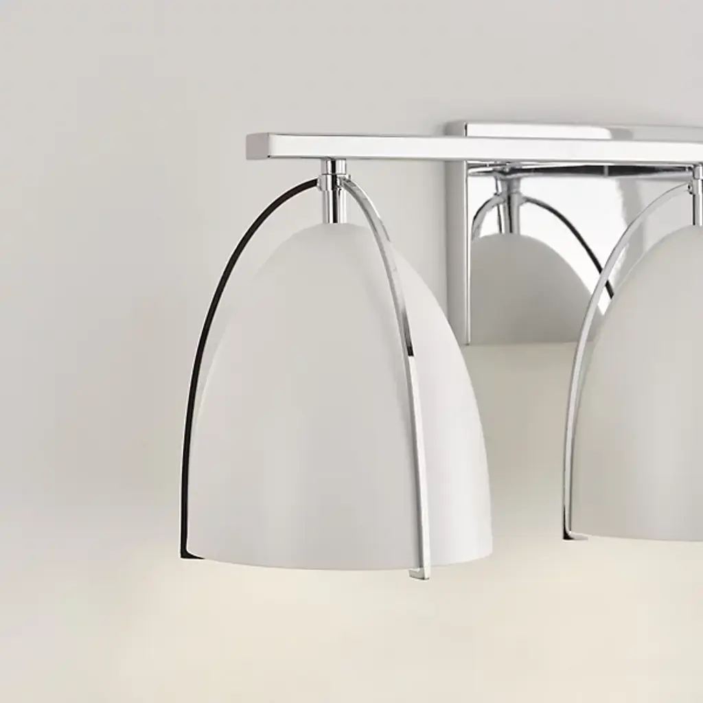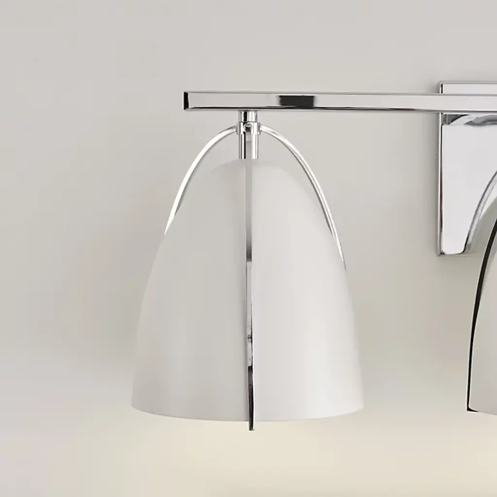Quiet opulence. Give your modern mirror a high-style companion in the form of the Norman Bath Bar from Visual Comfort Studio, formerly known as Sea Gull Lighting, The bath bar’s helping of shapes makes this piece fit right over a rounded or rectilinear mirror. It makes a visual impression with a sleek backplate and crossbar. Curved contours stream down to create a delicate silhouette against the smooth surfaces of the steel shades. The bullet shades surround the bulbs to protect you from glare. The bulb’s light streams out the base of the shade as a clean fanned-out down glow.